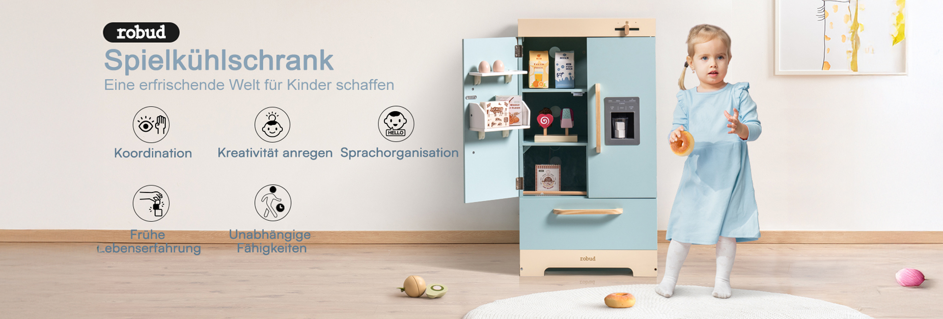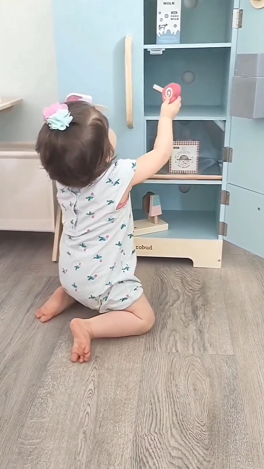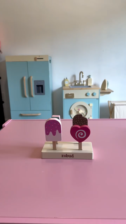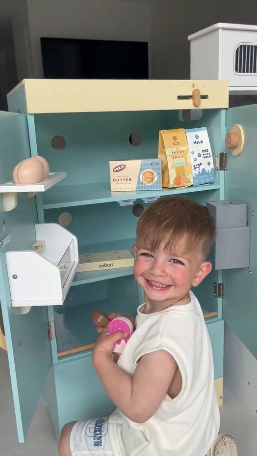 GESTALTETES DESIGN: Der ROBUD Spielzeugkühlschrank ist mit akribischer Sorgfalt und grenzenloser Kreativität gestaltet. Jedes Detail, von seinem niedlichen Aussehen bis zu seinen realistischen Funktionen, wurde sorgfältig geformt, um ein Gefühl von Stil und Wärme für Kinder während des Spielens zu wecken.