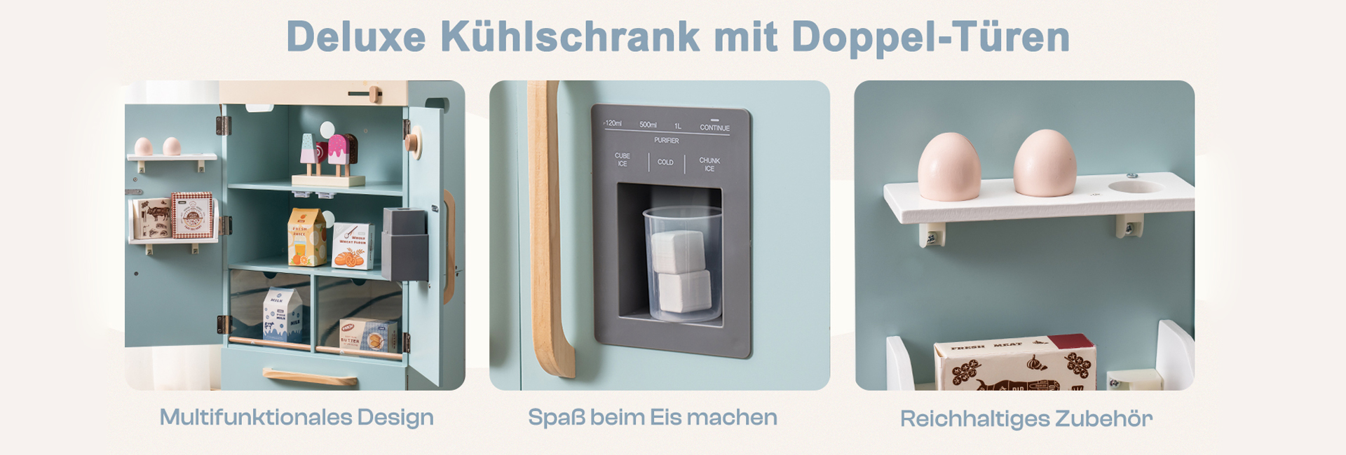 VIELFÄLTIGE FUNKTIONEN: Der Kühlschrank ist ein niedliches Spielzeug mit verschiedenen Funktionen. Er verfügt über eine Eismaschine, die es Kindern ermöglicht, das Herstellen von Eiswürfeln zu simulieren und ihre praktischen Fähigkeiten zu fördern. Die Temperaturregelungsfunktion lehrt die kleinen Besitzer, Lebensmittel richtig zu lagern. Die Kühl- und Gefrierfächer bieten zusätzlichen Stauraum, damit Kinder kleine Spielzeuge oder Snacks organisieren können. Durch diese multifunktionalen Designs wollen wir ein realistischeres und kreativeres Kühlschrankspielzeugerlebnis für Kinder schaffen.