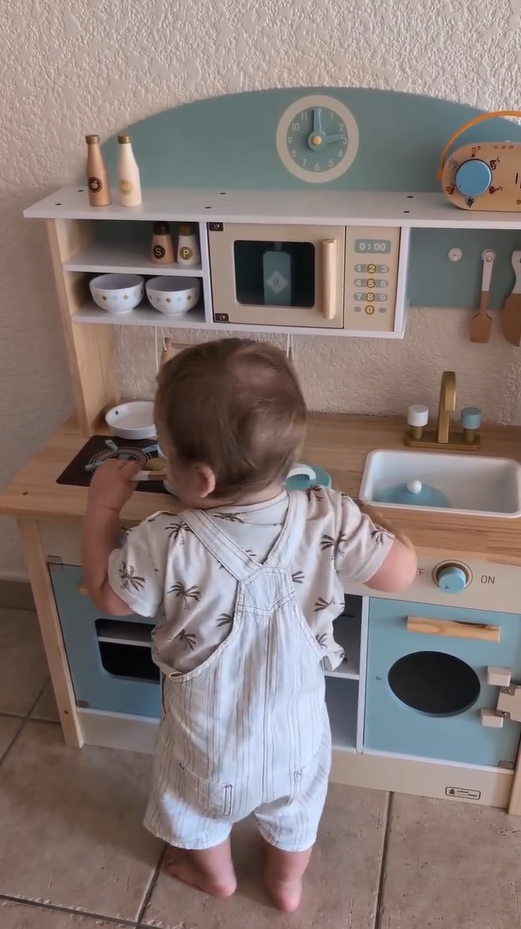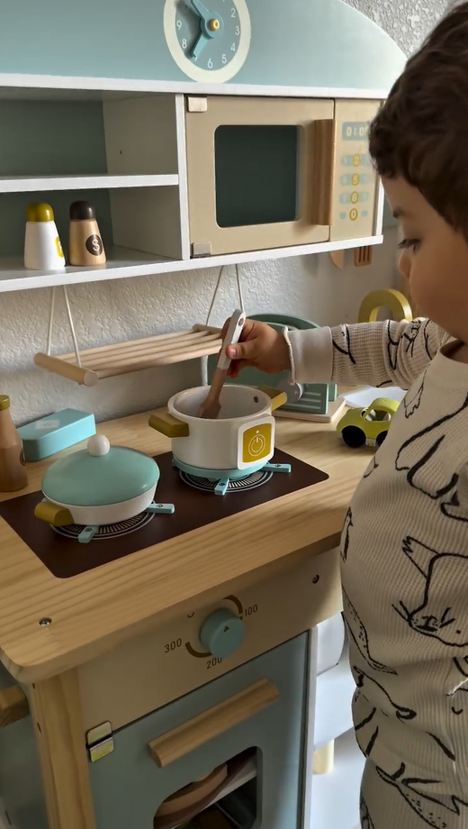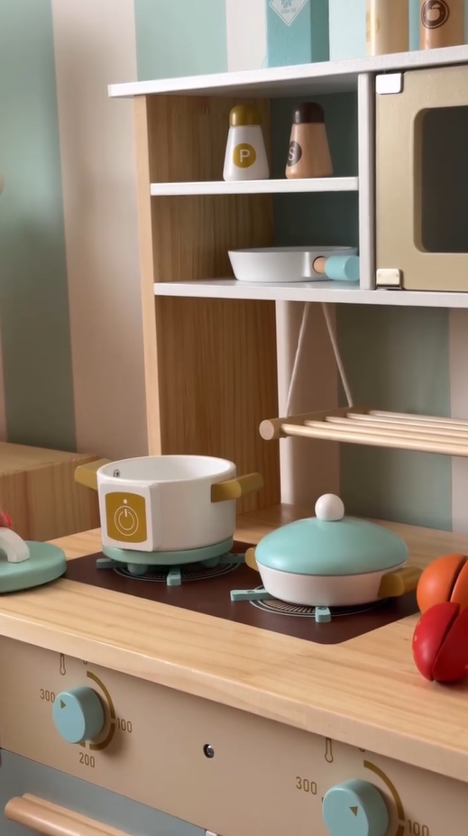 Sichere und hochwertige Materialien: Hergestellt aus hochwertigem Holz und mit ungiftiger Farbe beschichtet, gewährleistet dieses Küchen-Set Sicherheit und Langlebigkeit. Jedes Stück ist glatt poliert, um raue Kanten zu vermeiden, was es perfekt für kleine Hände macht. Eltern können beruhigt sein, dass ihre Kinder mit einem sicheren Spielzeug spielen.