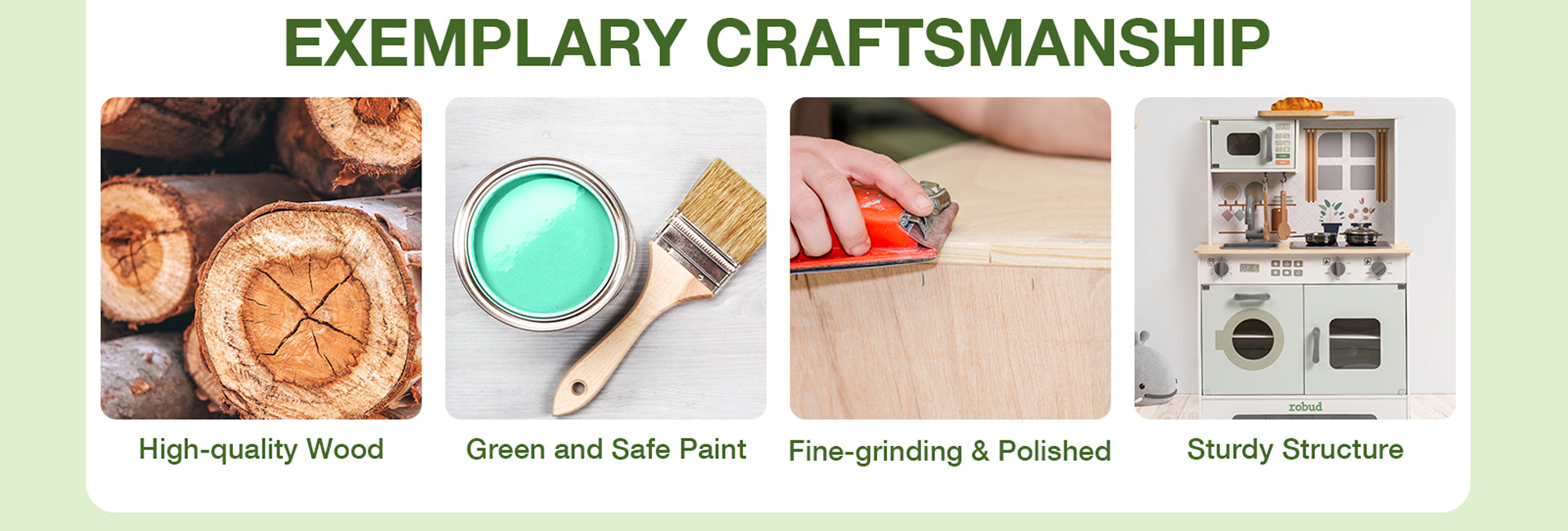 PREMIUM MATERIALIEN, QUALITÄT GARANTIERT: Die ROBUD Spielküche ist aus sorgfältig ausgewähltem, hochwertigem Holz gefertigt und mit sicherer, ungiftiger Farbe beschichtet. Diese Kombination sorgt nicht nur für eine robuste und langlebige Struktur, sondern schafft auch eine sichere und einladende Umgebung, in der Kinder ihre kulinarische Kreativität entfalten können.