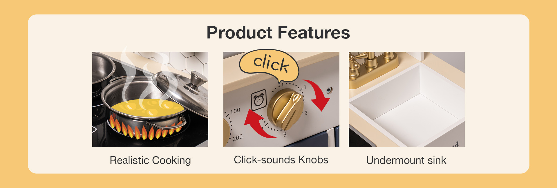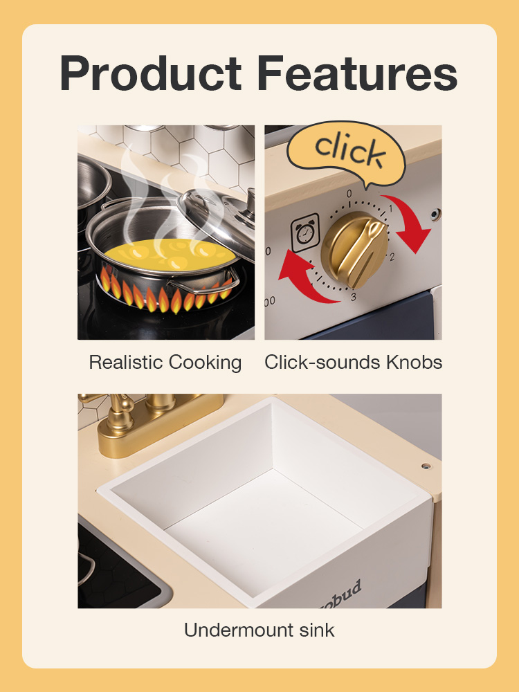 Spielerlebnis MAX: Alle Zubehörteile in dieser Spielküche erzeugen authentische Geräusche. Zum Beispiel macht der elektronische Herd nach dem Anzünden zischende und kochende Geräusche, und die Knöpfe lassen sich wie im echten Leben einstellen. Diese Funktionen verbessern das Spielerlebnis der Kinder, indem sie sich in einer lebensechten Küchenumgebung verlieren und den Spaß am Spiel erhöhen.