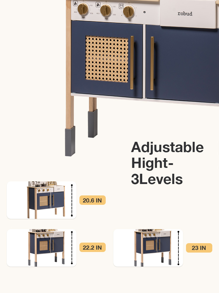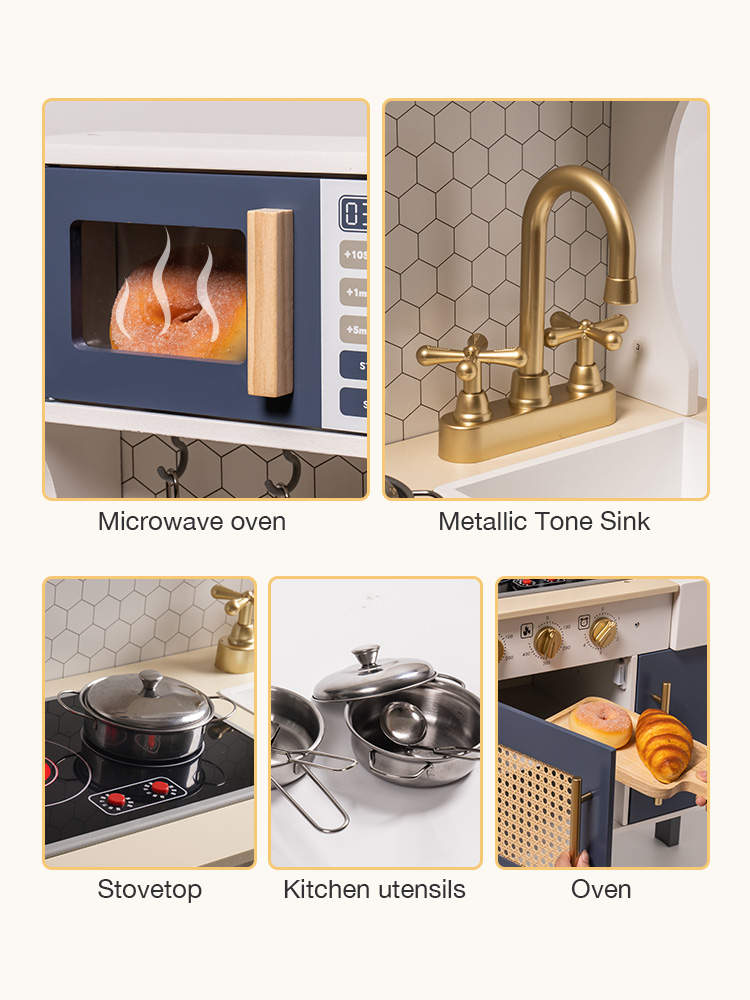 Modisch einzigartig: Inspiriert vom amerikanischen Retro-Stil, hebt sich diese Spielküche mit ihrem exquisiten goldenen Wasserhahn, den Korb-Schränken und dem eleganten Saphirblau hervor. Sie strahlt einen stilvollen Vintage-Charme aus und bietet nicht nur ein erfreuliches Spielerlebnis für Kinder, sondern verbessert auch Ihre Wohnkultur.