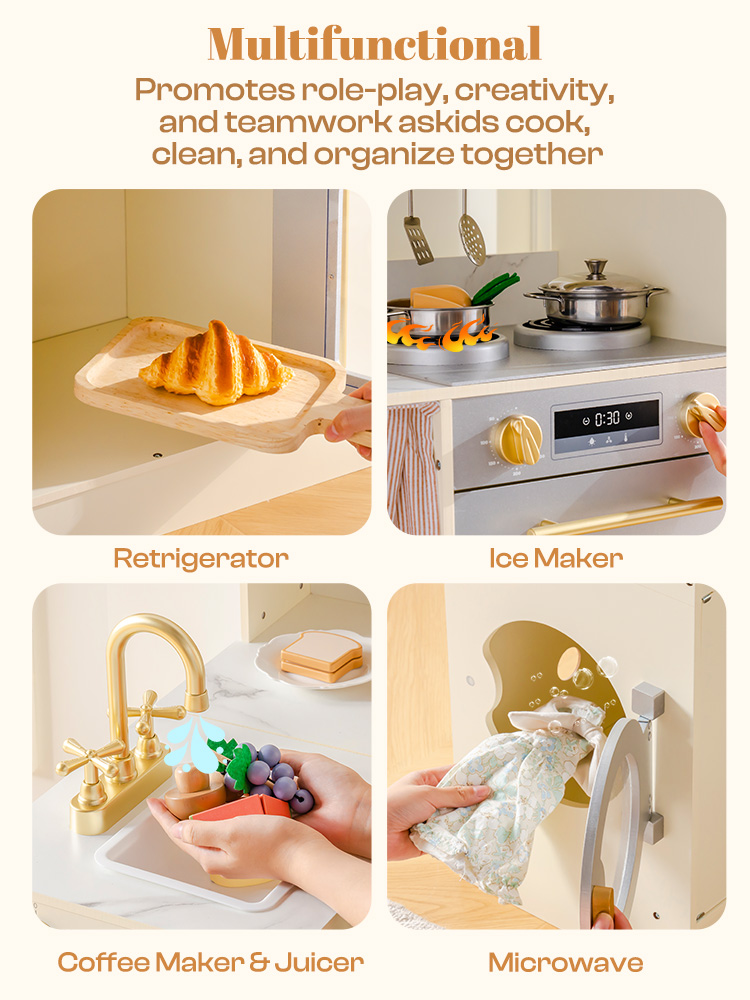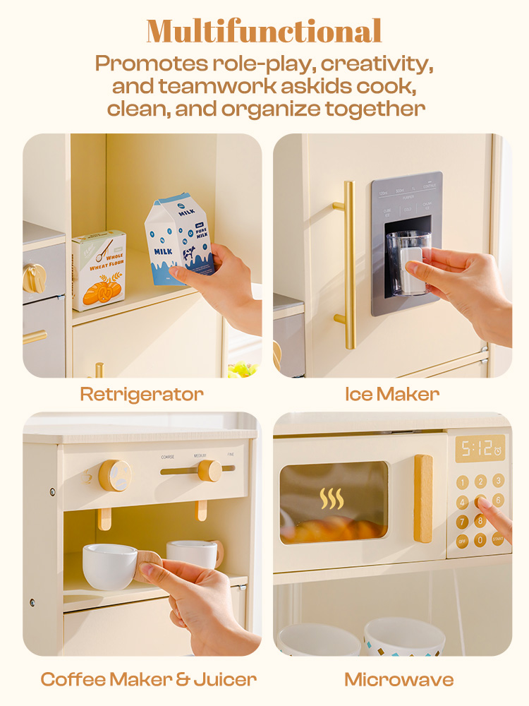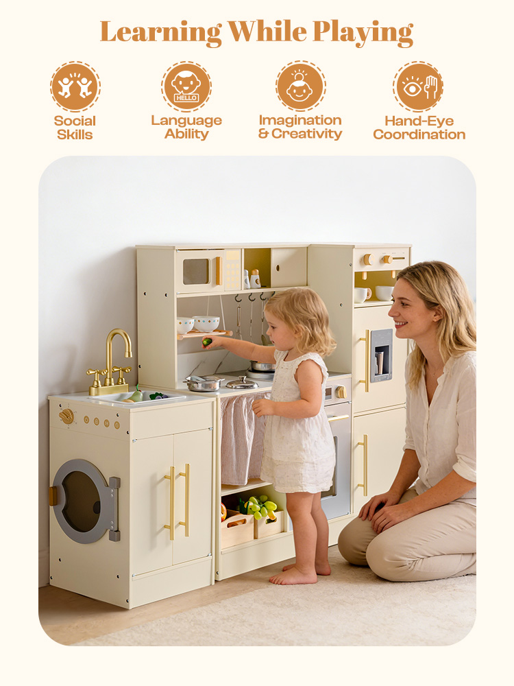 Dieses hölzerne Kinderküchenset besticht durch sein modulares Eckdesign, das sich flexibel in verschiedenen Anordnungen aufbauen lässt – ideal für kleine Ecken oder offene Spielbereiche. Es beinhaltet einen Kühlschrank, einen Backofen, Schränke und eine Spielzeug-Waschküche. Kinder können kochen, Zutaten vorbereiten, Wäsche waschen und vieles mehr – alle Details (wie Schranktüren und Griffe) sind unglaublich realistisch gestaltet und regen die Fantasie von Jungen und Mädchen gleichermaßen an. So bietet das Set unzählige Möglichkeiten für fantasievolles Rollenspiel. Die Spielküche ist ideal für Kinder ab 3 Jahren und verwandelt jeden Raum in eine realistische Spielküche, die sich harmonisch in die Einrichtung einfügt und die Spielfläche im Kinderzimmer optimal nutzt.