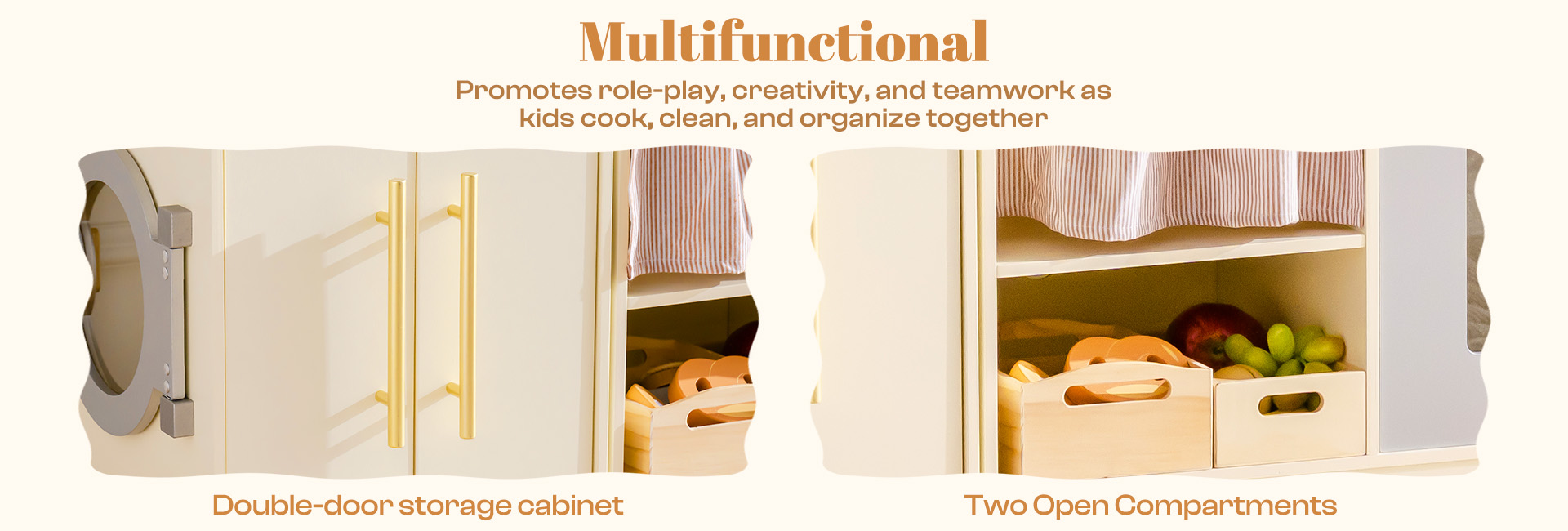 • KINDERFREUNDLICHES DESIGN: Die Spielküche besteht aus robustem Holz und wurde poliert. Ihre Oberfläche ist glatt und frei von Graten. Die abgerundeten Kanten, die leicht zu greifenden Griffe und die bruchsicheren Komponenten sorgen für eine lange Lebensdauer – was sie besonders geeignet für Kinder über 3 Jahre macht. Das neutrale Cremefarbschema sorgt für ein modisches Erscheinungsbild in jedem Spielbereich.
