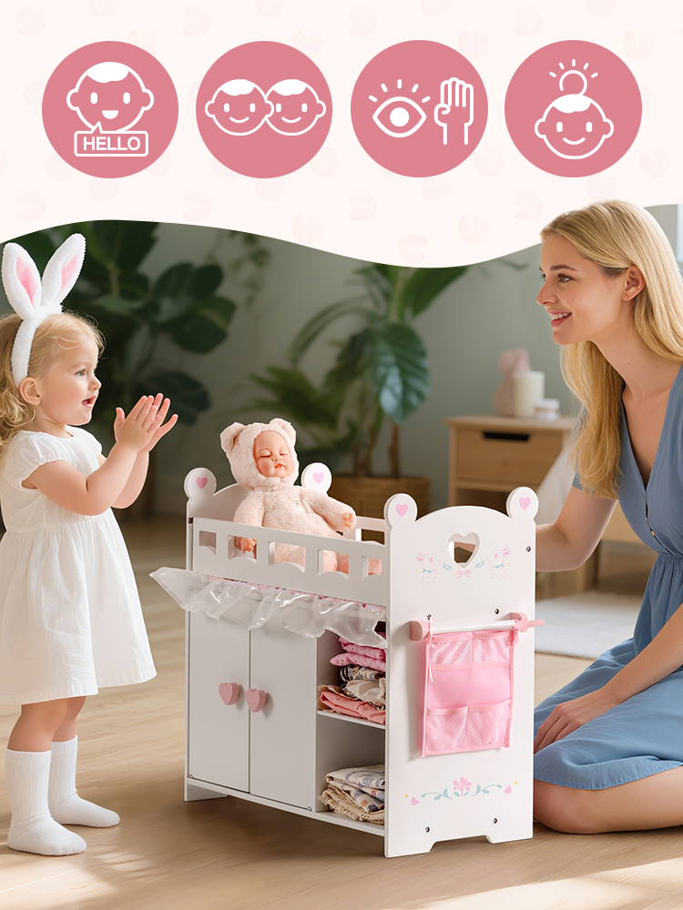 【Vielseitige Spielmöglichkeiten】Von klassischen Holzspielzeugen bis hin zu realistischen Rollenspielsets inspirieren die Puppenbettprodukte die Vorstellungskraft und Neugier der Kinder durch bildschirmfreies, unbegrenztes Spielen! Gleichzeitig werden diese Rollenspiele, die das echte Leben simulieren, Ihrem Kind helfen, Sprachfähigkeiten und Koordination zu verbessern.