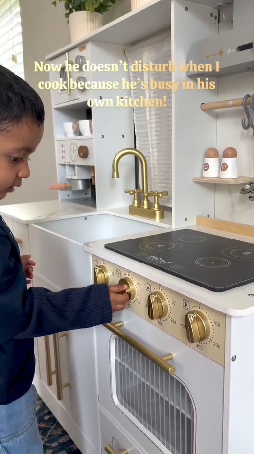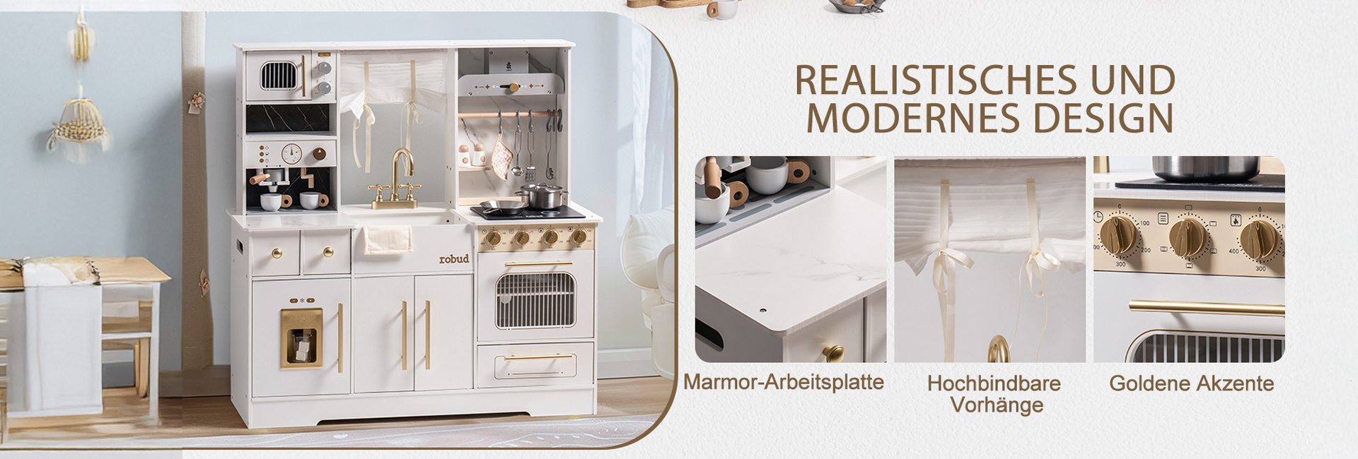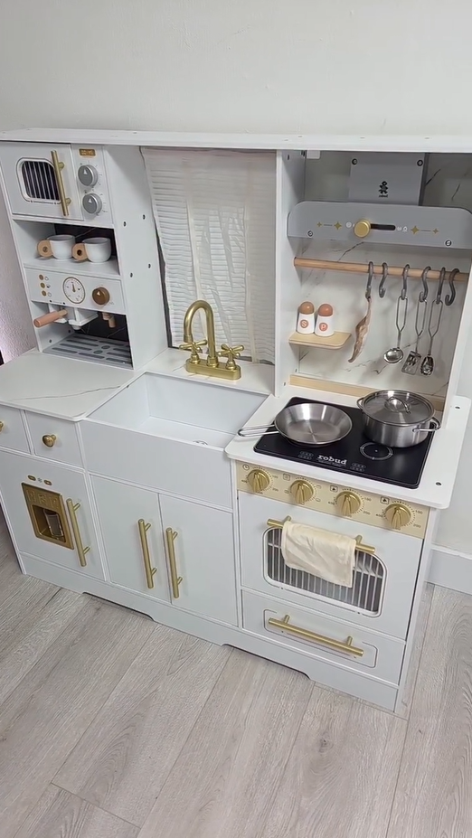 REALISTISCHES DESIGN, SPARK KREATIVITÄT: Das ROBUD Weiß & Gold Deluxe Kinderküchen-Set verfügt über ein exquisit gestaltetes Design und Details wie einen echten Wasserhahn, eine Kaffeemaschine, einen Ofen und Utensilien, die das realistischste Küchenspielerlebnis bieten, um die Kreativität und Vorstellungskraft Ihres Kindes zu entfachen.