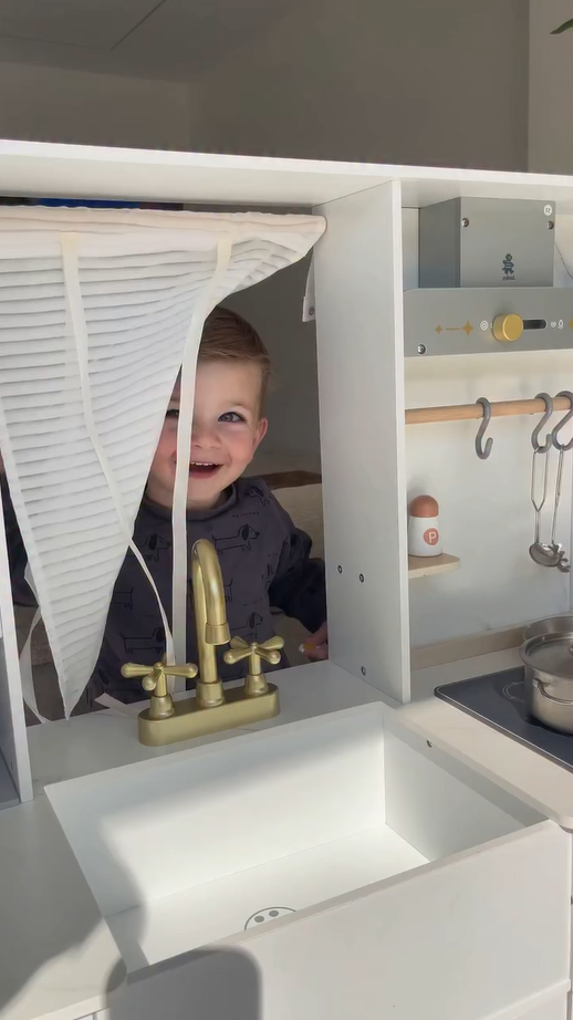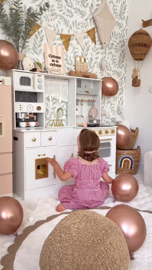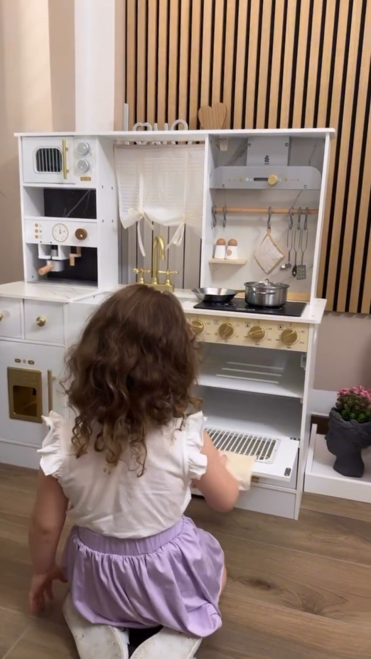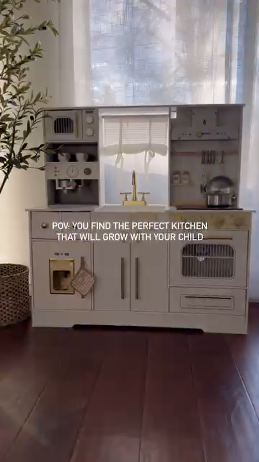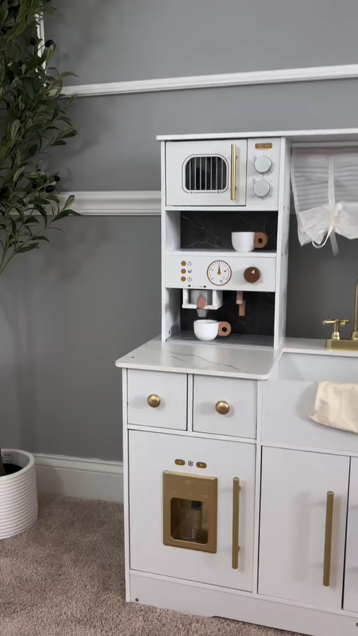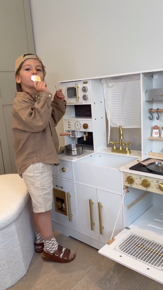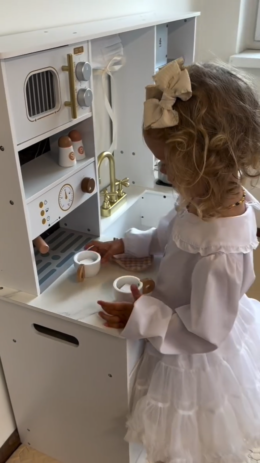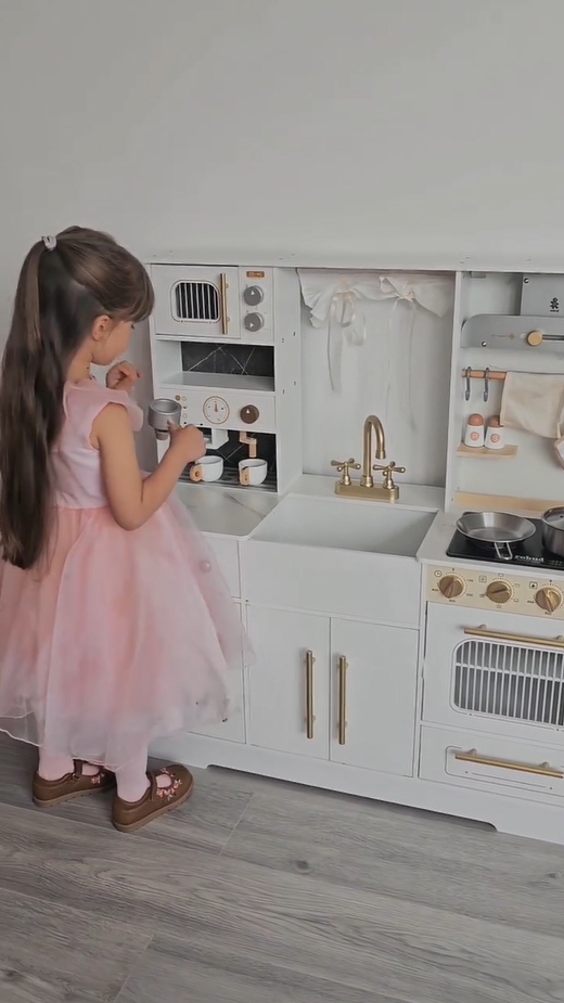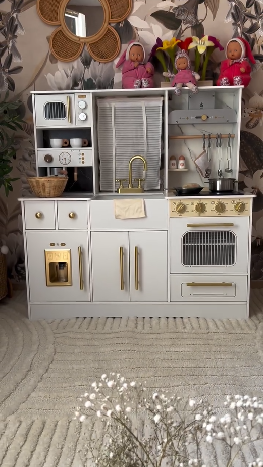 ELEGANTES AUSSEHEN, AUFMERKSAMKEIT FÜR DETAILS: Mit einem schlanken weißen Gehäuse und goldenen Akzenten passt dieses stilvolle Set perfekt in jeden Raum. Details wie die Kaffeemaschine, Vorhänge, Dunstabzugshaube und Aufbewahrungsschränke verstärken das luxuriöse Gefühl und geben Ihrem Kind eine einzigartige Spielküche.