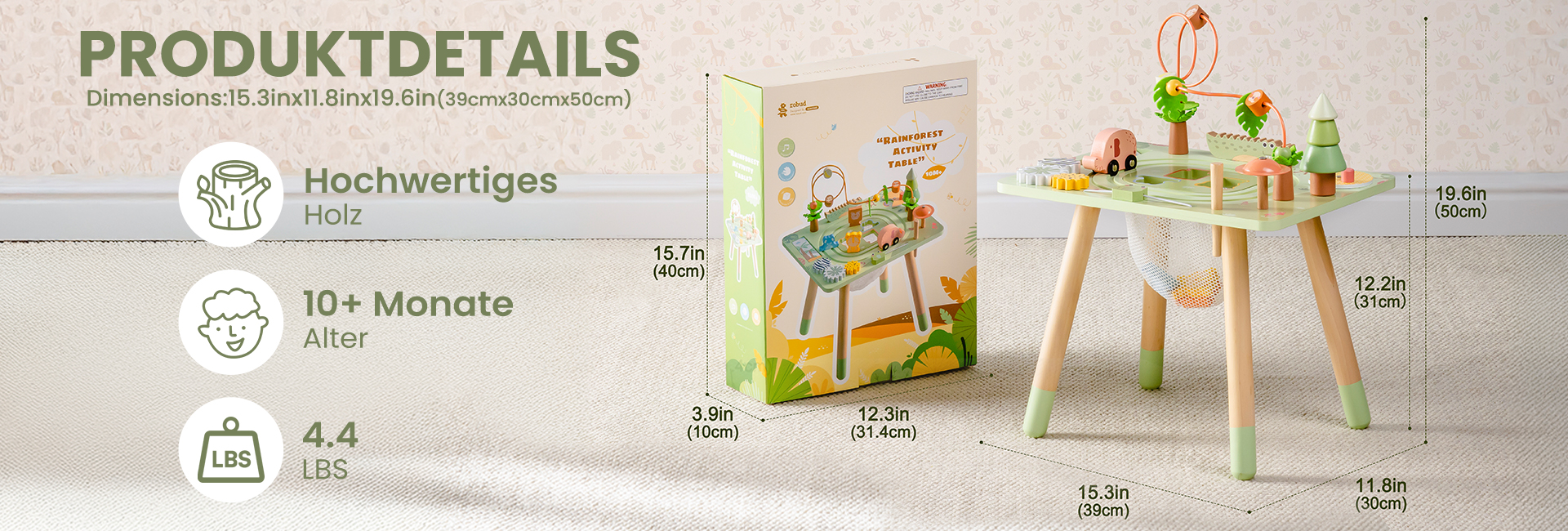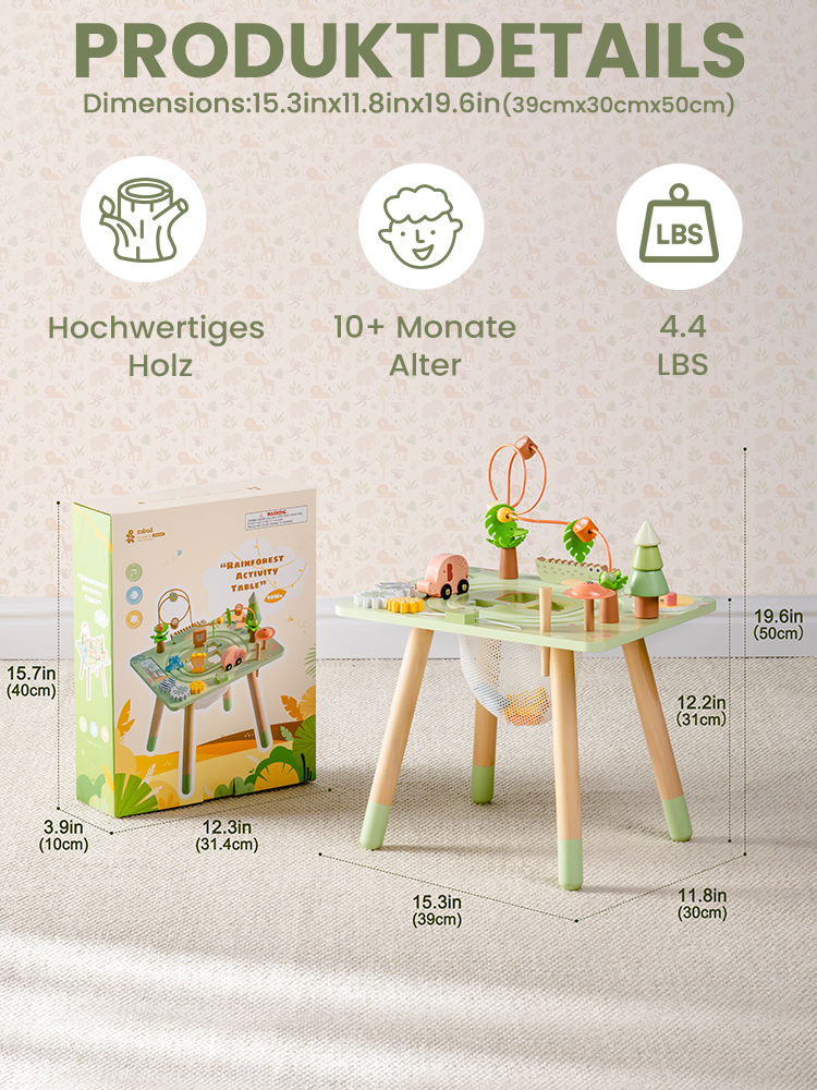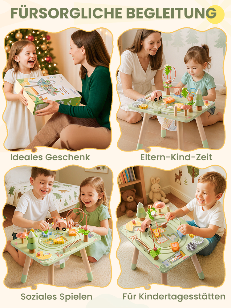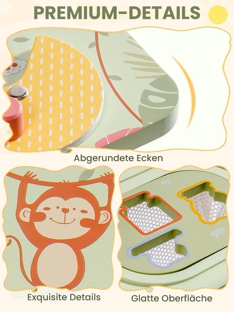 Sicher und langlebig: Hergestellt aus hochwertigem Holz mit glatten, abgerundeten Kanten, ist dieser Aktivitätstisch für Kleinkinder robust genug für das tägliche Spiel. Die stabile Konstruktion sorgt für Stabilität, und die ungiftigen, kindersicheren Materialien geben den Eltern ein gutes Gefühl.