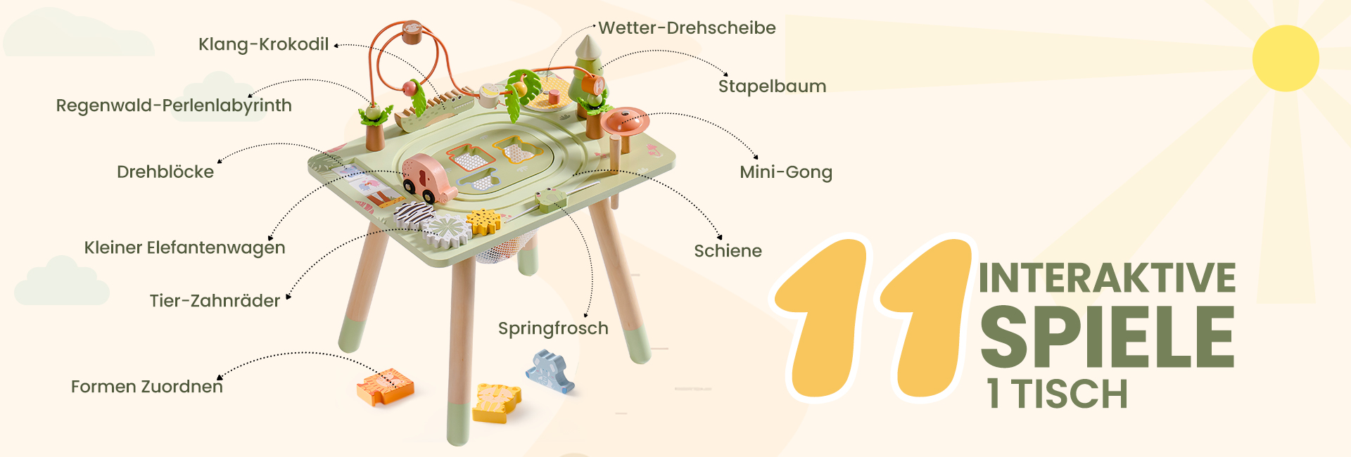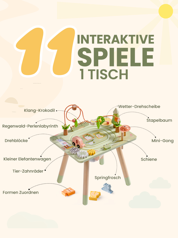11-in-1 Aktivitätstisch: Dieser Lern-Tisch bietet 11 Aktivitäten: Tierzahnräder, Mobiler hüpfender Frosch, Kleine Gong, Stapelbaum, Wetterdreher, Geräuschmachendes Krokodil, Kippblöcke, Baby-Elefant-Wagen, Bahn, Formen zuordnen und Regenwaldperlen. Er ist perfekt zur Entwicklung der Feinmotorik, kognitiven Entwicklung und Kreativität und bietet ein praktisches, unterhaltsames Lernerlebnis, das Exploration und Entwicklung durch Spiel fördert.