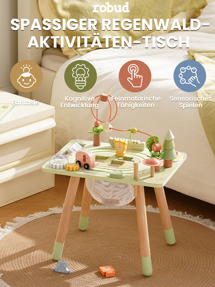 ROBUD 11-in-1-Aktivitätstisch aus Holz mit Regenwaldmotiv