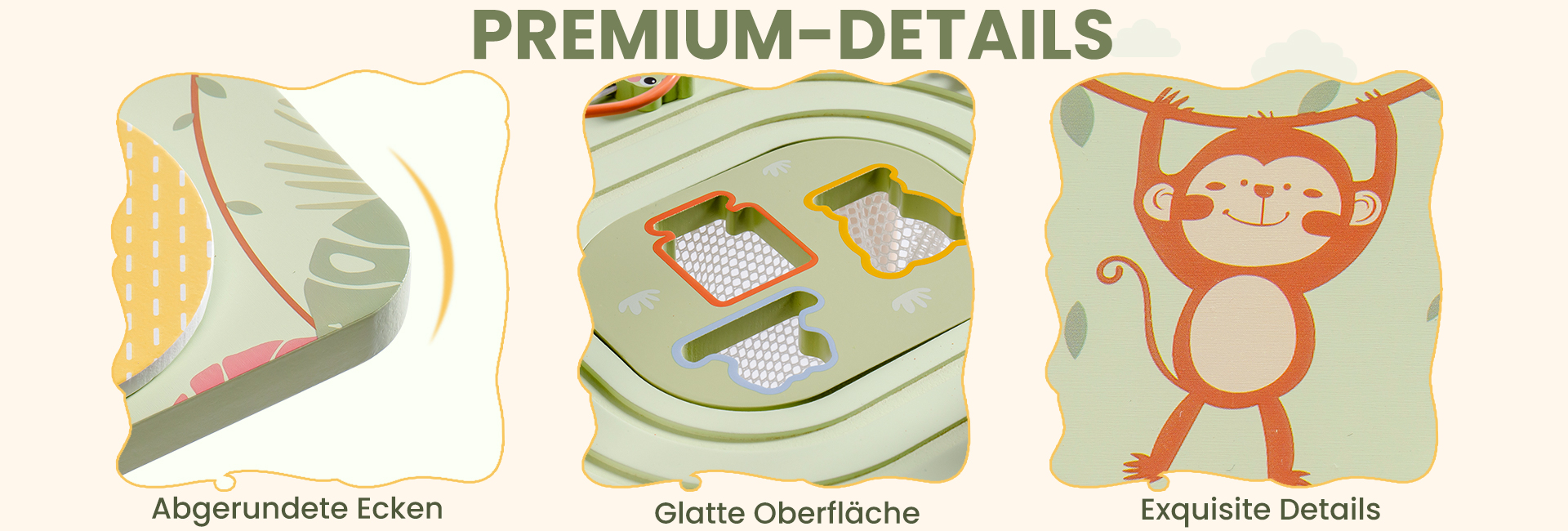 Montessori-Design: Dieser Aktivitätstisch, geeignet für Kleinkinder im Alter von 1-3 Jahren, fördert praktisches Lernen und interaktives Spiel. Aktivitäten wie Formen sortieren und Regenwaldperlen verbessern die Feinmotorik und Hand-Augen-Koordination und fördern Problemlösungsfähigkeiten und kognitive Entwicklung.