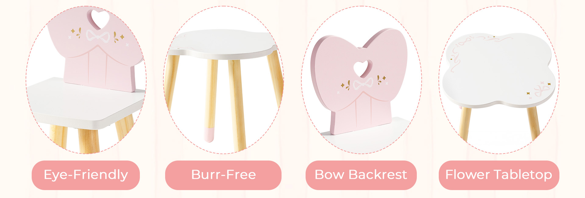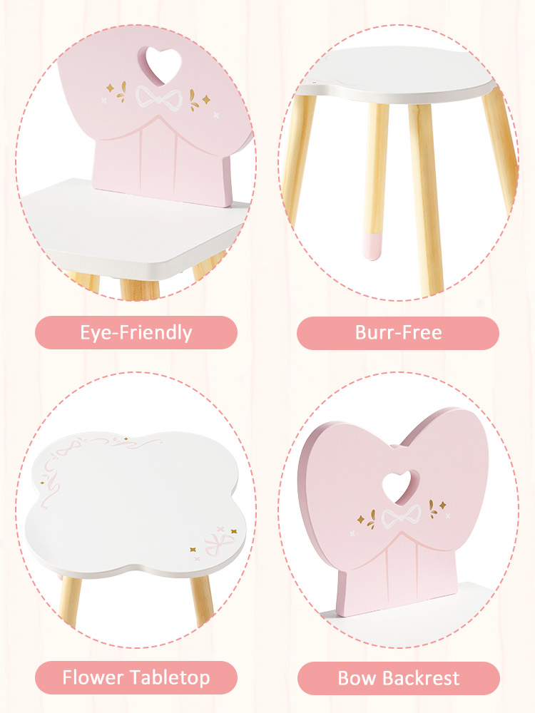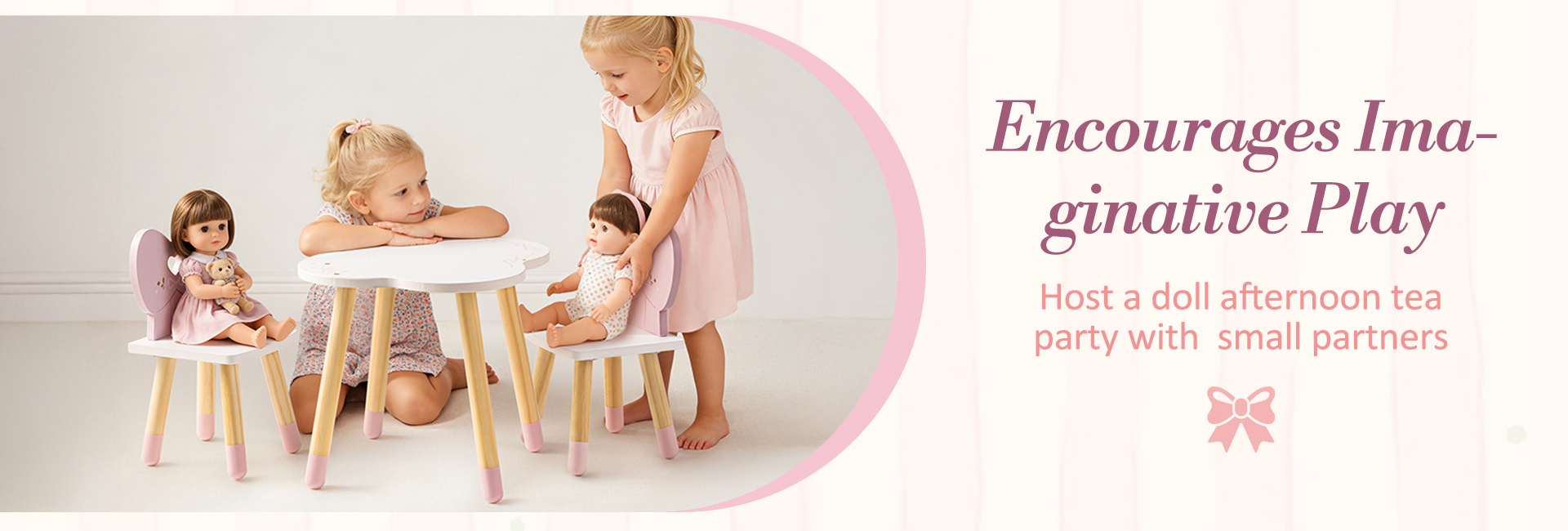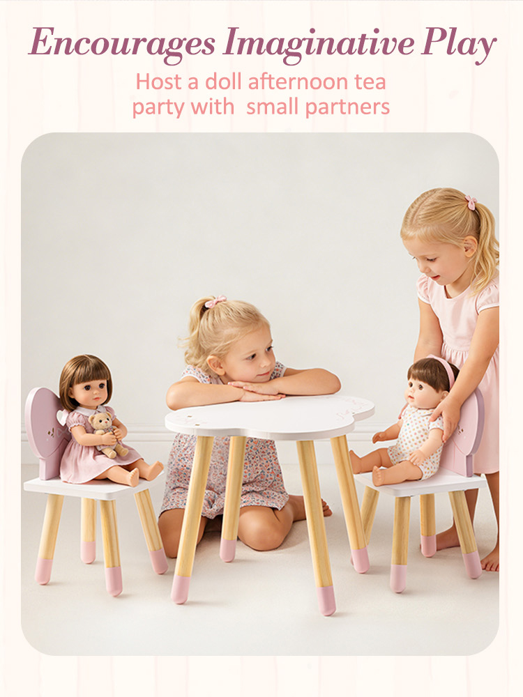 🌷Verspieltes Design für den Charme des Spielzimmers: Die Schleifen-Herz-Stühle und der wolkenförmige Tisch verleihen jedem Spielzimmer einen märchenhaften Touch. Die sanfte rosa-weiße Farbgebung passt perfekt zu Puppenzubehör und macht es zu einer stilvollen Ergänzung für Rollenspiel-Setups.