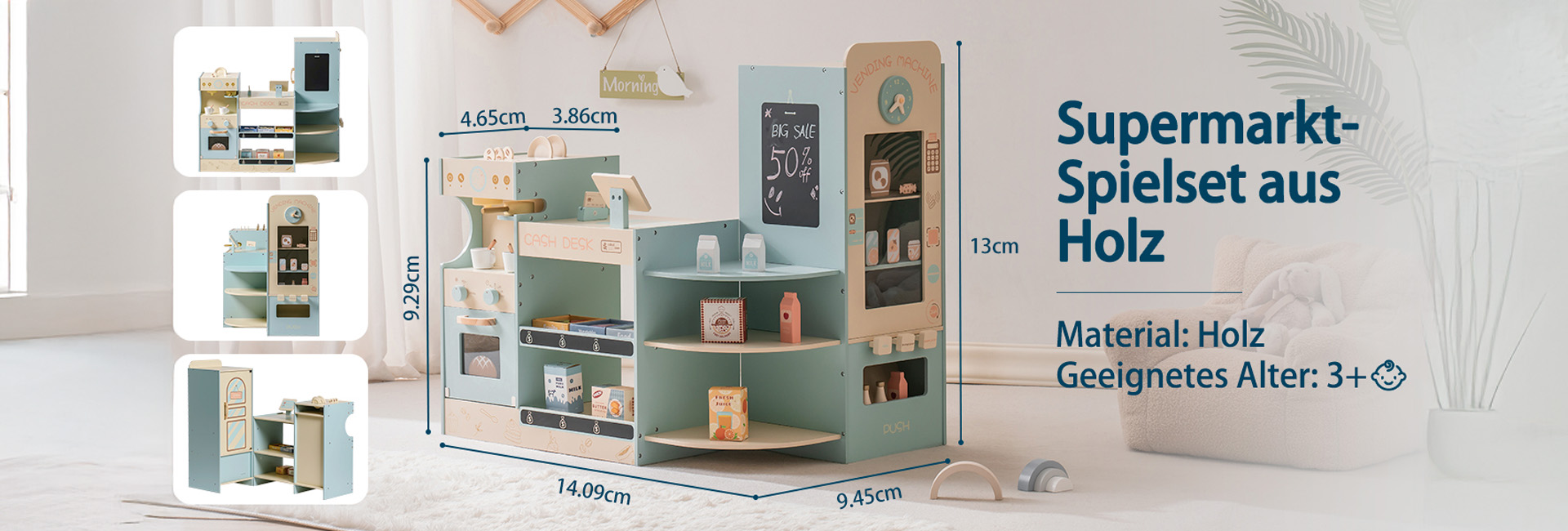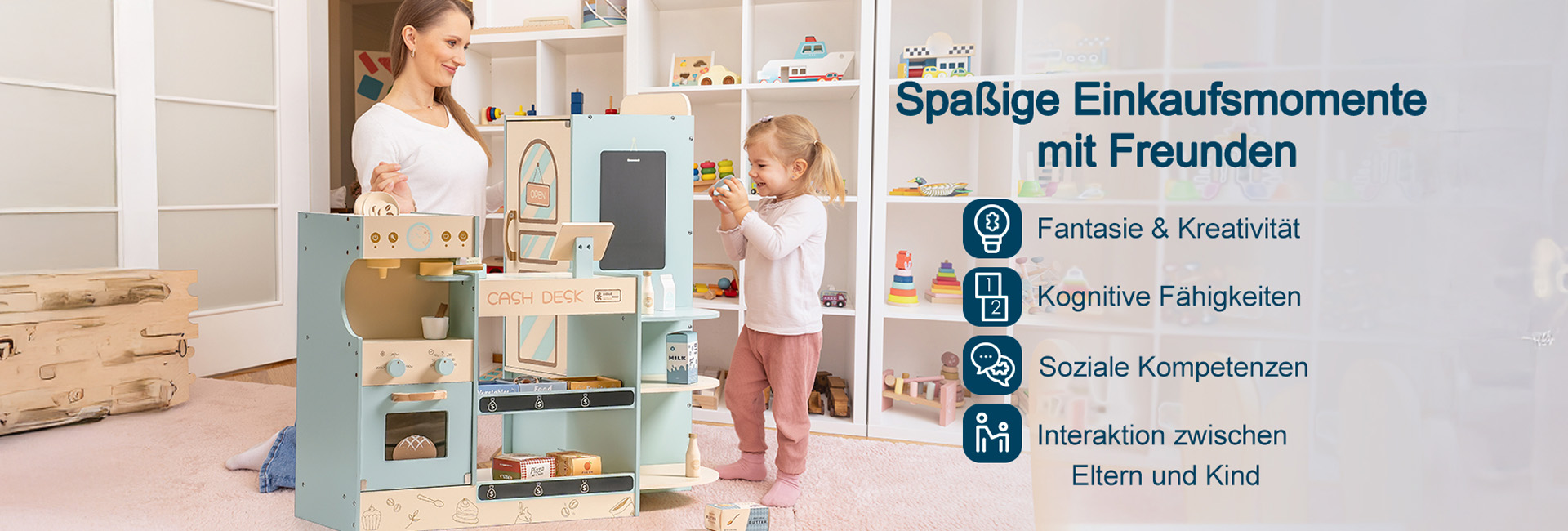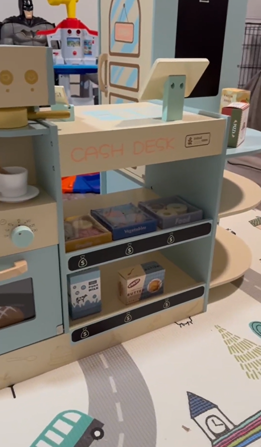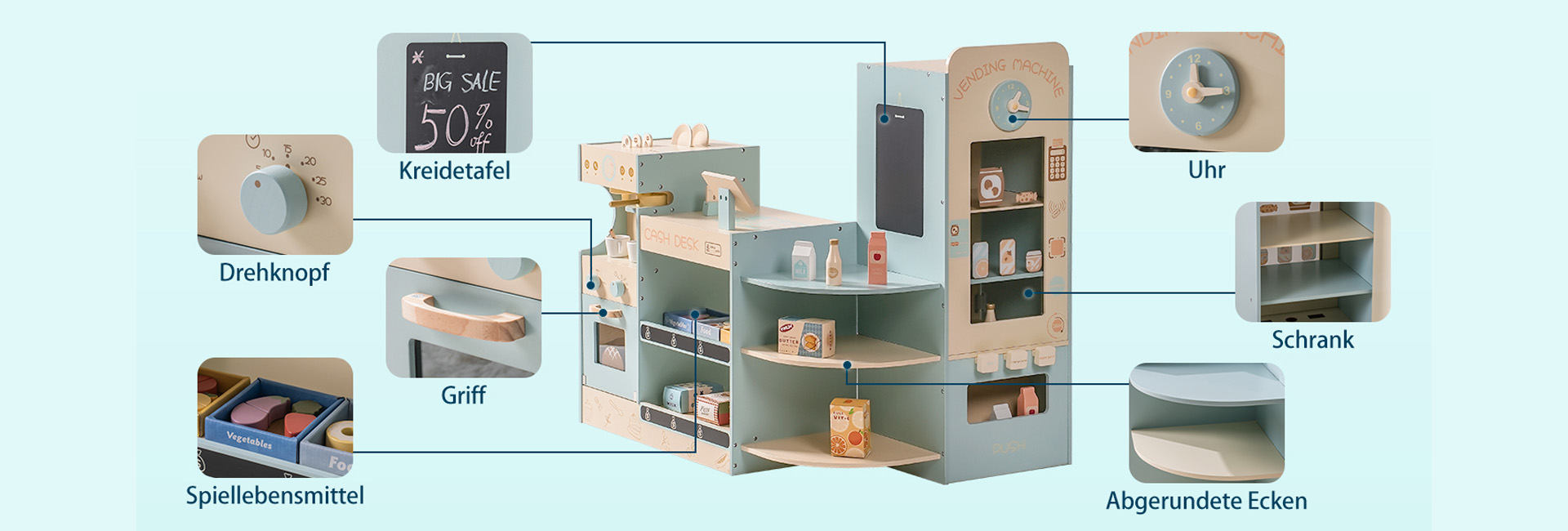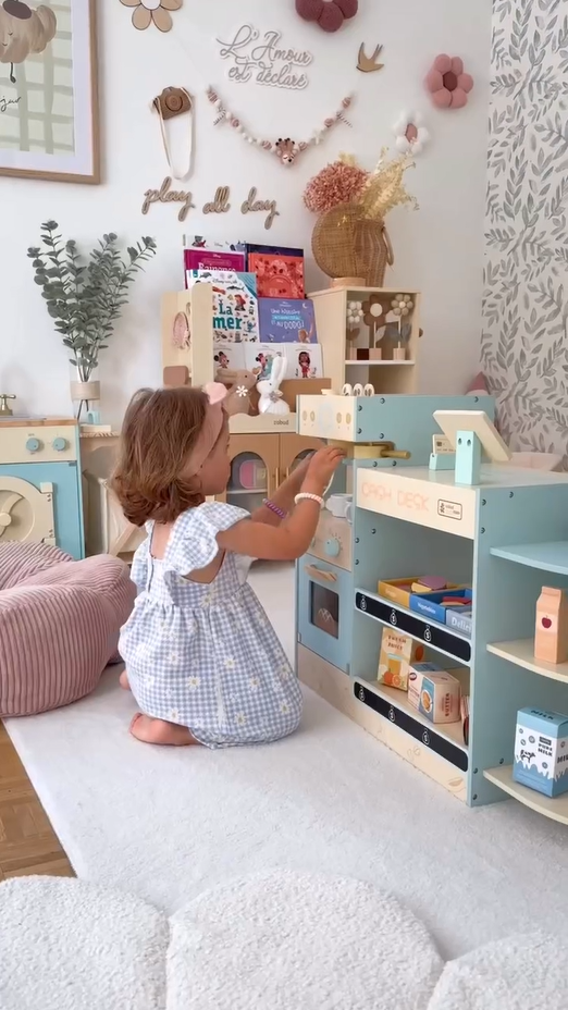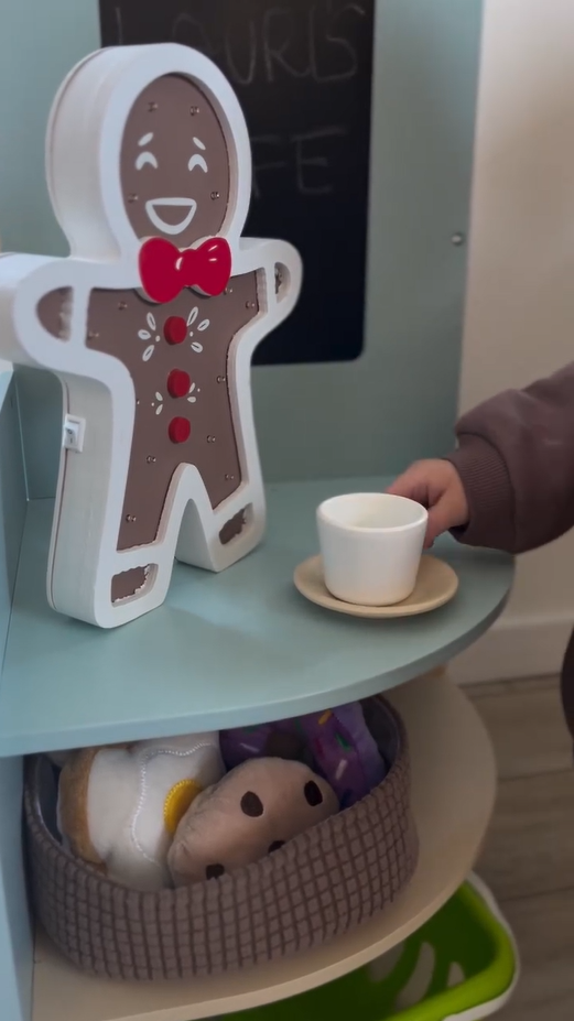 Umfangreiches Zubehör: Mit einer Vielzahl von Produkten wie Gebäck, Gemüse, Obst, Saft, Milch, Butter, Kaffeebohnen und vielem mehr bietet das Set eine breite Palette an Verkaufsartikeln. Dazu gehören auch Geschirr wie Kaffeetassen und Untersetzer sowie eine Spielzeug-Bankkarte für noch mehr Spielspaß!