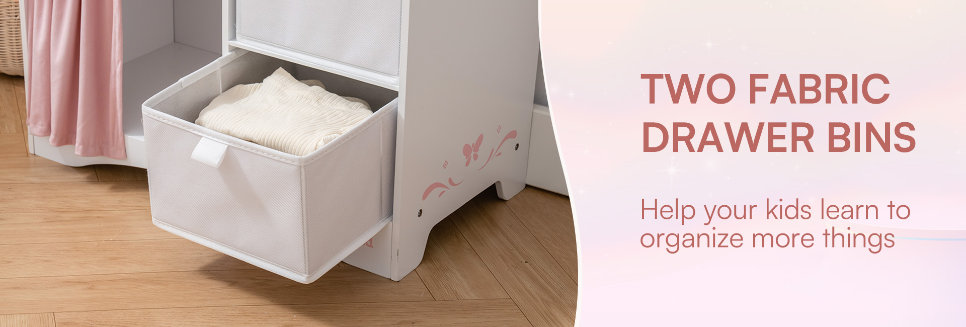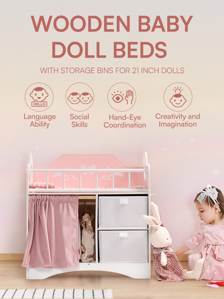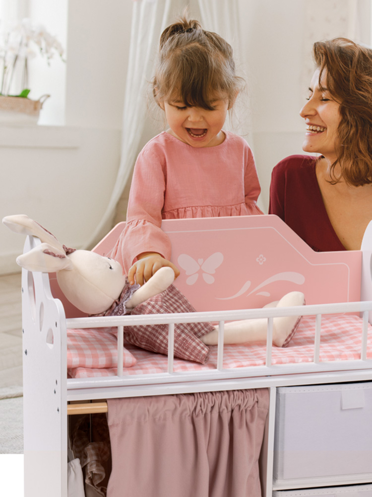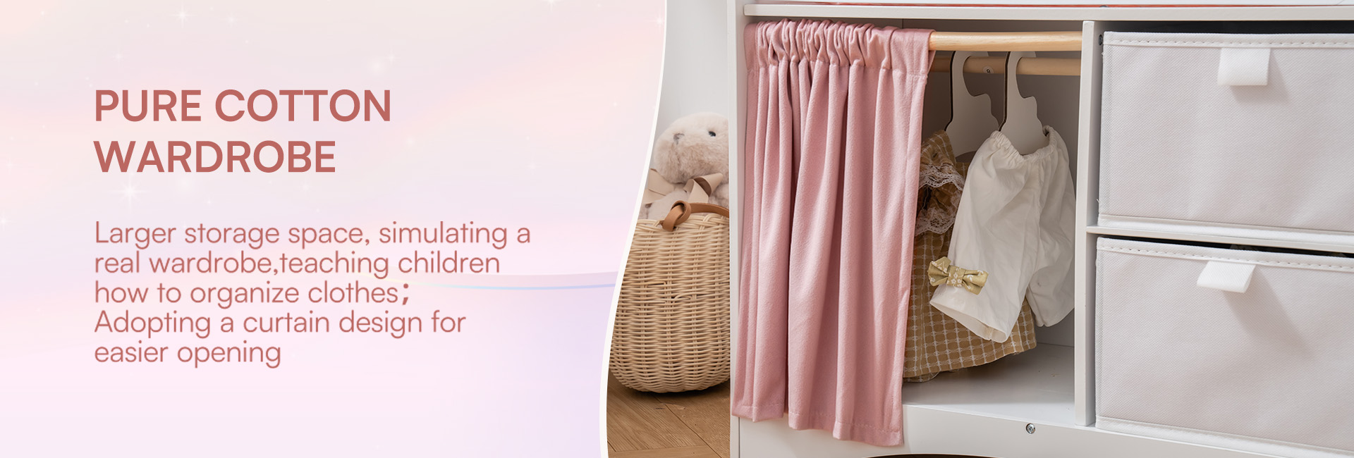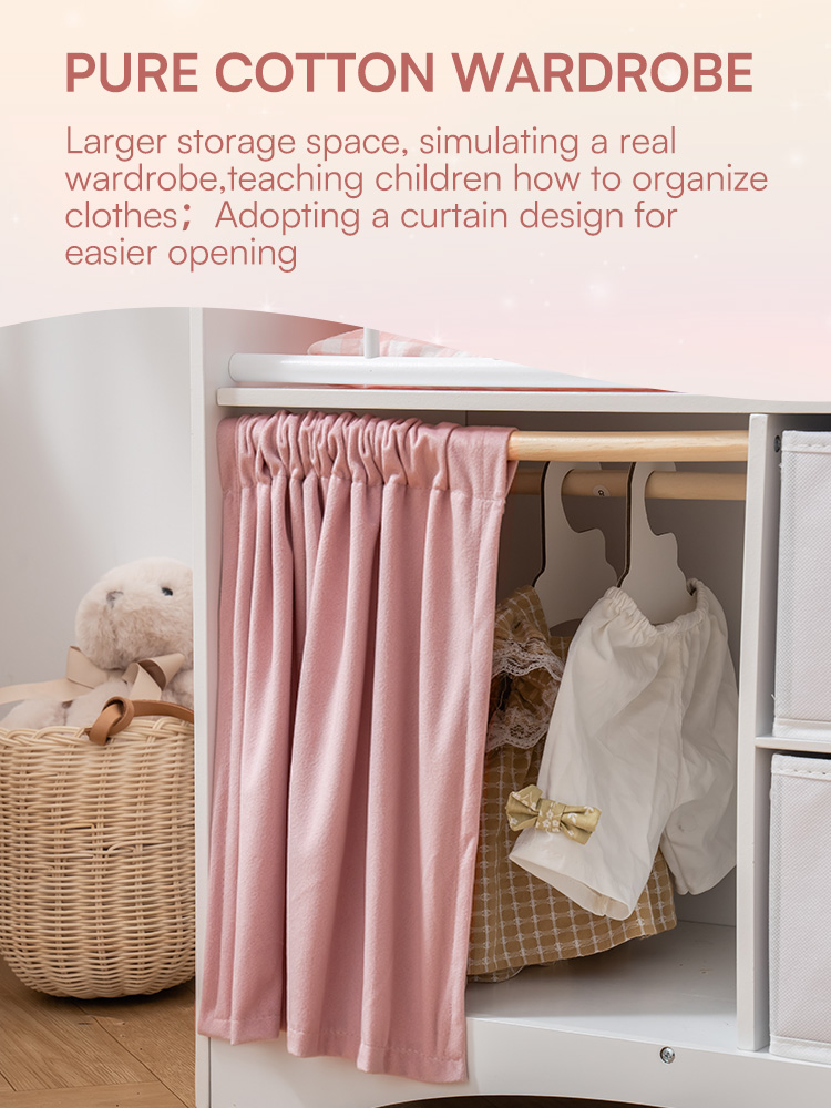 Geräumiger Stauraum und Kleiderbereich - Ausgestattet mit einer Kleiderstange mit Bügeln, Stoffboxen zur einfachen Aufbewahrung und einem Vorhang für mehr Privatsphäre. So können Kinder Puppenkleidung, Schuhe und Zubehör bequem verstauen.