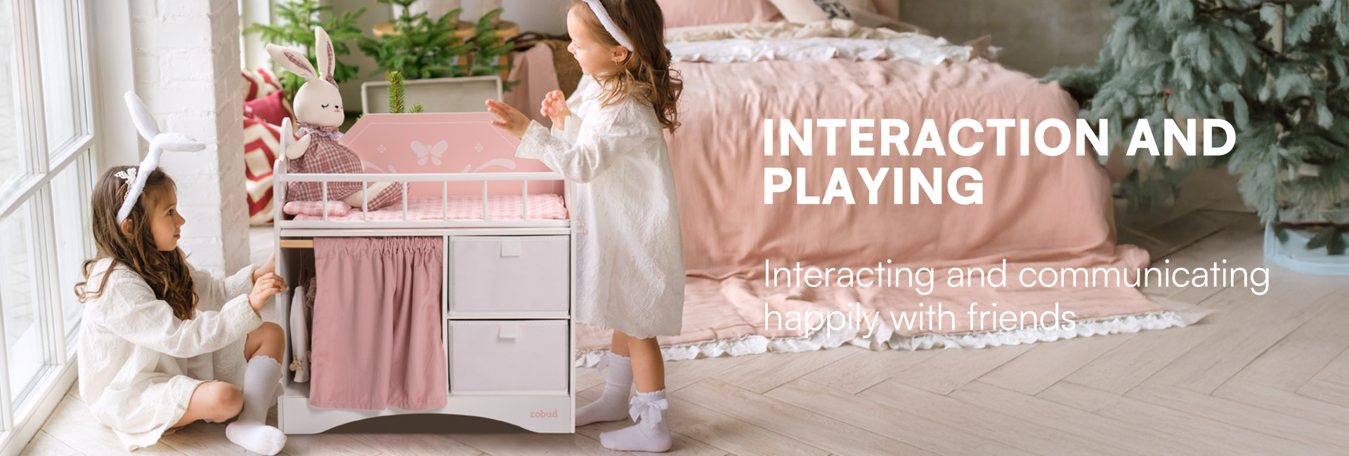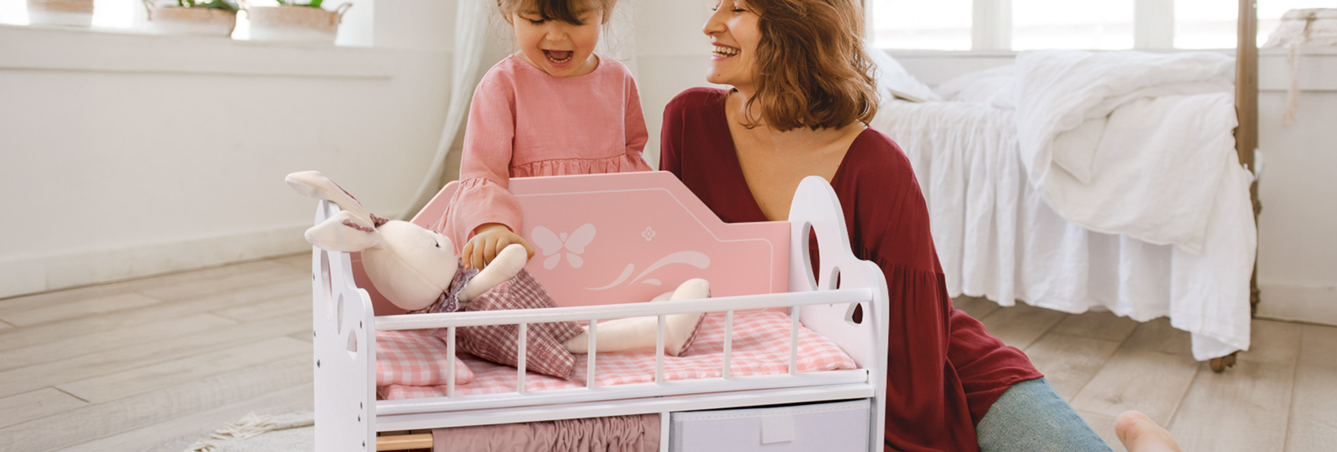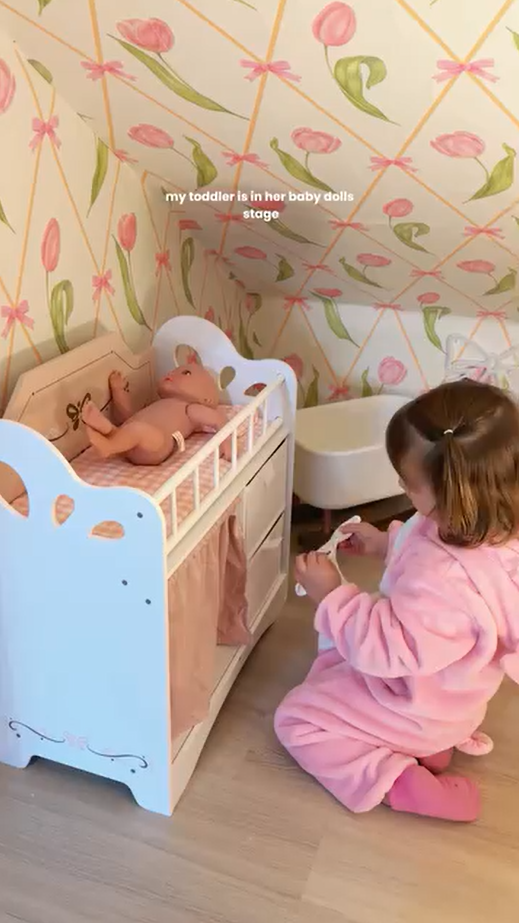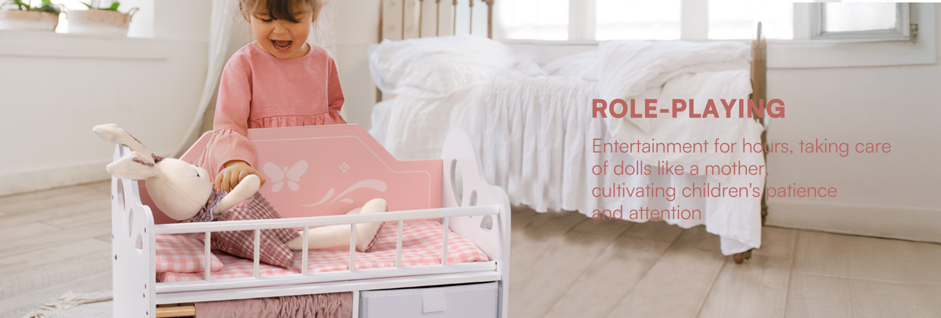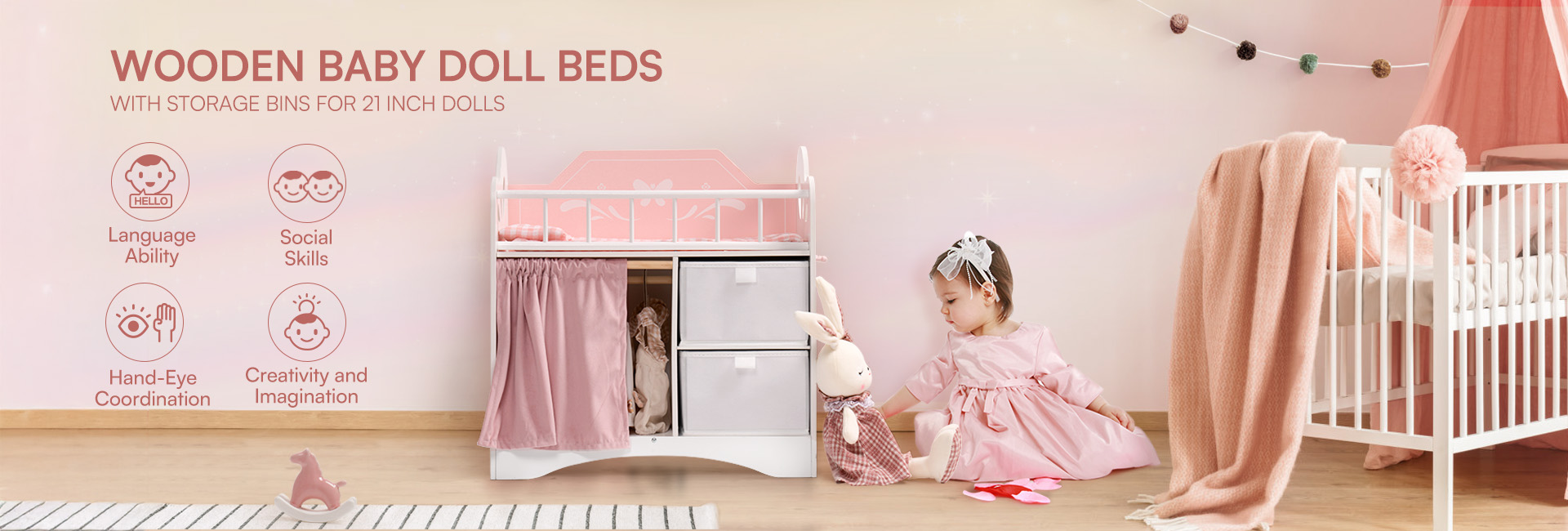 Geräumiger Stauraum und Kleiderbereich - Ausgestattet mit einer Kleiderstange mit Bügeln, Stoffboxen zur einfachen Aufbewahrung und einem Vorhang für mehr Privatsphäre. So können Kinder Puppenkleidung, Schuhe und Zubehör bequem verstauen.