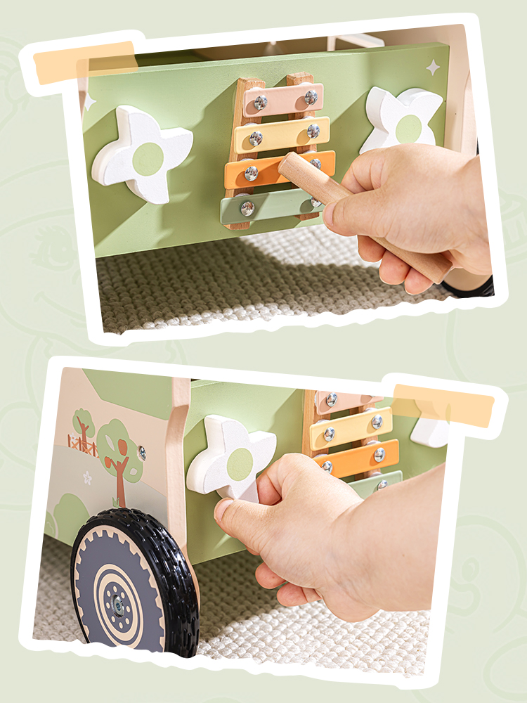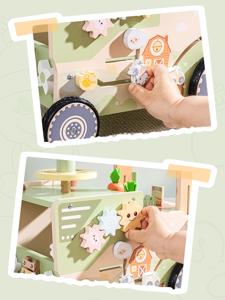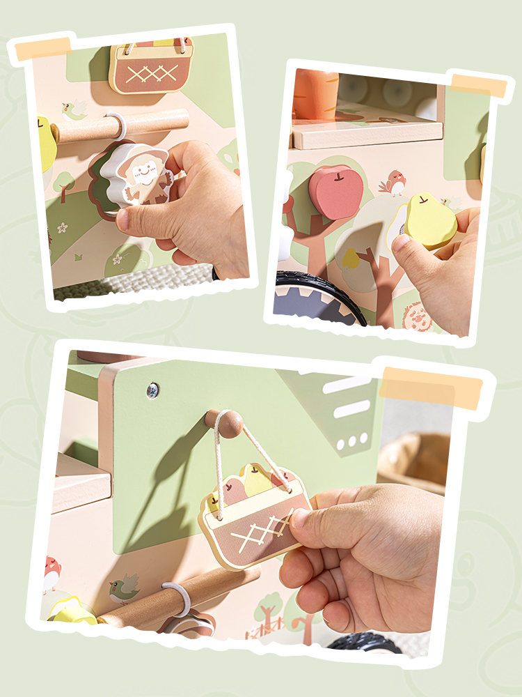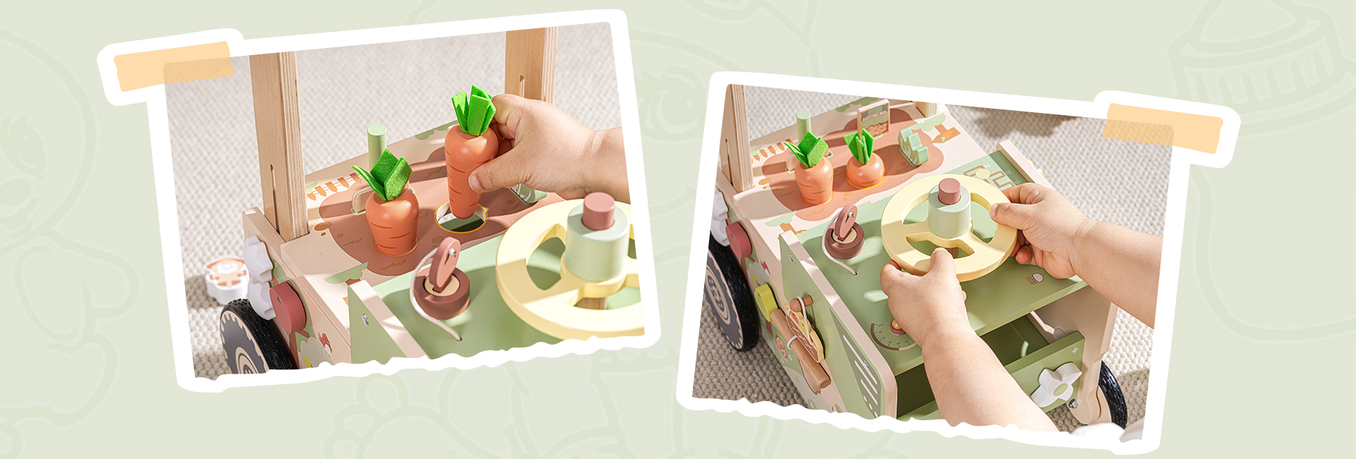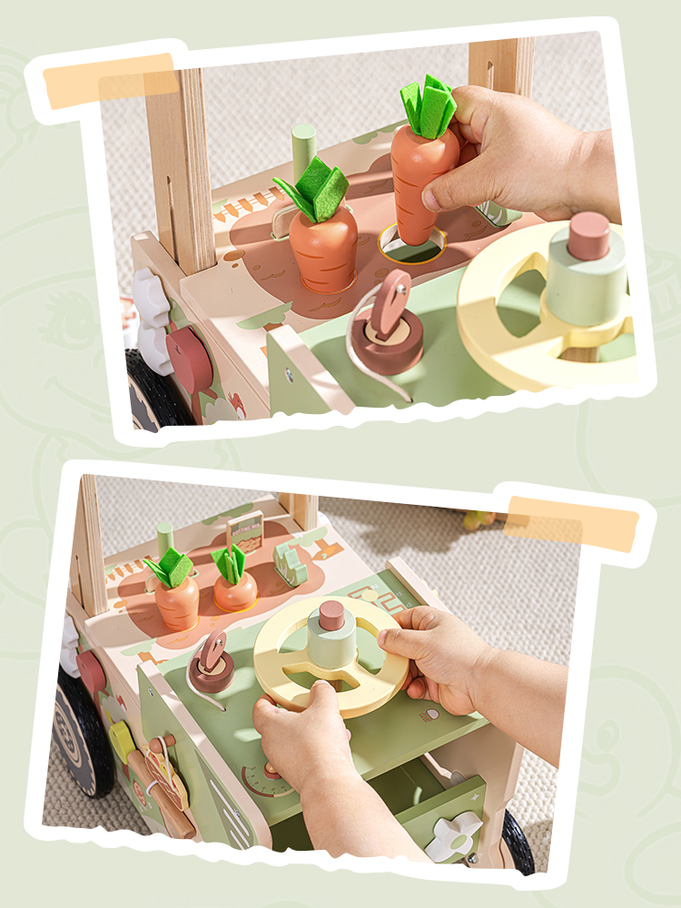 • 🍐Ernte-Spielaktivitäten – An den Seiten des Lauflernwagens befinden sich Formzuordnungsspiele mit Früchten wie Äpfeln und Birnen. Diese Spiele fördern die Feinmotorik und das Formenerkennen. Oben ist eine bezaubernde Szene mit wachsenden Karotten zu sehen – vom Sprießen der Blätter bis zur Erntezeit – und regt Kinder zu Rollenspielen und dem Erfinden eigener Geschichten an.
