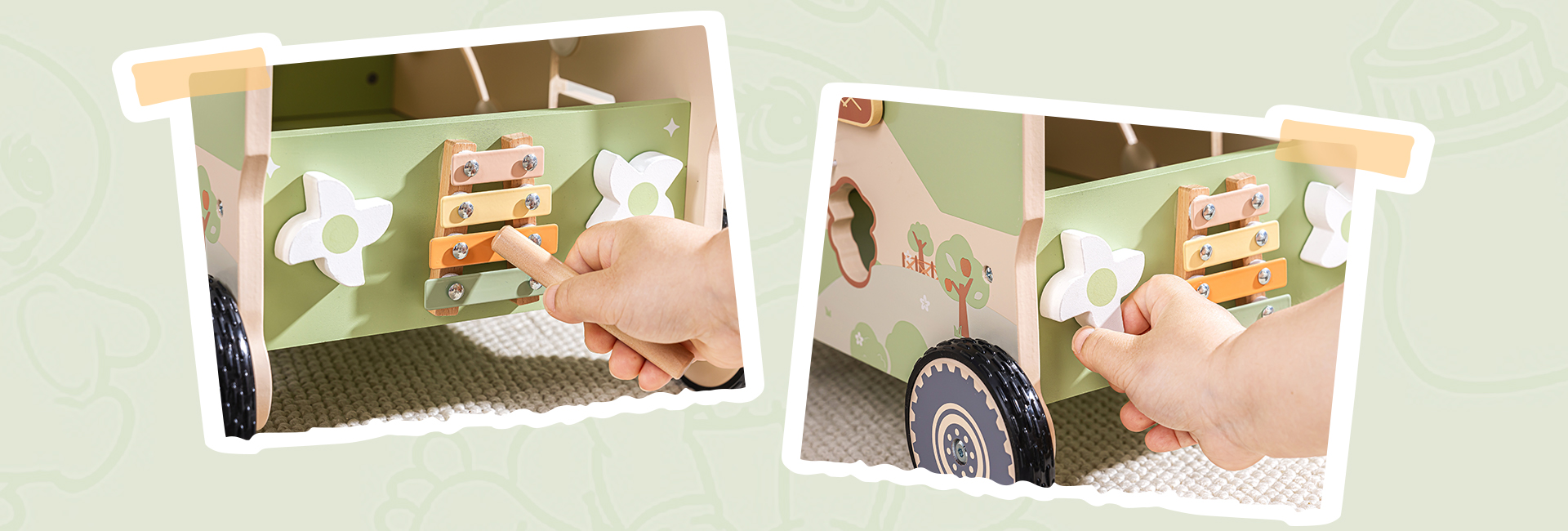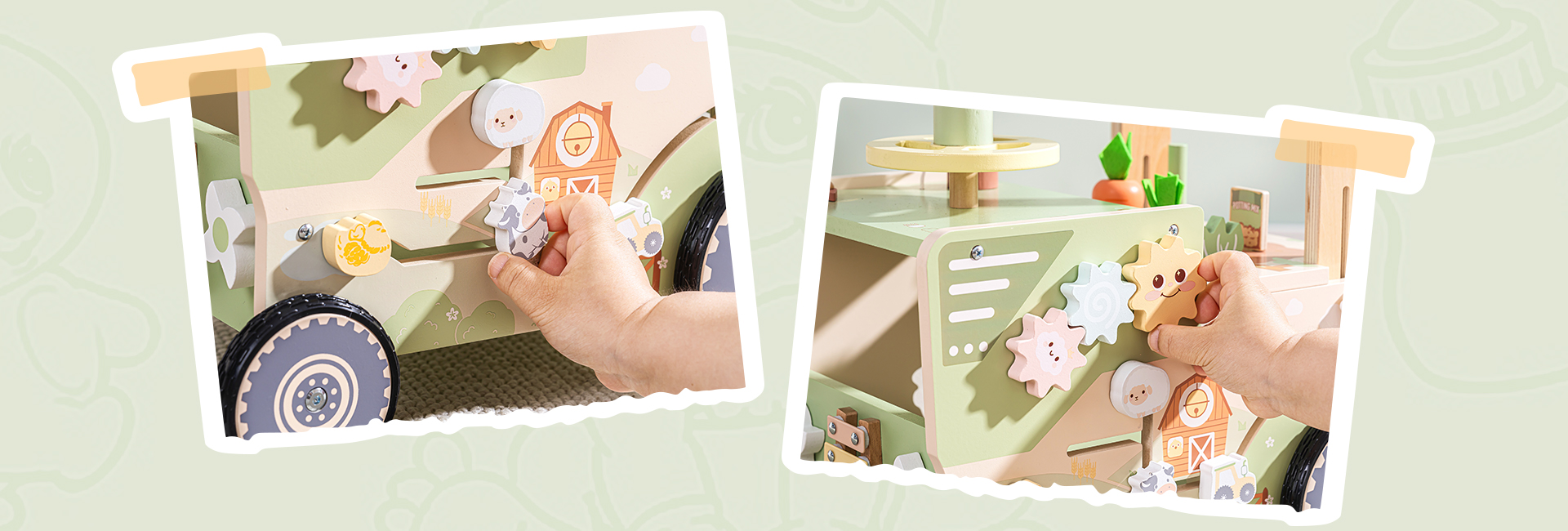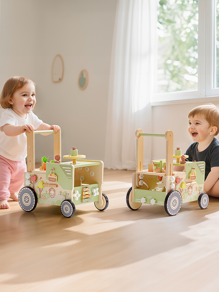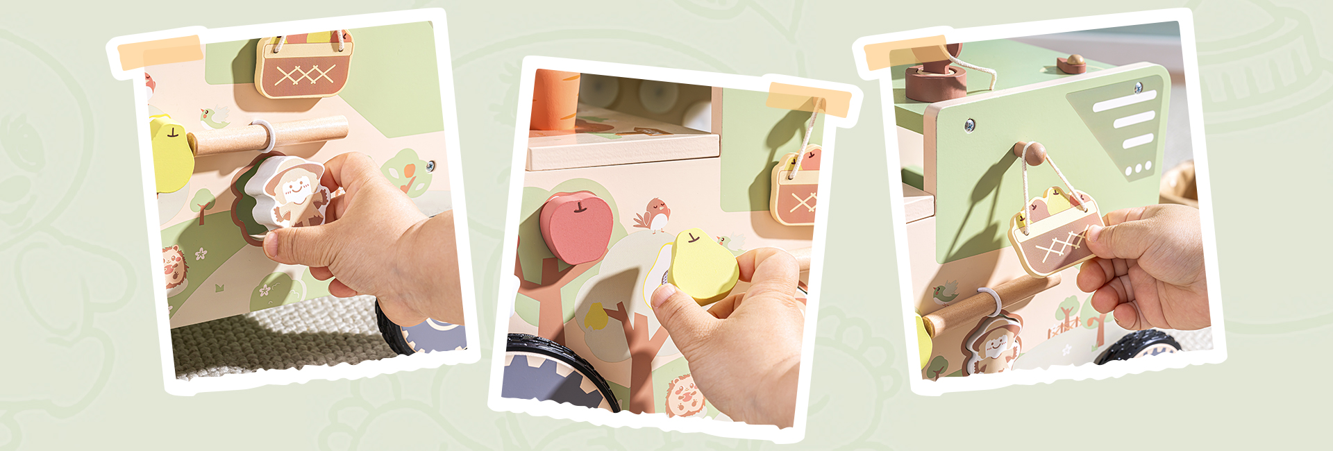 • 🍐Ernte-Spielaktivitäten – An den Seiten des Lauflernwagens befinden sich Formzuordnungsspiele mit Früchten wie Äpfeln und Birnen. Diese Spiele fördern die Feinmotorik und das Formenerkennen. Oben ist eine bezaubernde Szene mit wachsenden Karotten zu sehen – vom Sprießen der Blätter bis zur Erntezeit – und regt Kinder zu Rollenspielen und dem Erfinden eigener Geschichten an.