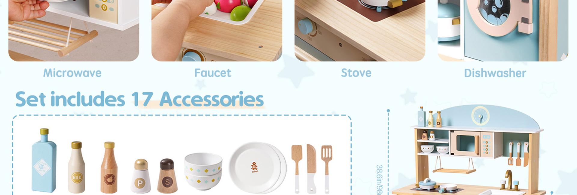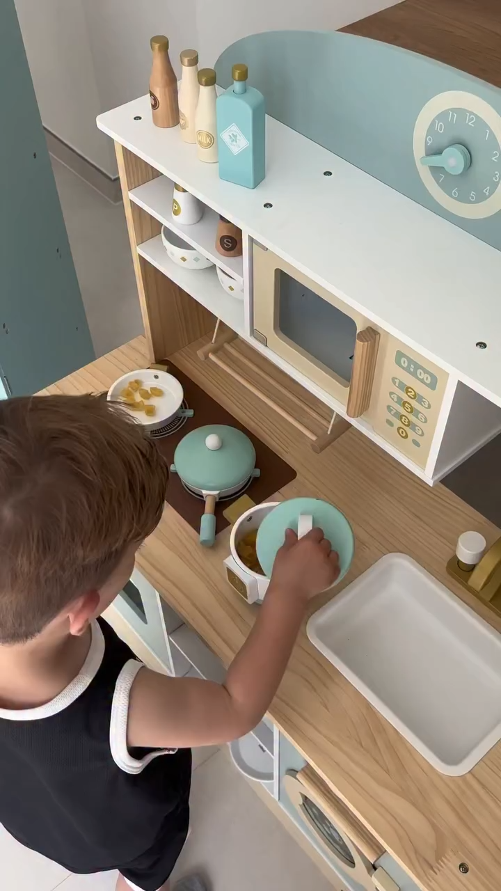 Das Spielküchen-Abenteuer verfügt über eine Bauernspüle mit drehbarem Wasserhahn, mit der Kinder spielerisch waschen und kochen können. Die Backofentür lässt sich leicht öffnen und gibt den Blick auf einen geräumigen Innenraum zum Backen und Braten frei. Die Ablagen und Haken sorgen für einen authentischen Touch und bieten Stauraum für Spielutensilien und Zubehör.