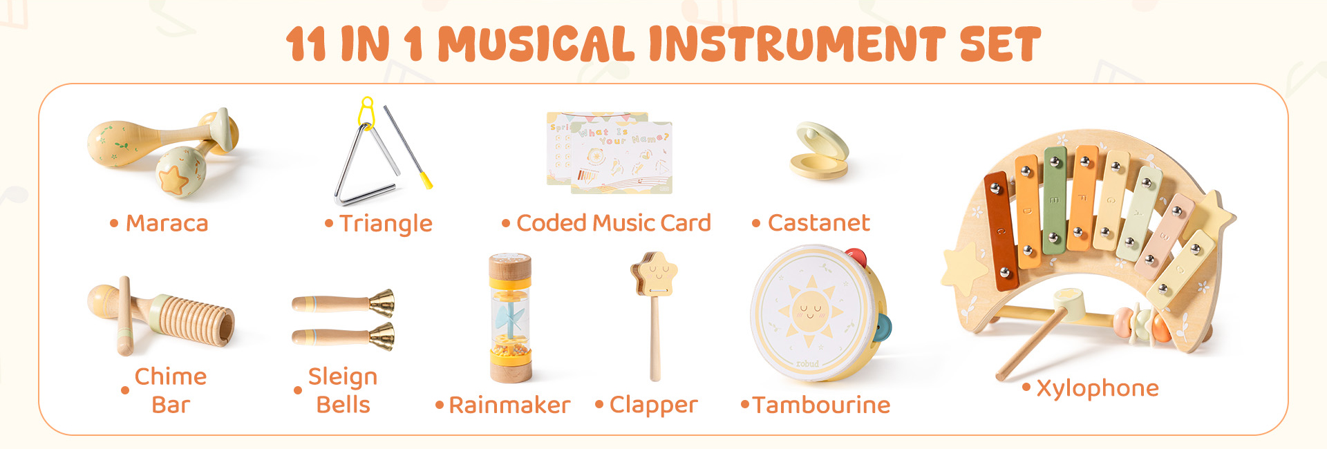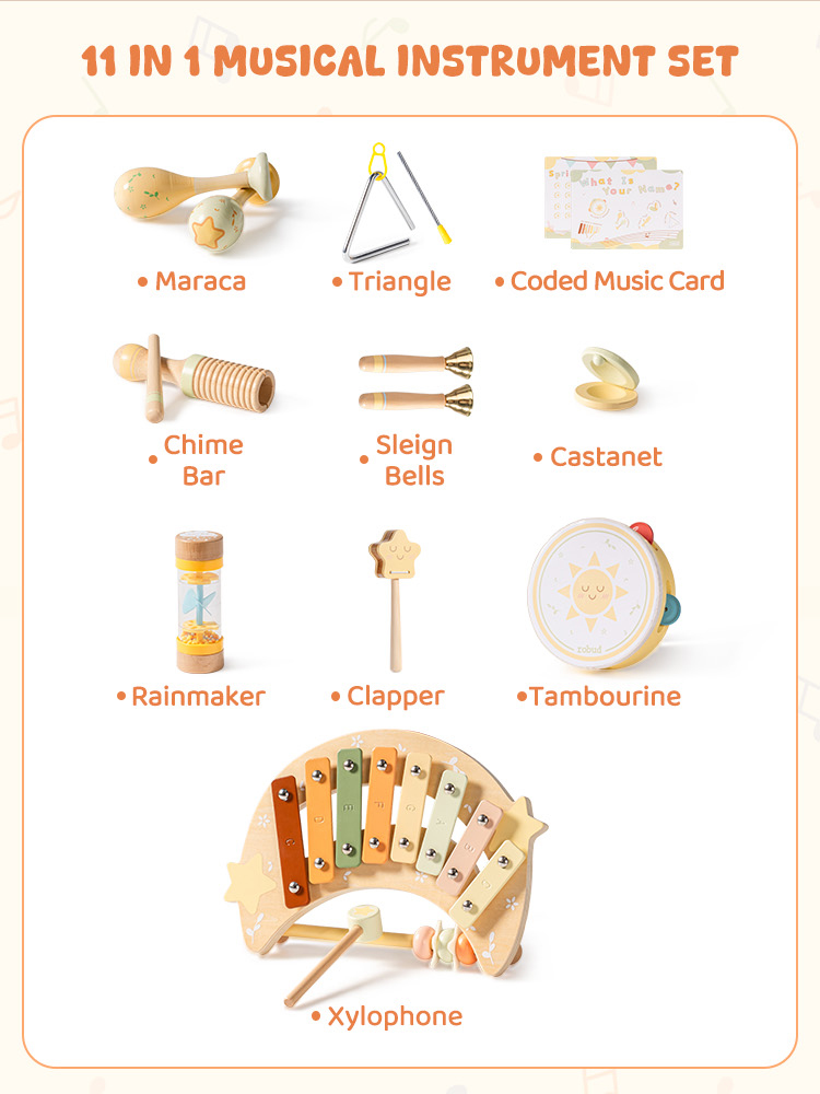 • ✨Unendliche Spielmöglichkeiten🍄 Dieses Musikspielzeug mit 11 verschiedenen Instrumenten bietet grenzenlose Spielmöglichkeiten. Kinder können mit dem Xylophon solo spielen, mit Maracas rhythmische Klänge erzeugen oder mit dem klaren Klang der Triangel experimentieren und so das Spielen zu einem angeleiteten musikalischen Lernerlebnis machen. Es eignet sich perfekt zum alleinigen Spielen oder um die Freude an der Musik mit Geschwistern und Freunden zu teilen.