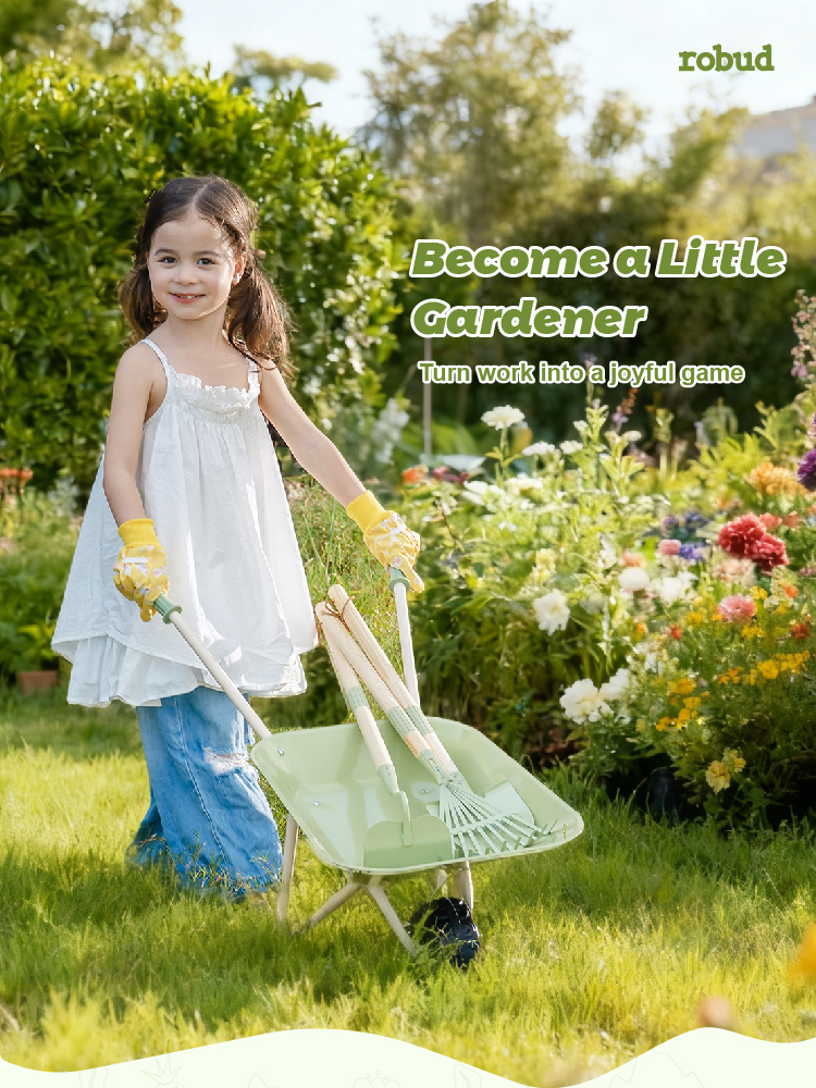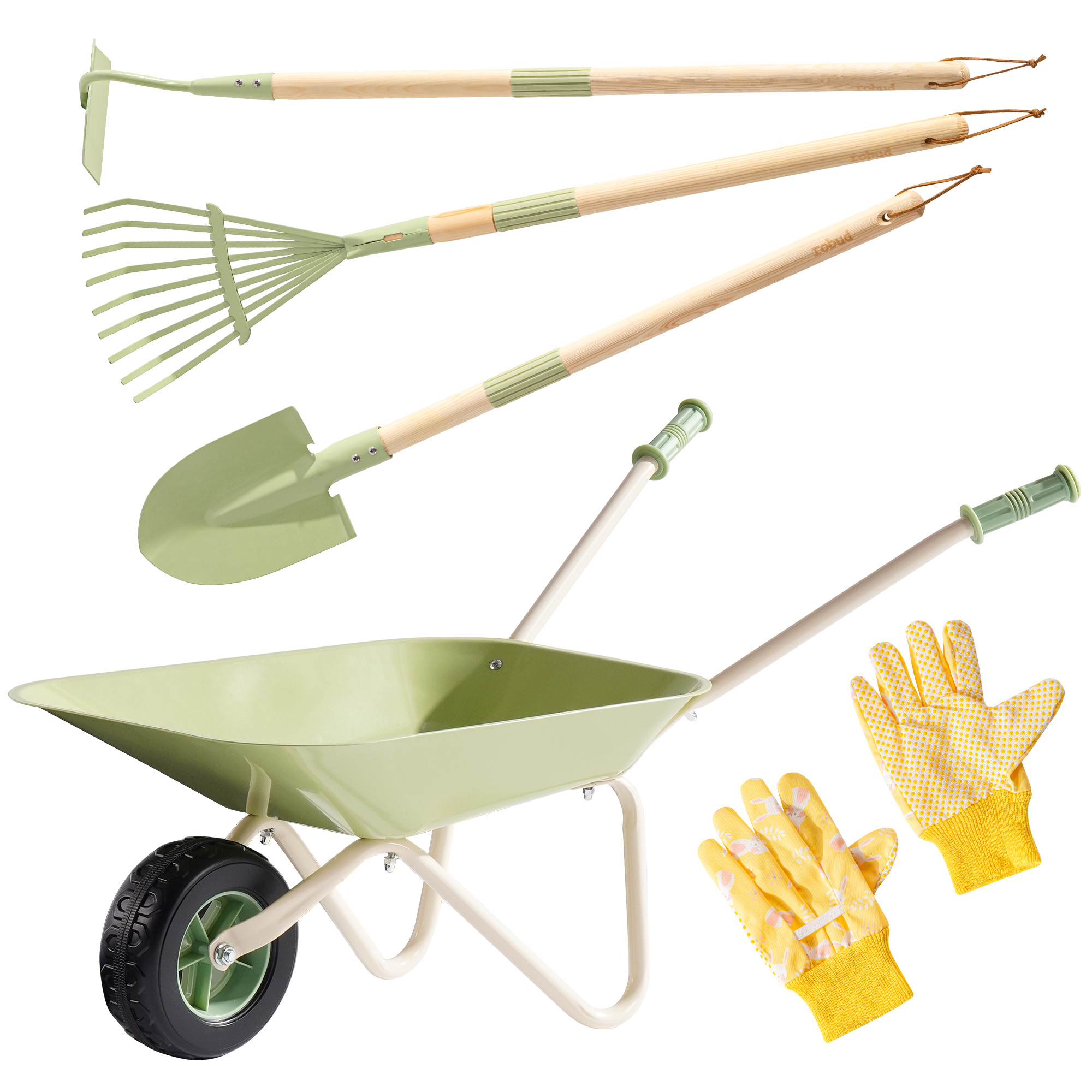 ROBUD Kids Wheelbarrow Set, Green Metal Toddler Wheelbarrow with Shovel, Hoe, Broom & Gloves, Kid Gardening Set for Kid