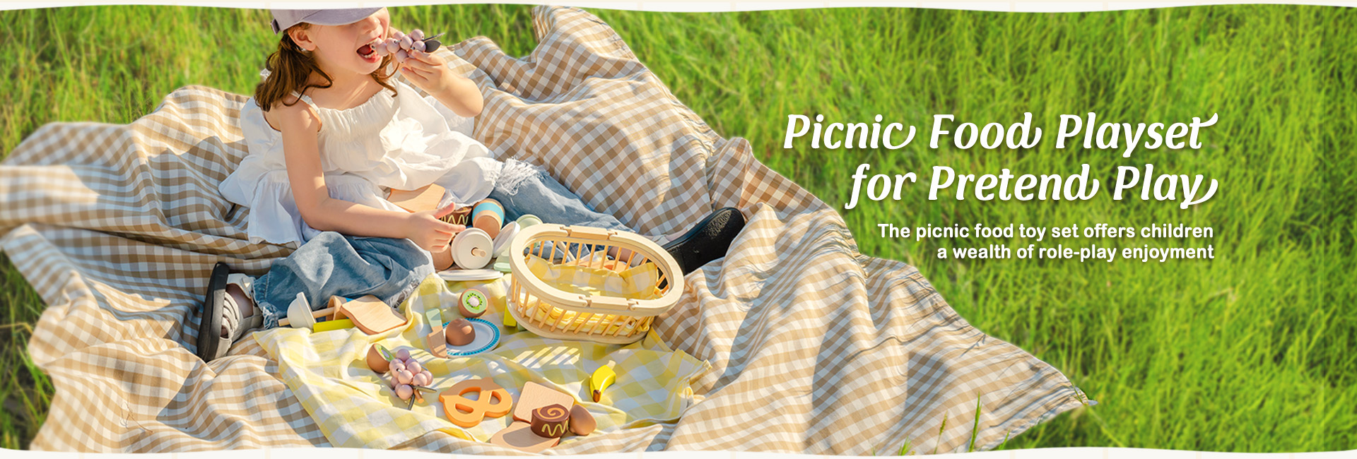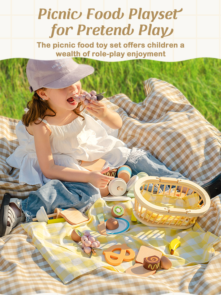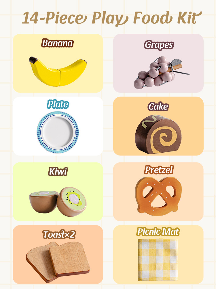 • Kreatives Rollenspiel-Picknickvergnügen: Mit einer Vielzahl von Lebensmitteln und einem Korb zum Packen können Kinder imaginäre Picknicks veranstalten, „Kaffee & Kuchen“ teilen oder im Freien mit Freunden und Familie essen—was Kreativität, Geschichtenerzählen und soziale Interaktion fördert.