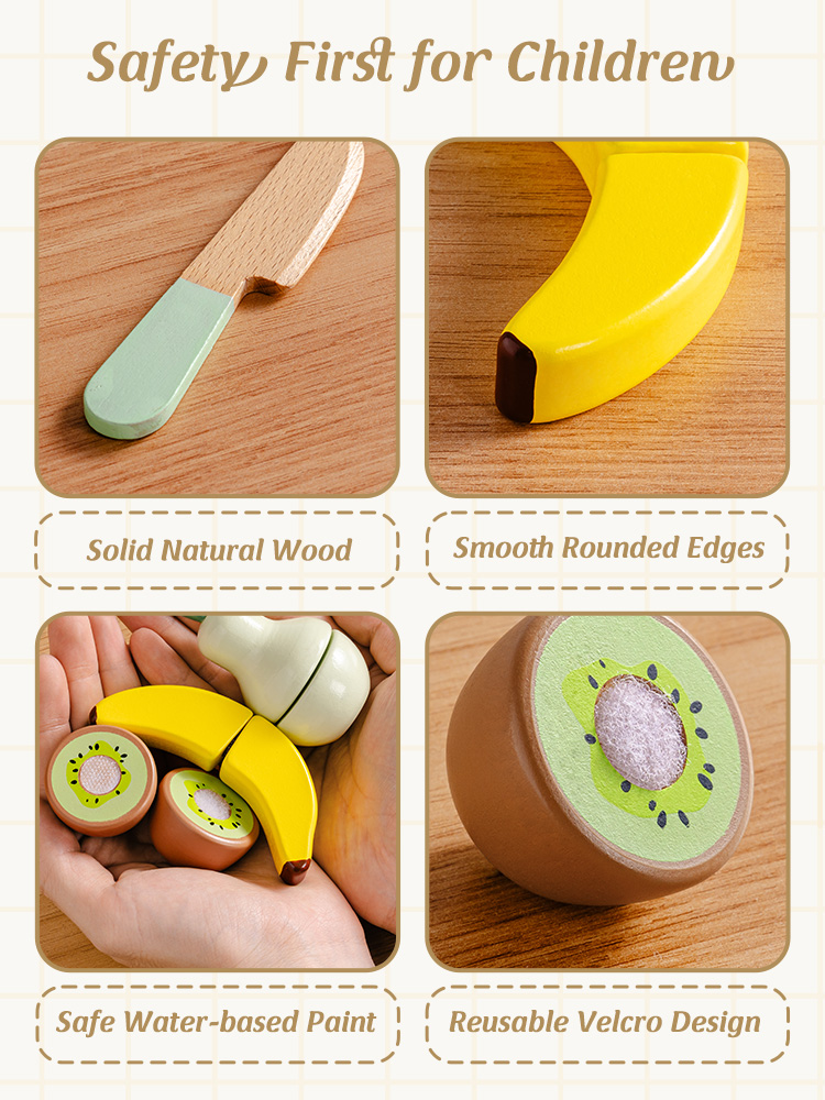 • Realistisches Schneide-Spielzeugessen: Jedes Obst und Brot kann „geschnitten“ und mit Klettverschluss wieder befestigt werden, was ein befriedigendes Schneidegeräusch erzeugt. Diese praktische Aktivität hilft Kindern, Koordination, Feinmotorik und Unabhängigkeit zu üben.