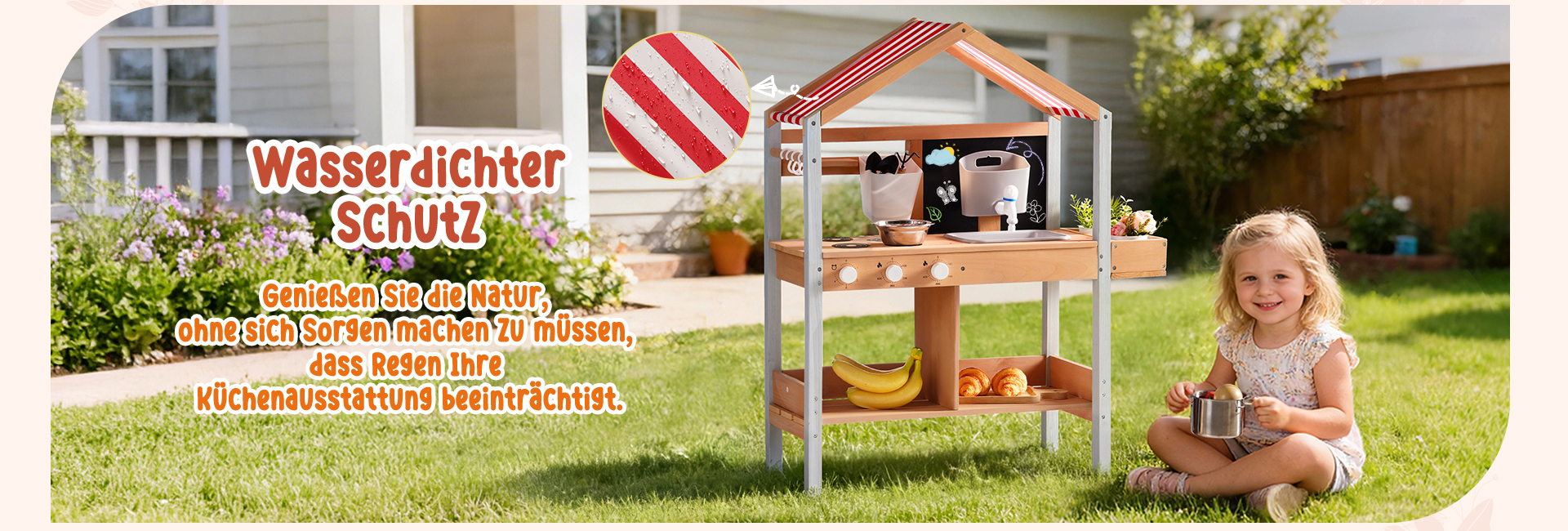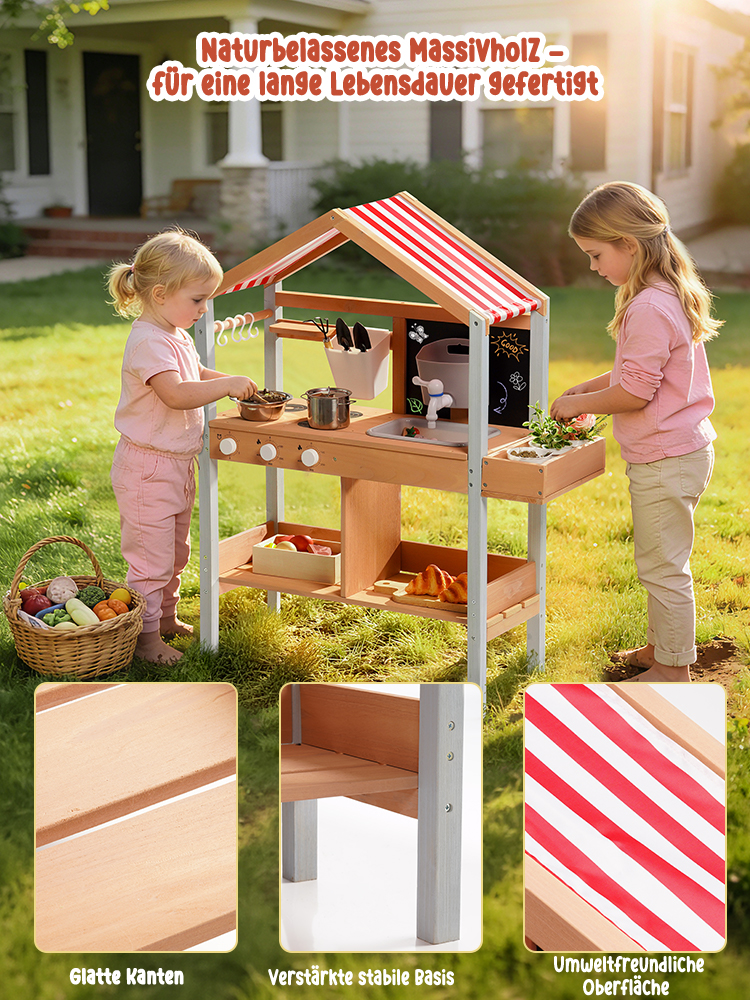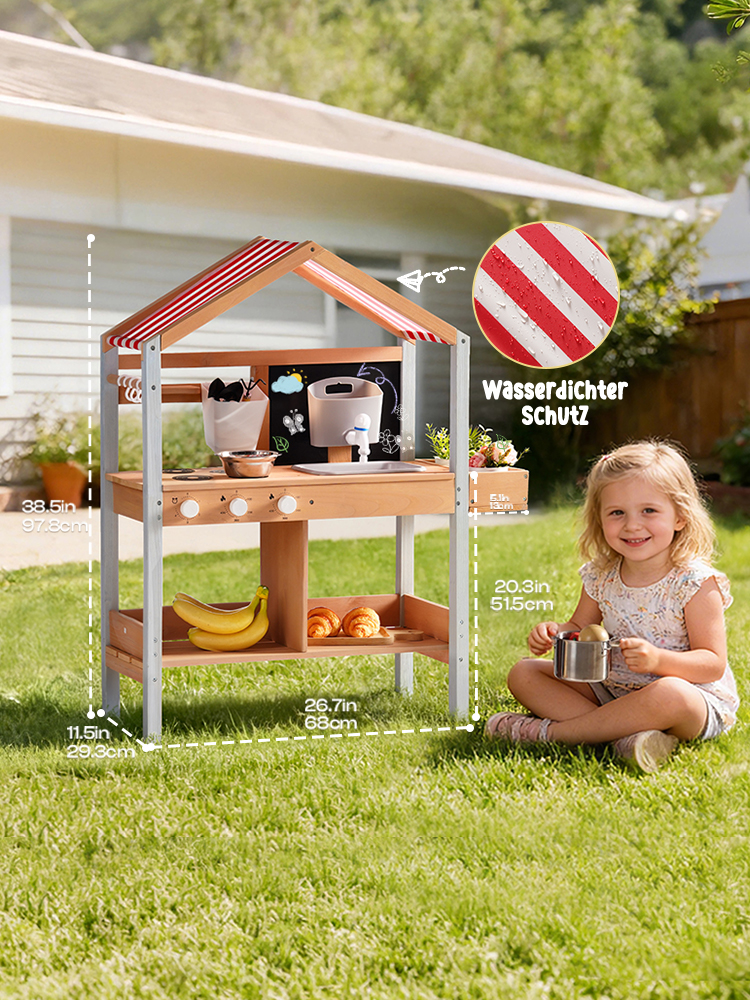 Sonnenschutzdach-Design--Das integrierte Dach bietet Schatten während des Spiels im Freien und schützt die Kinder vor direkter Sonneneinstrahlung, während es einen gemütlichen Raum für stundenlanges fantasievolles Kochen und Rollenspiel schafft.