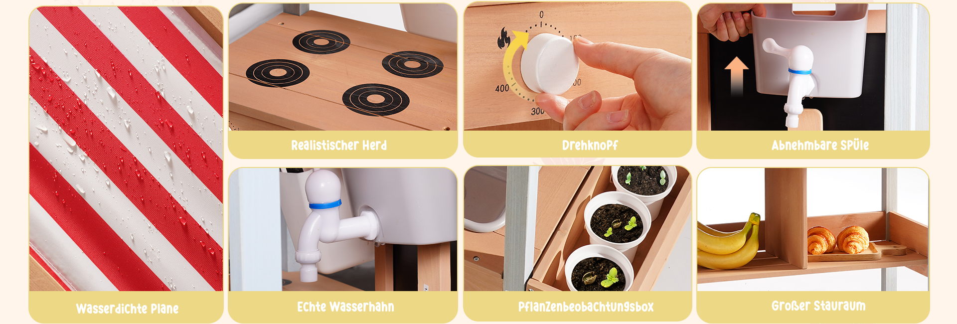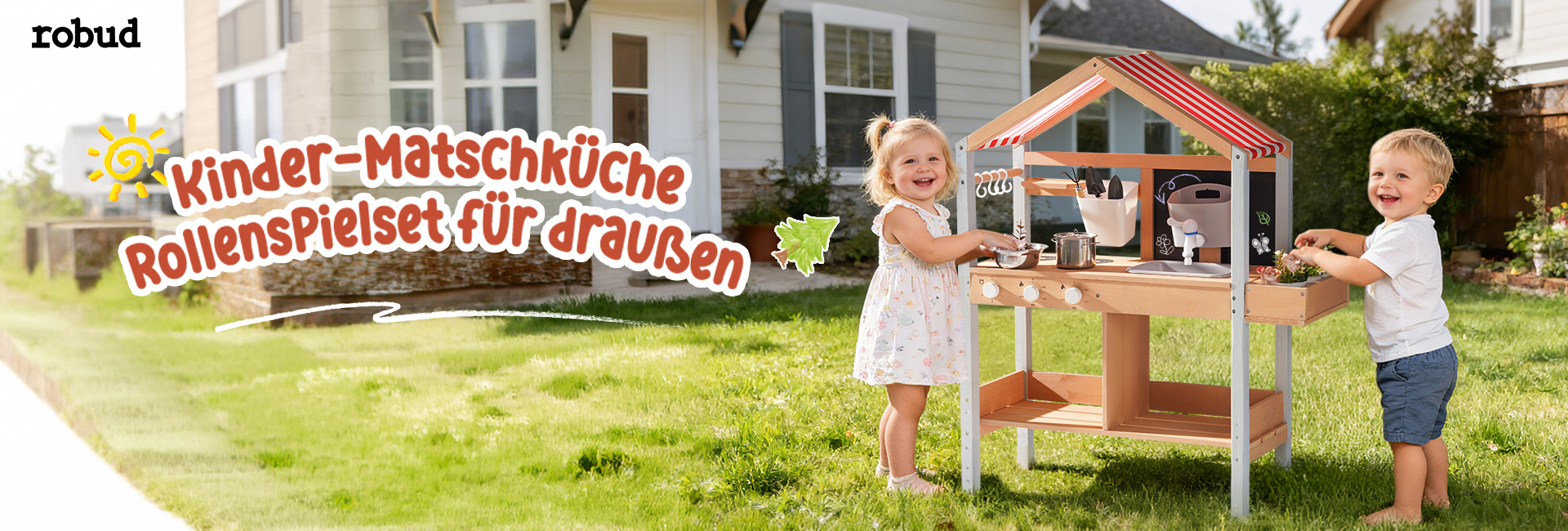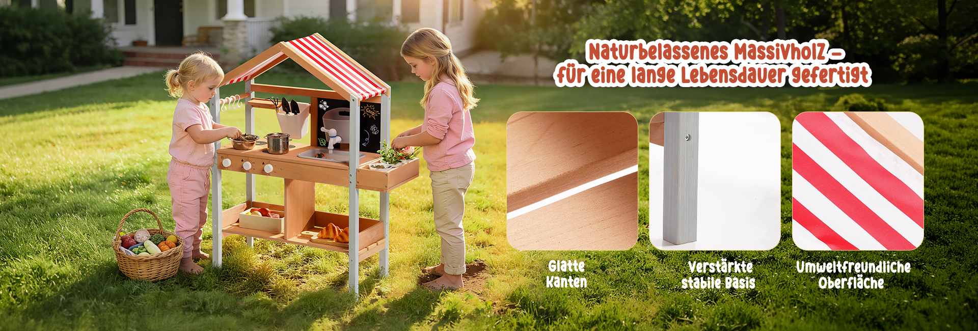 Sonnenschutzdach-Design--Das integrierte Dach bietet Schatten während des Spiels im Freien und schützt die Kinder vor direkter Sonneneinstrahlung, während es einen gemütlichen Raum für stundenlanges fantasievolles Kochen und Rollenspiel schafft.