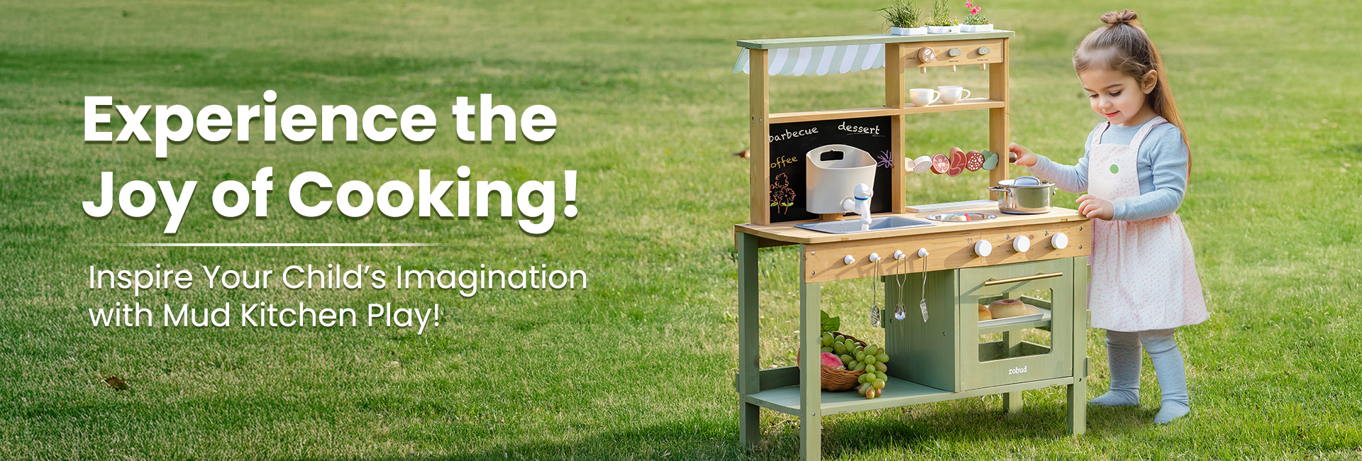 【Spielen Sie unter der Sonne】Die neue Outdoor-Matschküche von ROBUD ist darauf ausgelegt, Kinder zu inspirieren, nach draußen zu gehen, in der Sonne zu spielen und mit der Natur in Kontakt zu treten, während sie sich von elektronischen Geräten entfernen. Es ist der perfekte Weg, um gesundes, aktives und fantasievolles Spielen in einer digitalen freien Umgebung zu fördern.