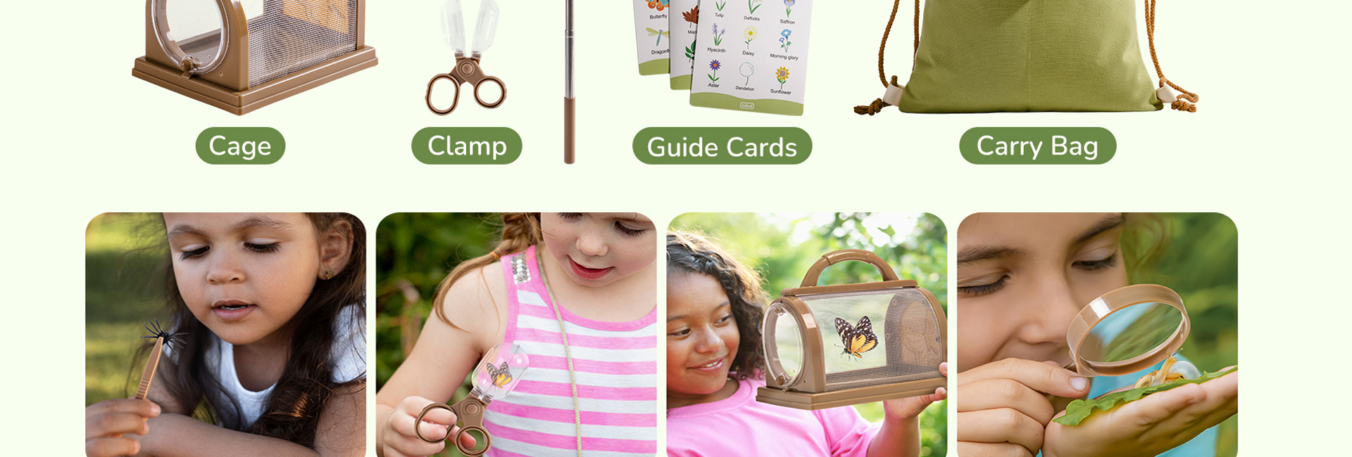 【All-in-One Abenteuer-Kit】 Dieses umfassende Set enthält eine Lupe für den Insektenbehälter*1, ein Set mit Anleitungskarten*1, einen Käfig*1, ein Teleskopnetz*1, eine Klammer*1, eine Pinzette*1, eine Lupe*1 und eine tragbare Tasche*1. Es hat alles, was Kinder brauchen, um in aufregende Abenteuer im Freien einzutauchen.