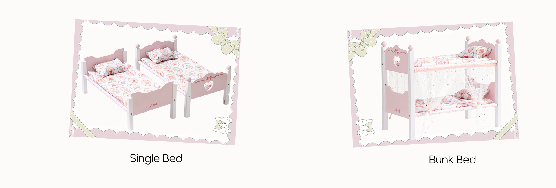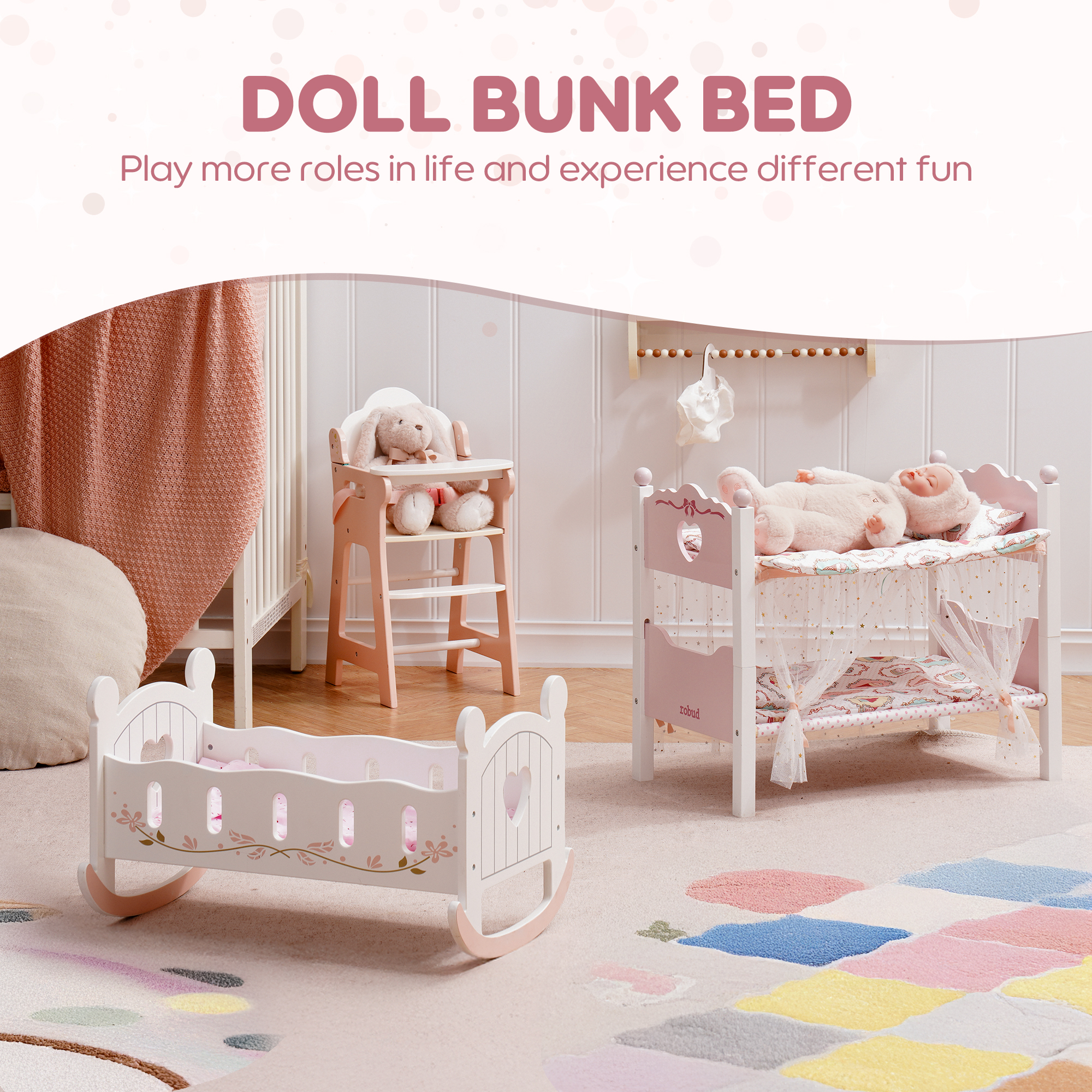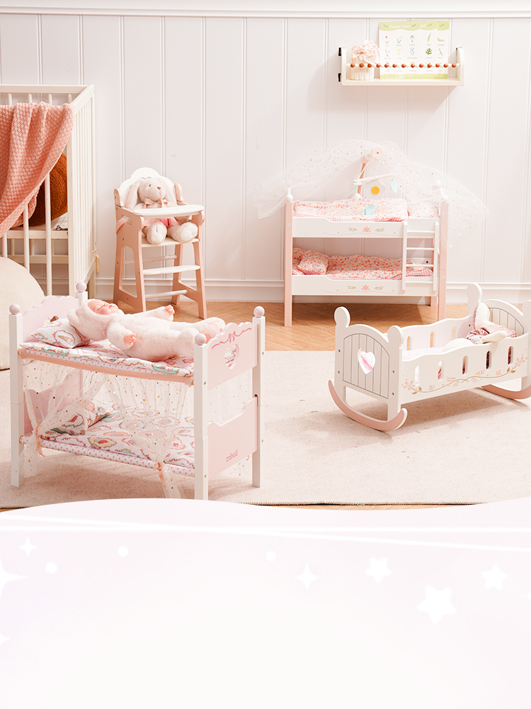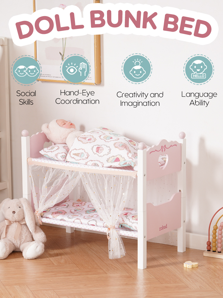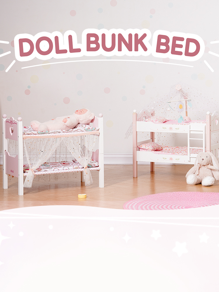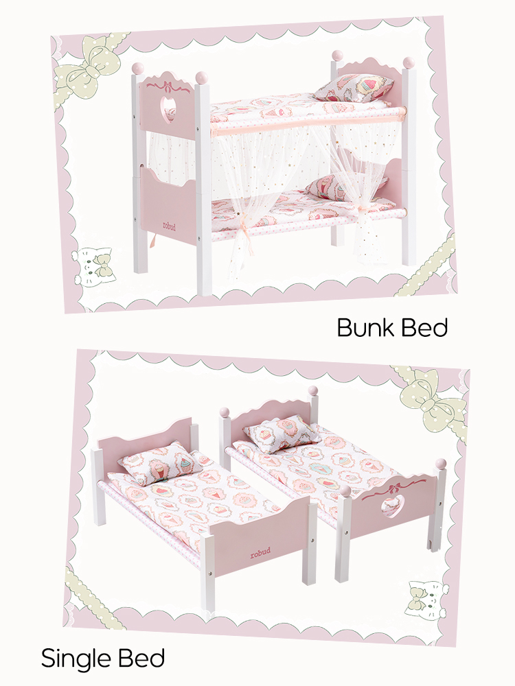 【2 IN 1 Puppenbett Set】Dieses vielseitige Etagenbett-Set ist für eine einfache Montage konzipiert und verfügt über einen abnehmbaren Gaze-Vorhang, der eine realistische Miniaturversion eines vollwertigen Etagenbettes bietet. Kinder können während der Spielzeit Spaß haben.