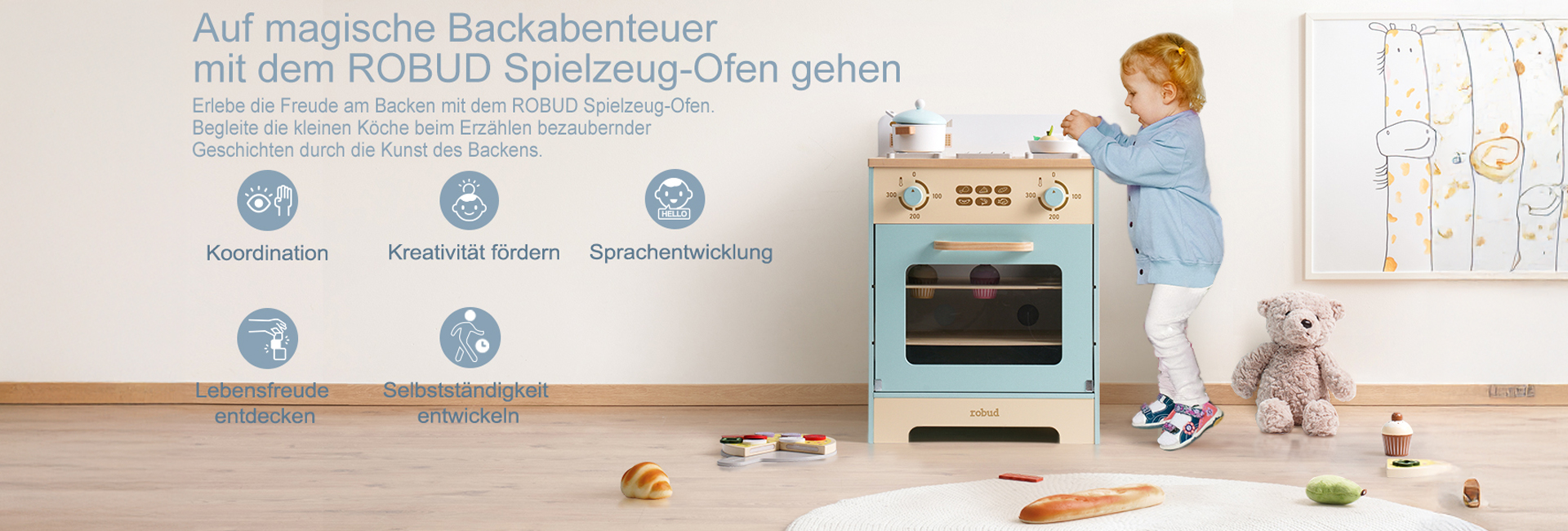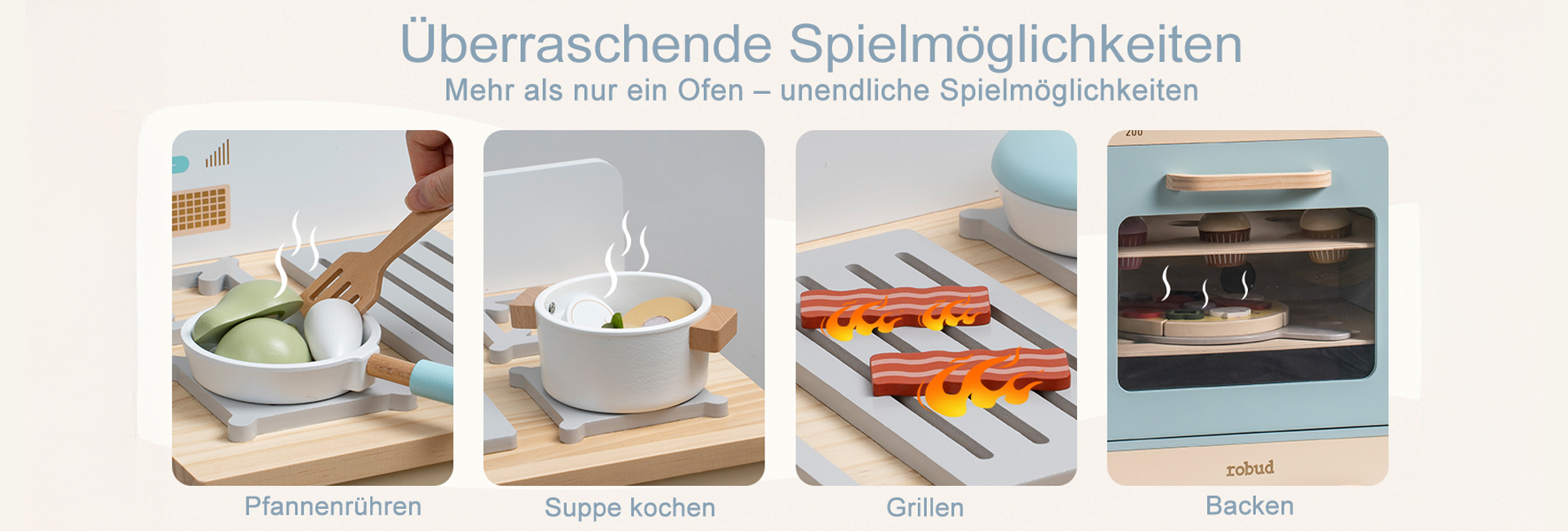 GESCHMIEDETES DESIGN: Der ROBUD Spielofen ist mit sorgfältiger Liebe zum Detail und grenzenloser Kreativität gestaltet. Jedes Detail, von seinem niedlichen Aussehen bis zu seinen realistischen Funktionen, wurde sorgfältig geformt, um während des Spielens ein Gefühl von Stil und Wärme für Kinder zu wecken.