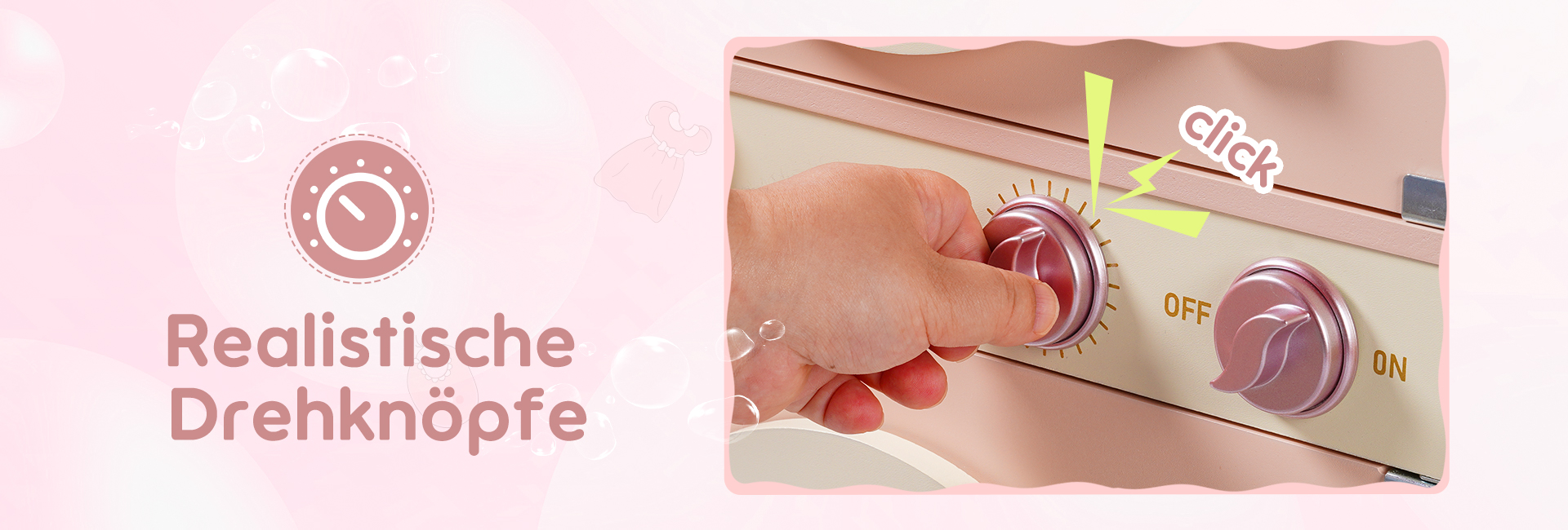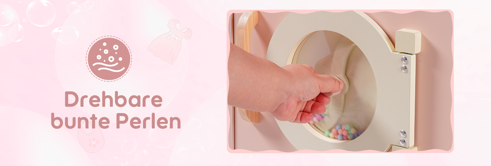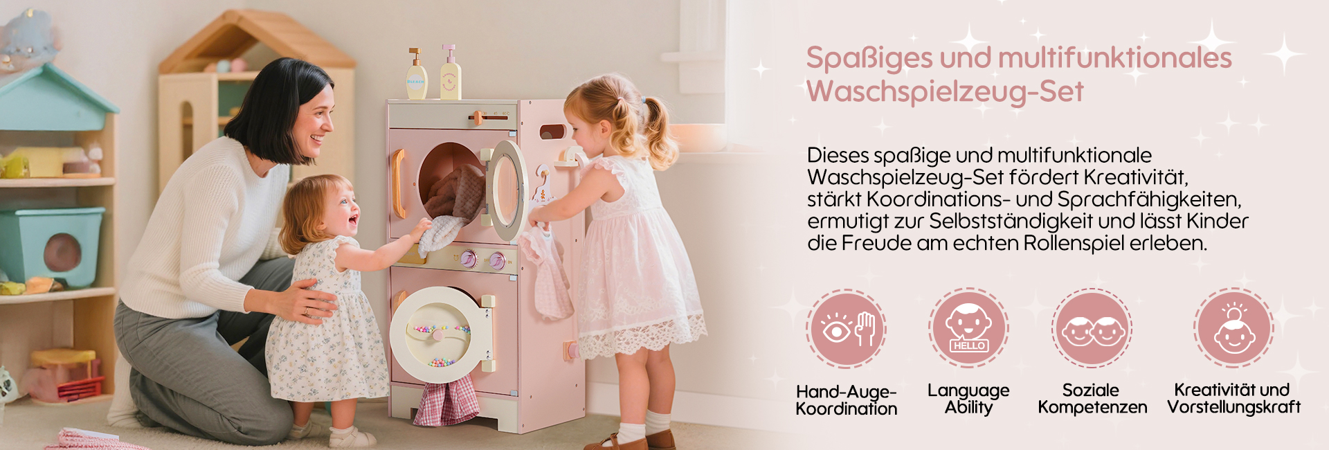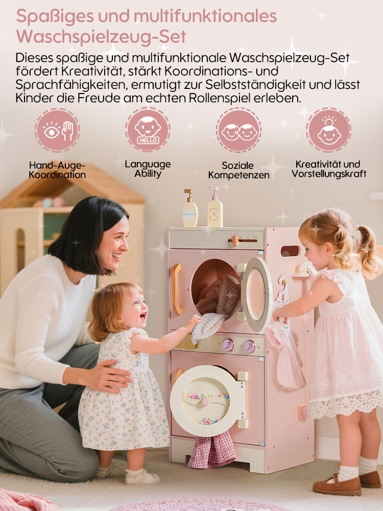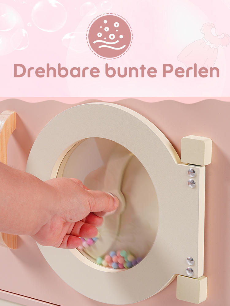 🐋Realistisches Design: Diese Waschmaschine ist in der Form einer echten Wasch- und Trockenmaschine gestaltet. Ihr niedliches Aussehen sowie die manuell beweglichen bunten Perlen am Fenster der Waschmaschine simulieren die rollende Bewegung der Waschmaschine, was den Kindern einen visuellen Schock bietet. Sie ist mit einem Wäschekorb, Seife, Bleichmittel und Waschmittel ausgestattet, um das Spielerlebnis zu verbessern. Darüber hinaus verfügt sie auch über eine Bügelfunktion, die die Waschmaschine vielseitiger macht.