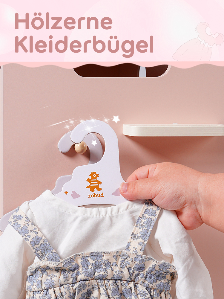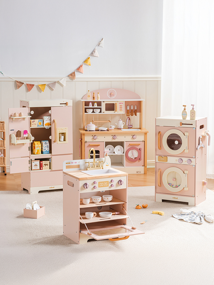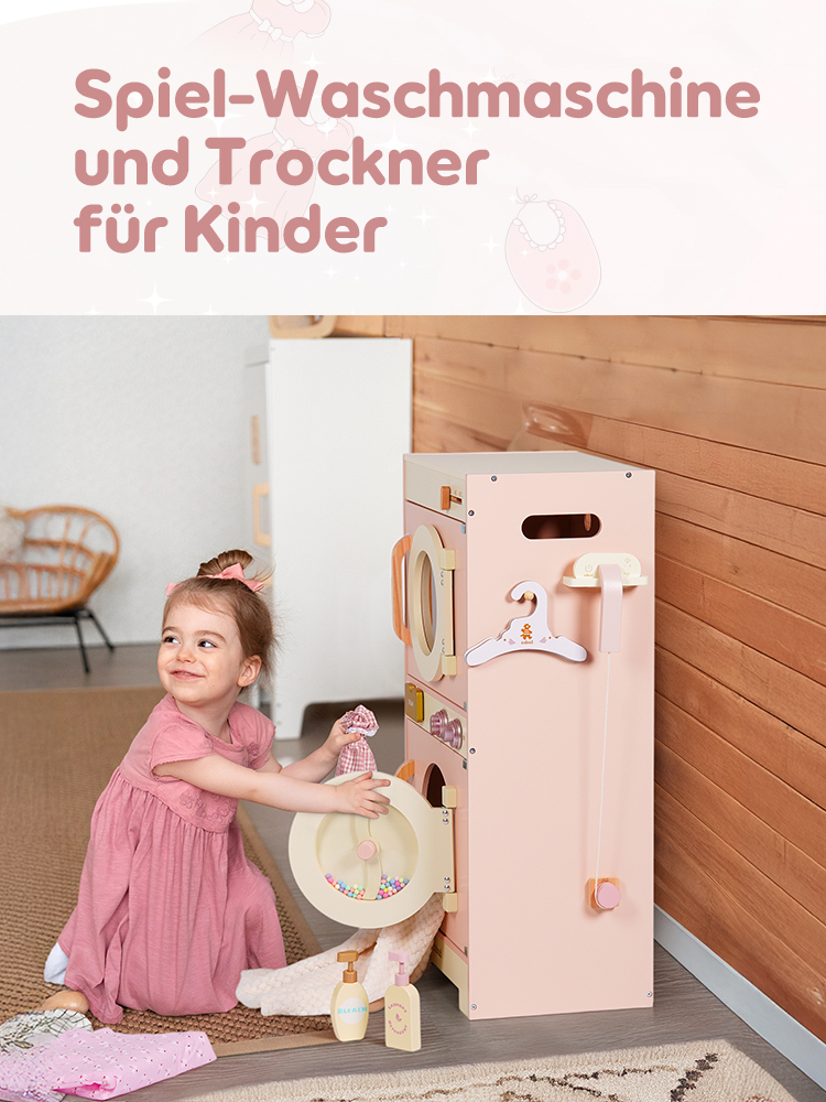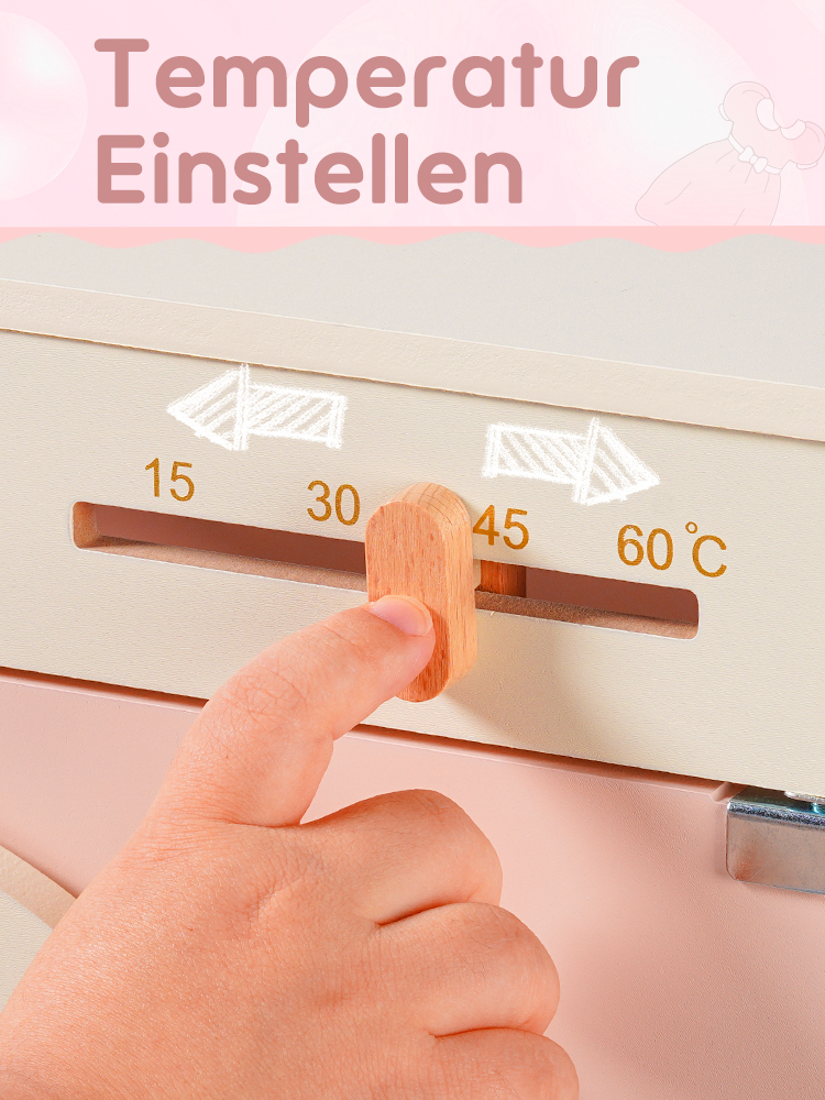 Mit dieser Holzwaschmaschine können Kinder das Waschen simulieren. Die Tür lässt sich leicht öffnen und gibt den Blick auf einen geräumigen Innenraum frei, der leicht zugänglich ist. Darüber befindet sich ein Trockner, und ein Drehregler oben rechts regelt die Temperatur. Regale und Zubehör sorgen für einen Hauch von Realismus.