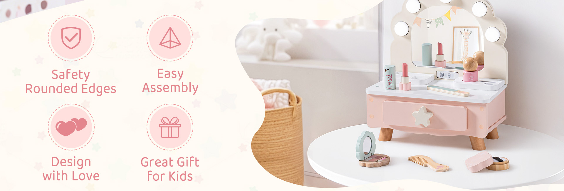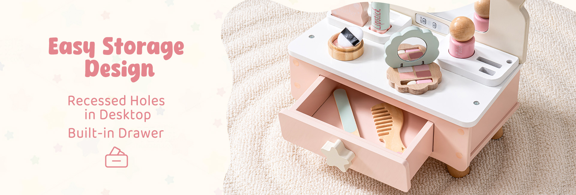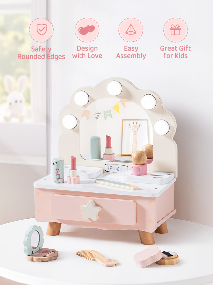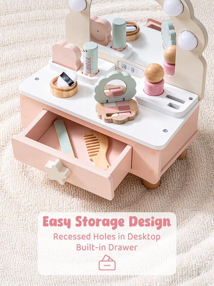 Einfache Aufbewahrung und sauberes Spielen: Der Holzwaschtisch verfügt über eine geräumige integrierte Schublade und versenkte Tischschlitze, die die perfekte Aufbewahrung für alle Beauty-Accessoires bieten. Kein unordentliches Spielen mehr – alles hat seinen Platz, und Ihr kleiner Liebling kann sein Spielzeug nach jeder Spielsitzung organisiert aufbewahren.