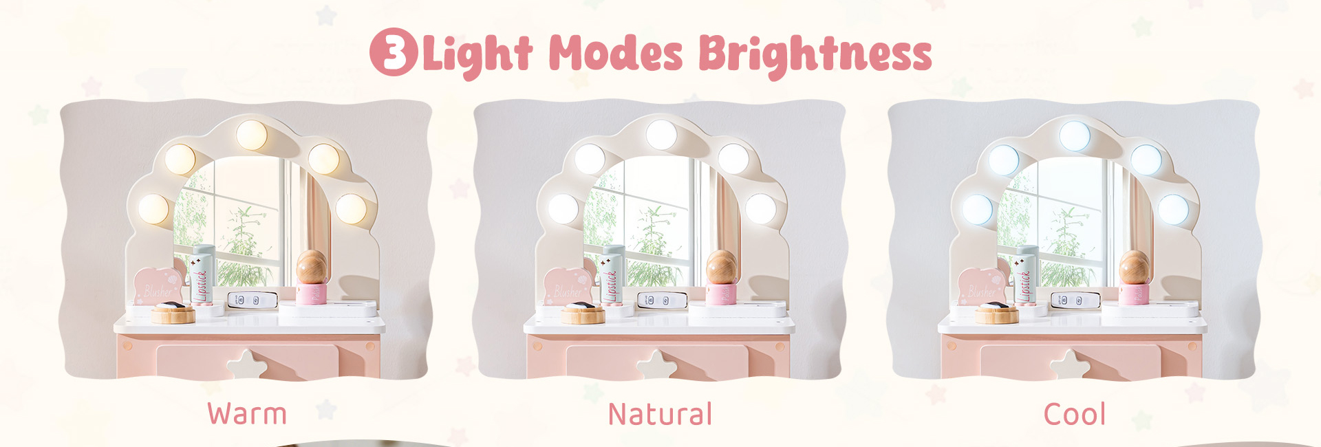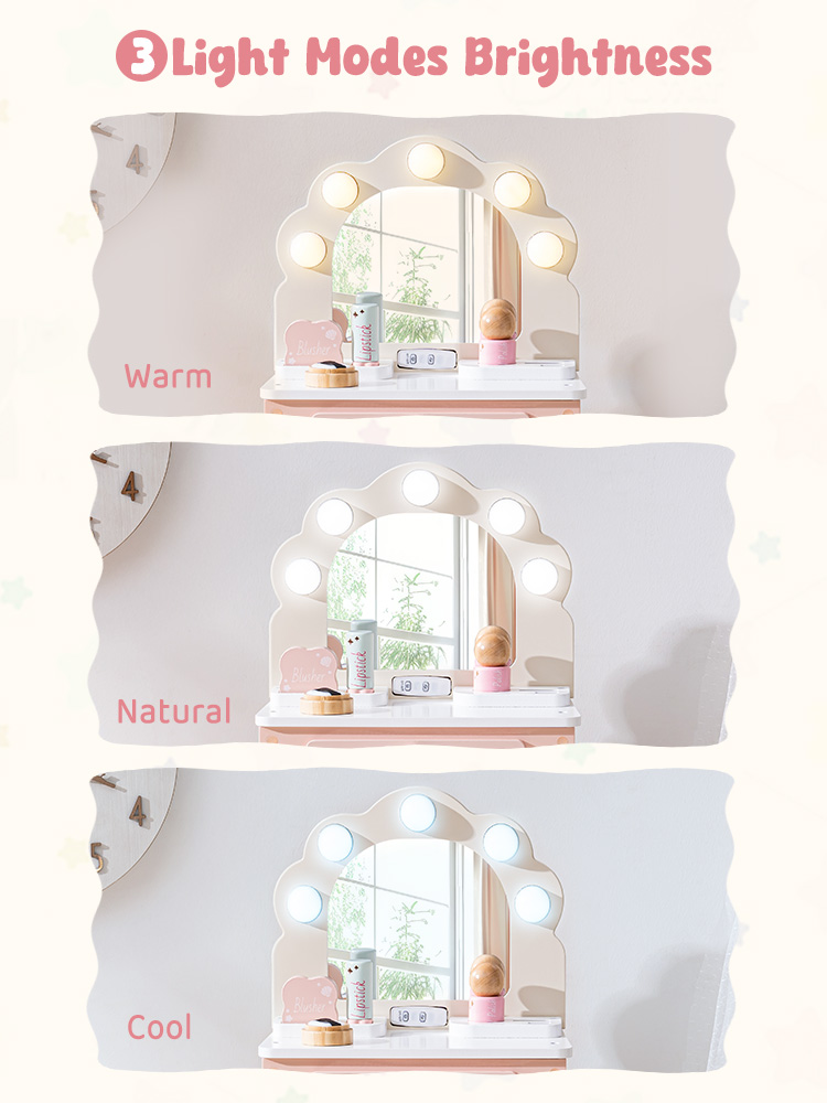 Magischer beleuchteter Spiegel – Der schalenförmige Kosmetikspiegel verfügt über 3 einstellbare Lichtmodi – warm, natürlich und kühl. Ihr Kind kann zwischen den Einstellungen wechseln, um seiner Stimmung oder Spielzeit zu entsprechen, sodass es sich jedes Mal wie ein Star mit der perfekten Beleuchtung fühlt (keine Batterien erforderlich. Enthält einen Typ-C-Adapter zur Verwendung über eine Powerbank oder ein Wandladegerät).