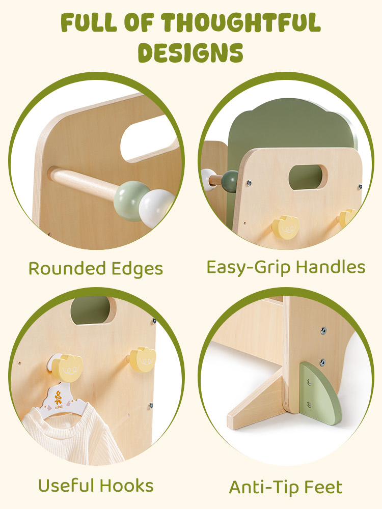 • Rollenspiel und Spielspaß---Wenn die Kinder etwas älter werden, können die beiden Fußböden als Regale verwendet werden, wodurch der Turm in einen kleinen Laden verwandelt wird. Kinder können auf dem Hocker sitzen, Produkte „verkaufen“ und fantasievolles Rollenspiel genießen. Dieses kreative Setup macht den Turm nicht nur zu Möbeln, sondern zu einem langlebigen Spielzeug von großem Wert.