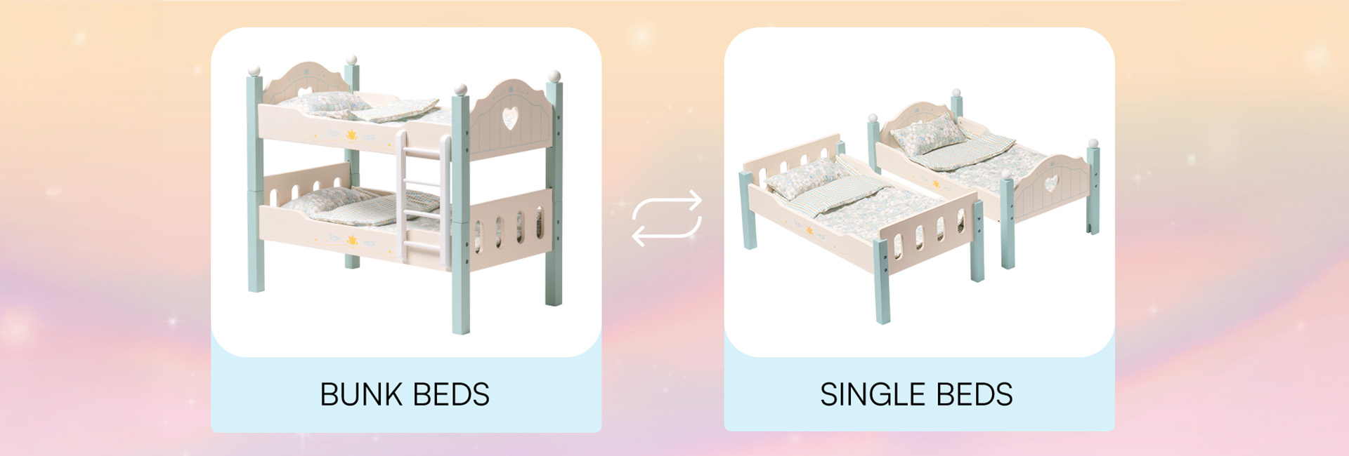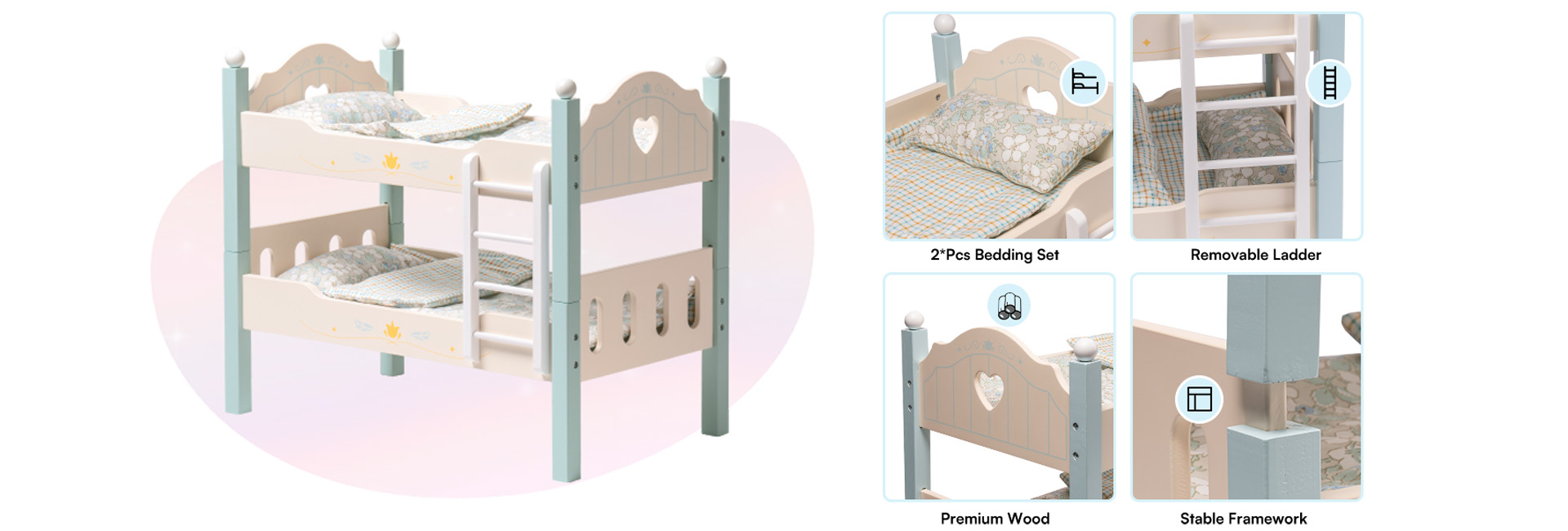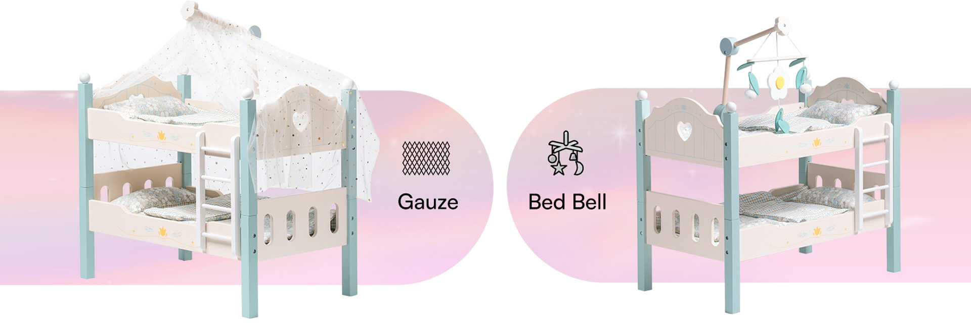 💖【Exquisites und bezauberndes Design】💗Das Etagenbett-Design ermöglicht Spielzeit für mindestens 2 Puppen gleichzeitig. Unser Puppenbett mit wunderschöner Bettglocke und Netzstoff schafft eine warme Atmosphäre, verfügt über ein herzförmiges Kopfteil und bezaubernde Muster und verleiht jedem Spielzimmer eine elegante Note. Dieses Babypuppenbett regt zum fantasievollen Spielen an und verwandelt gewöhnliche Spielstunden in außergewöhnliche Abenteuer.