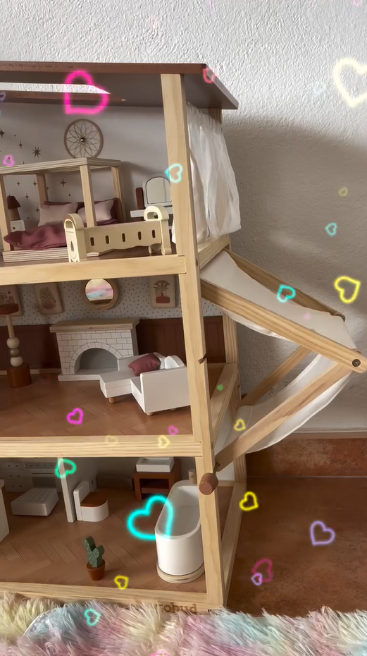 Bohemian Design mit detaillierten Räumen: Dieses ROBUD Holzpuppenhaus zeichnet sich durch einen einzigartigen Bohemian-Stil aus, der mit lebhaften Farben und komplizierten Mustern versehen ist. Drinnen entdecken die Kinder wunderschön gestaltete Räume, darunter ein Wohnzimmer, eine Küche und ein Schlafzimmer, die fantasievolles Spielen fördern.