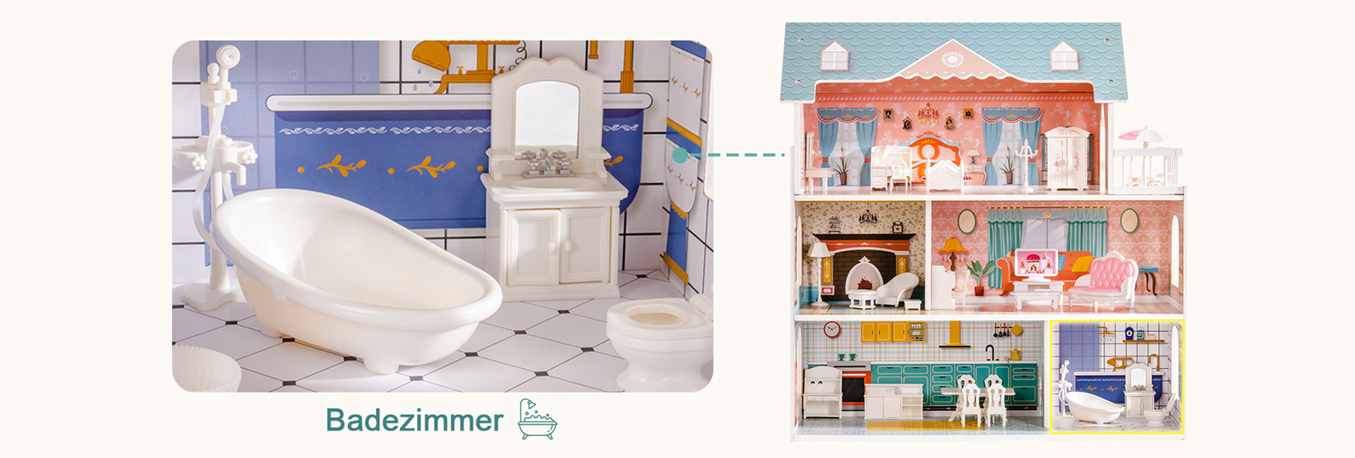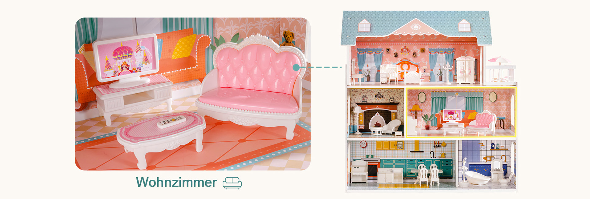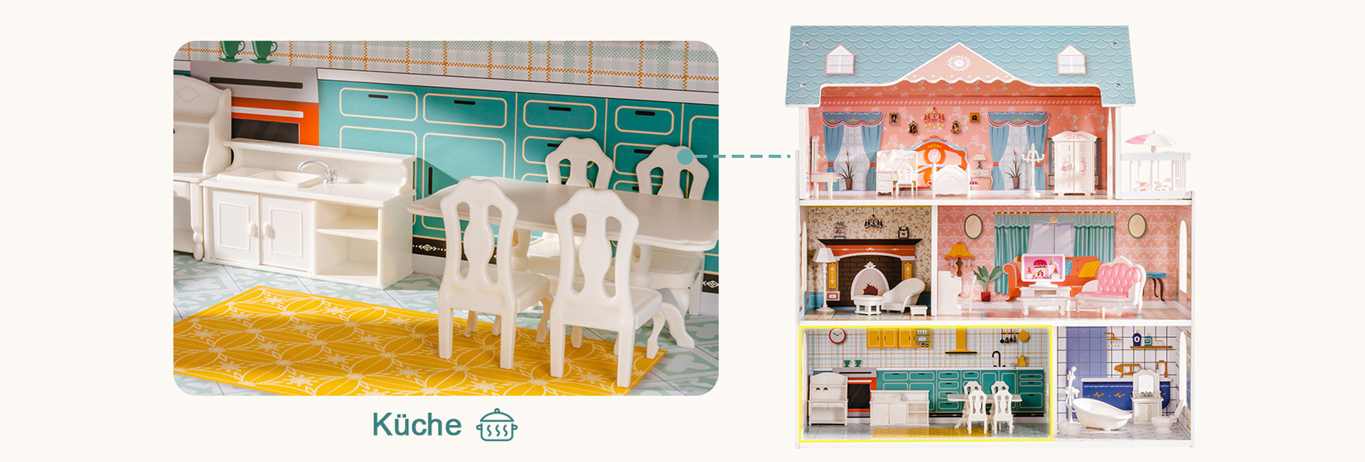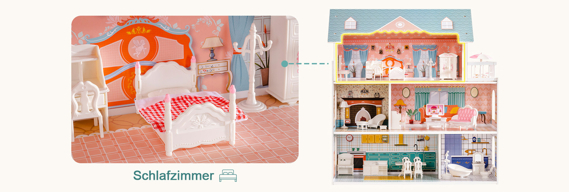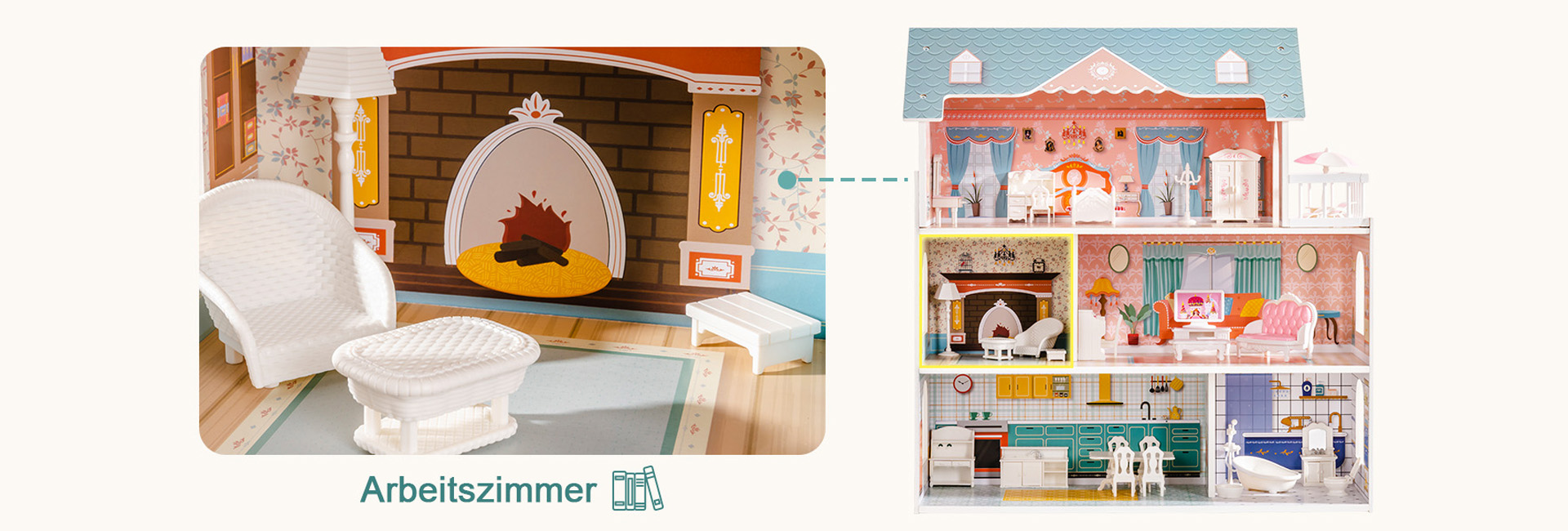 ERSTAUNLICHE TAPETE UND DEKORATION: Das Holzpuppenhaus jedes Zimmers ist sehr bunt und mit vielen Details illustriert, was es realistisch genug macht, um die Fantasie anzuregen.