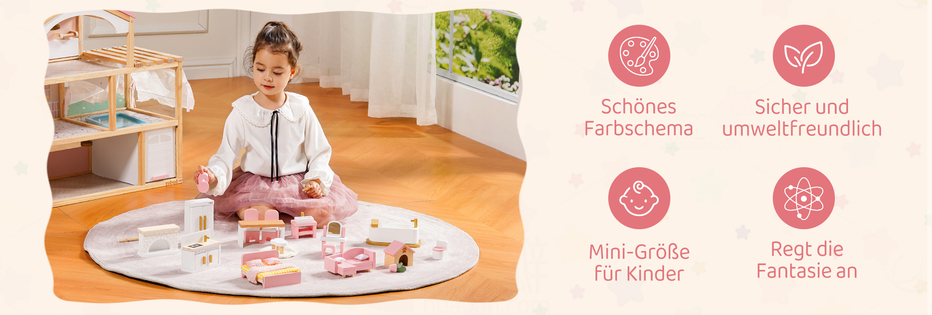 Dieses hochwertige Puppenhaus-Minimöbelset umfasst ein Wohnzimmer, ein Schlafzimmer, ein Badezimmer, eine Küche und ein Esszimmer. Gefertigt aus erstklassigen Materialien, schützt es die unbeschwerte Kindheit von Kindern. Jedes Detail ist voller Fantasie und Kreativität und sorgt für endlosen Spielspaß. Von sanften Farben bis hin zu niedlichen Formen – alles ist darauf ausgelegt, die Fantasie der Kinder anzuregen und ihr Spielvergnügen zu steigern.