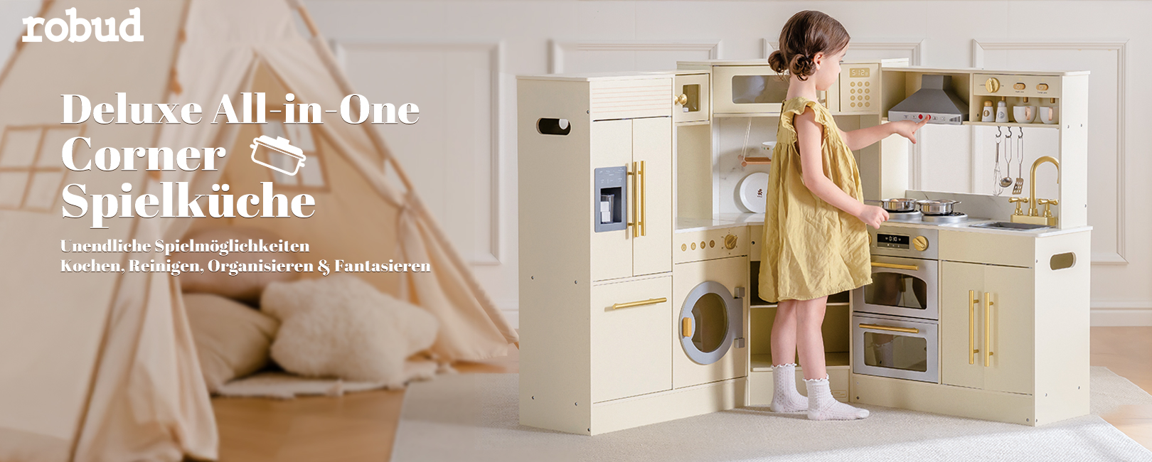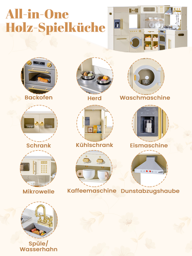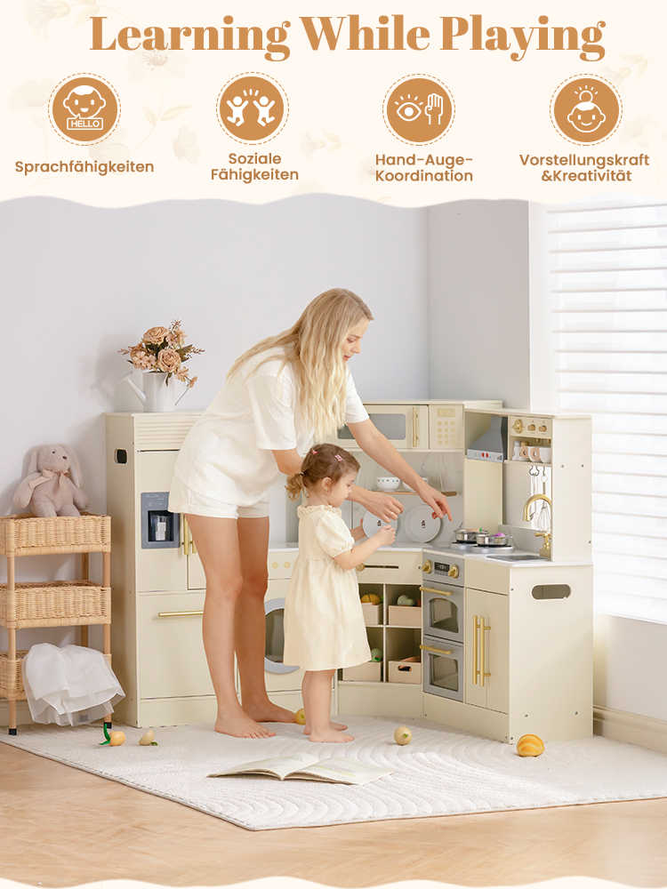 - ALL-IN-ONE HOLZ SPIELKÜCHE SET: Diese Deluxe-Eckspielküche kombiniert einen Kühlschrank, einen Ofen, ein Waschspielset und einen Stauraum, gefertigt aus robustem Holz. Es ist das perfekte Rollenspielzentrum für Kinder ab 3 Jahren und bietet durch mehrere funktionale Zonen ein realistisches Kocherlebnis.