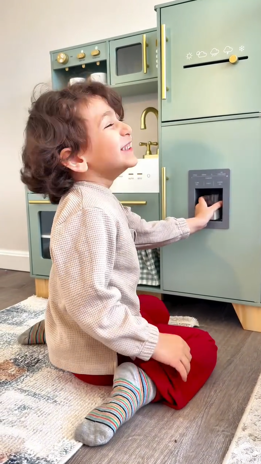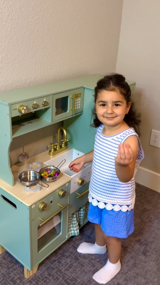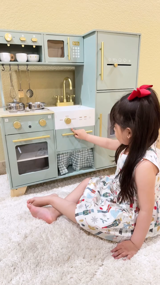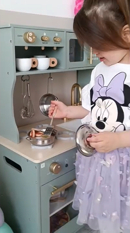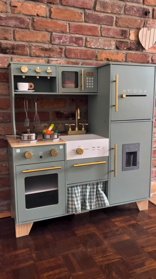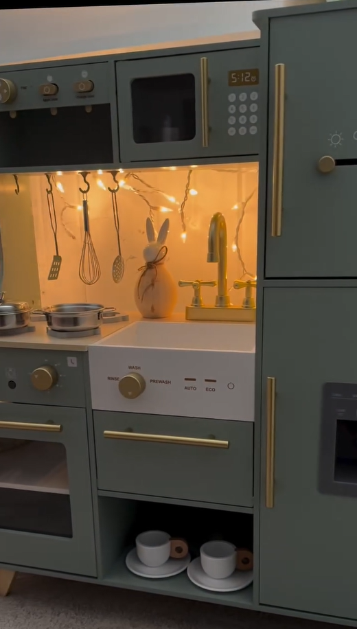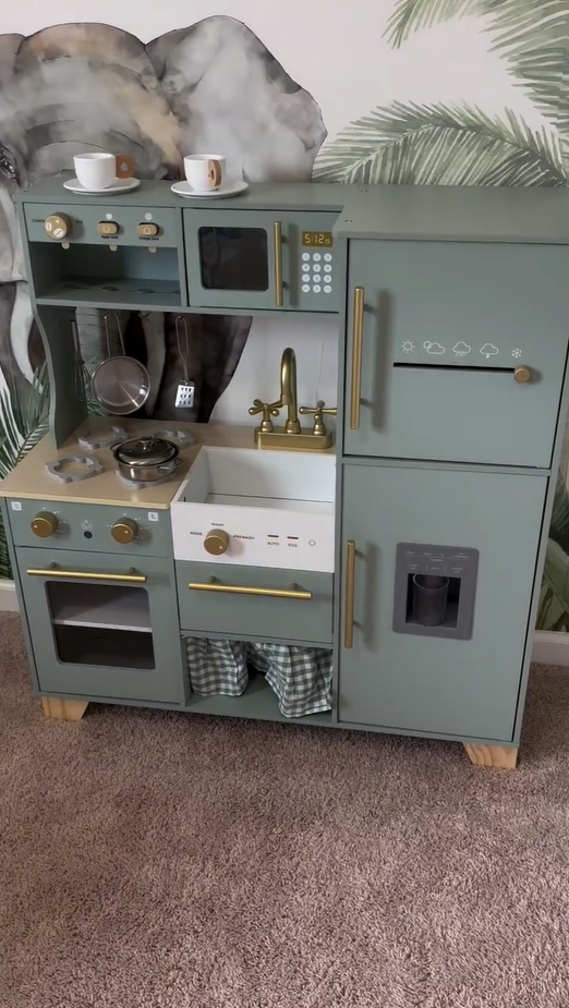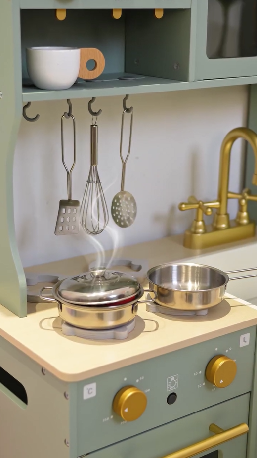 Ein exquisiter Spielbereich: Diese grüne Kinderküche mit goldenen Griffen und Zubehör ist sowohl natürlich als auch elegant. Die glatten Kanten und das leichte, langlebige Kochgeschirr sorgen dafür, dass Kinder sicher spielen können. Alle Produkte und Zubehörteile haben glatte, gratfreie Oberflächen, sodass die Kinder glücklich und sicher spielen können. Die Küche ist mit hohlen Griffen auf beiden Seiten gestaltet, was das Bewegen und Spielen überall im Haus erleichtert.