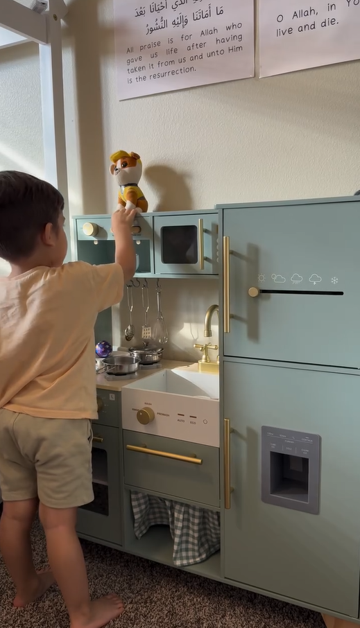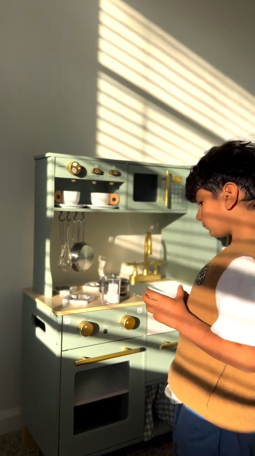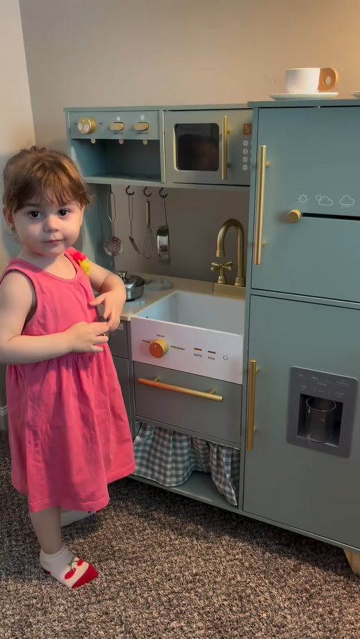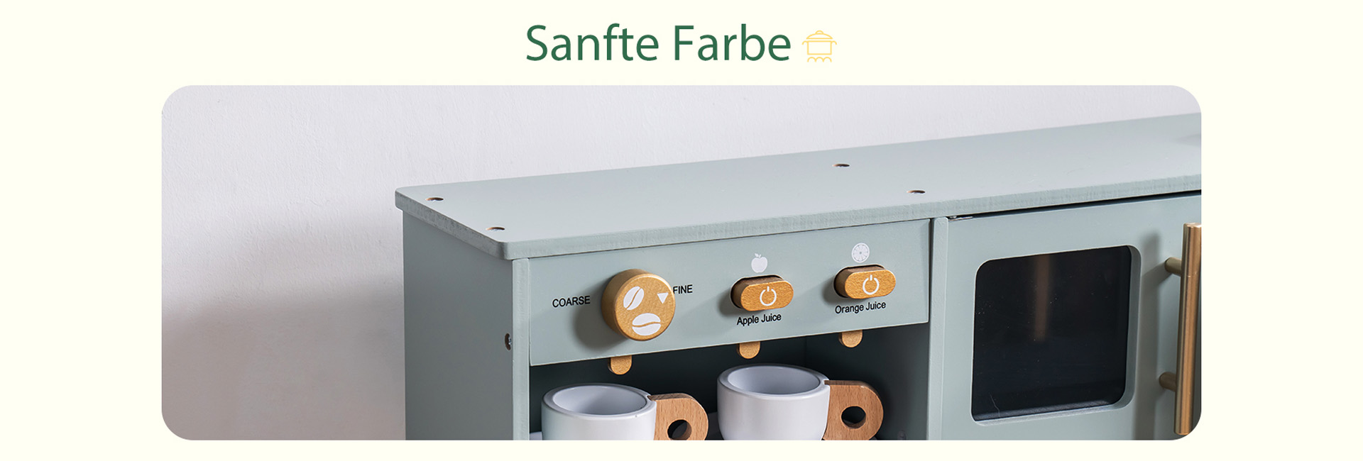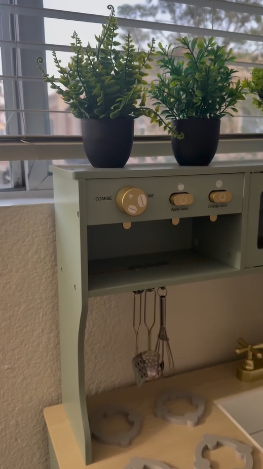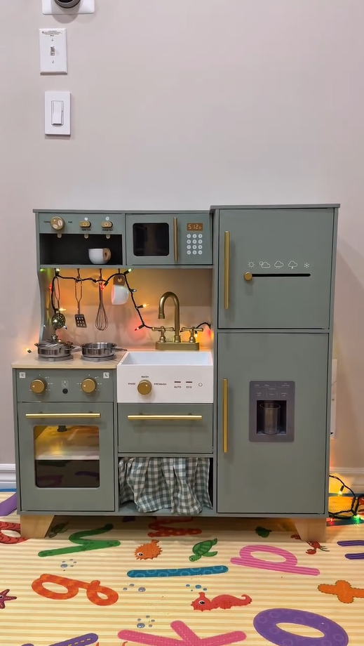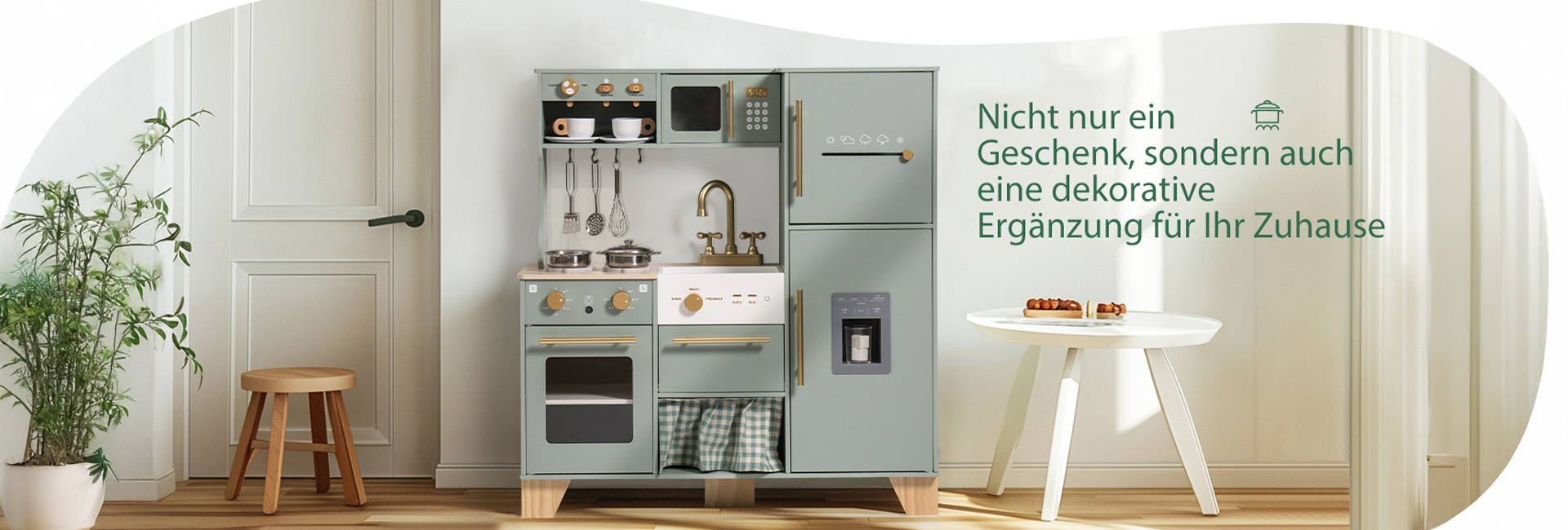 Ein exquisiter Spielbereich: Diese grüne Kinderküche mit goldenen Griffen und Zubehör ist sowohl natürlich als auch elegant. Die glatten Kanten und das leichte, langlebige Kochgeschirr sorgen dafür, dass Kinder sicher spielen können. Alle Produkte und Zubehörteile haben glatte, gratfreie Oberflächen, sodass die Kinder glücklich und sicher spielen können. Die Küche ist mit hohlen Griffen auf beiden Seiten gestaltet, was das Bewegen und Spielen überall im Haus erleichtert.