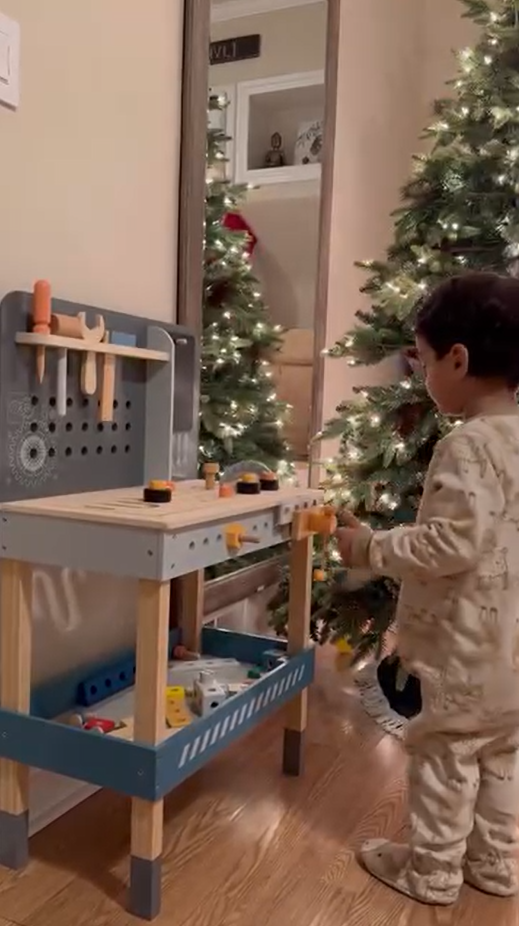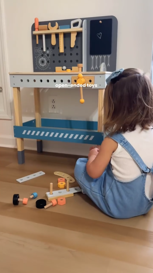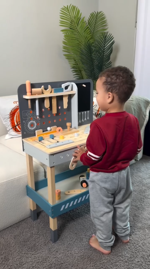 LAGERUNGSKOMFORT: Die Holzwerkbank enthält ein praktisches Regal und eine Aufhängestange zum Sammeln aller Teile, um Kinder zu ermutigen, gute Gewohnheiten beim Organisieren von Spielzeug zu entwickeln.