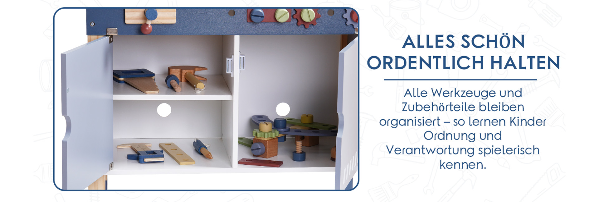Bunte Werkzeuge, endloser Spaß: Mit hellen, fröhlichen Farben und einem reichen Set realistischer Zubehörteile regt jedes Werkzeug und Zahnrad auf der Werkbank die Fantasie an. Kleine Hände können nach Herzenslust drehen, wenden und bauen und ihre kreativen Ideen zum Leben erwecken! Der geräumige Schrank bietet ausreichend Stauraum und ermutigt die Kinder, ihre Werkzeuge und Spielzeuge selbst zu organisieren.