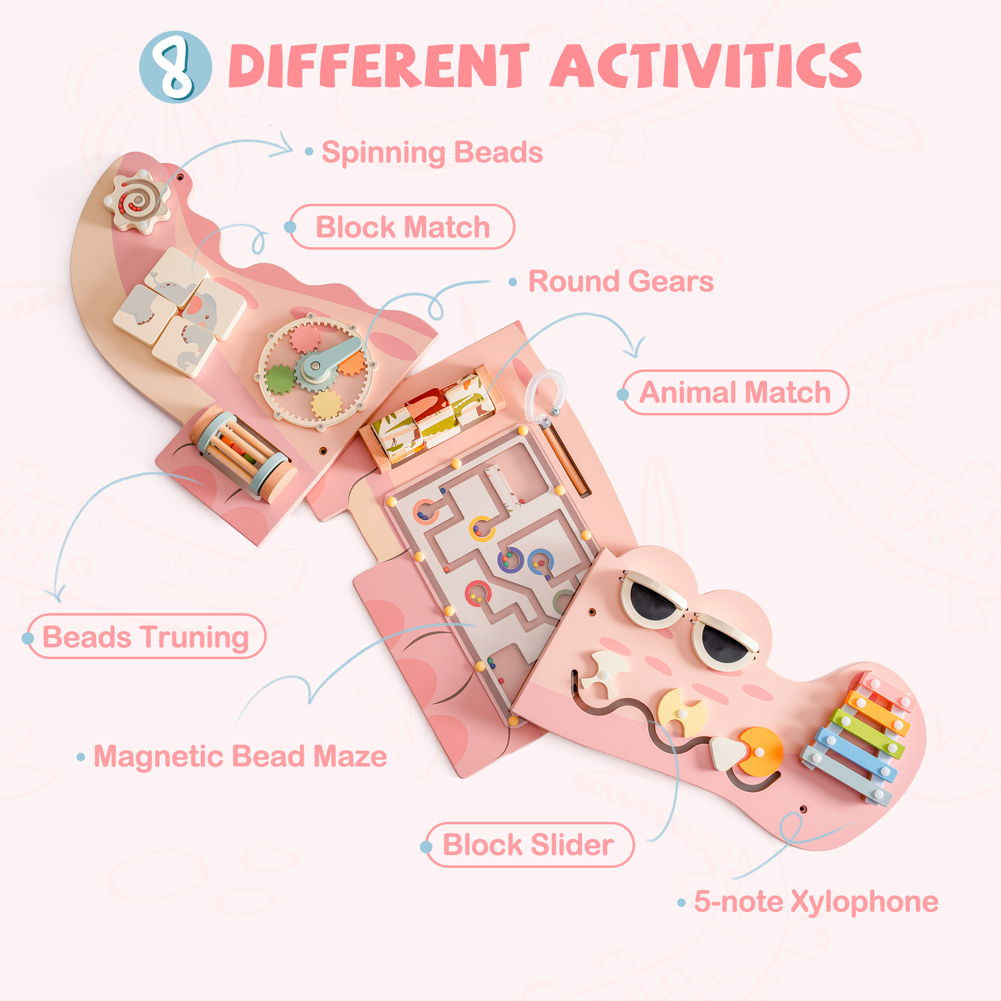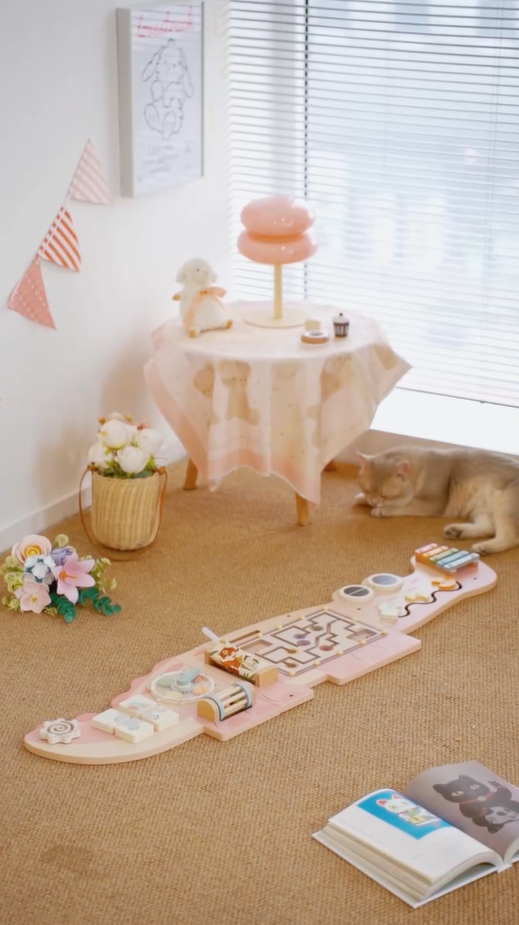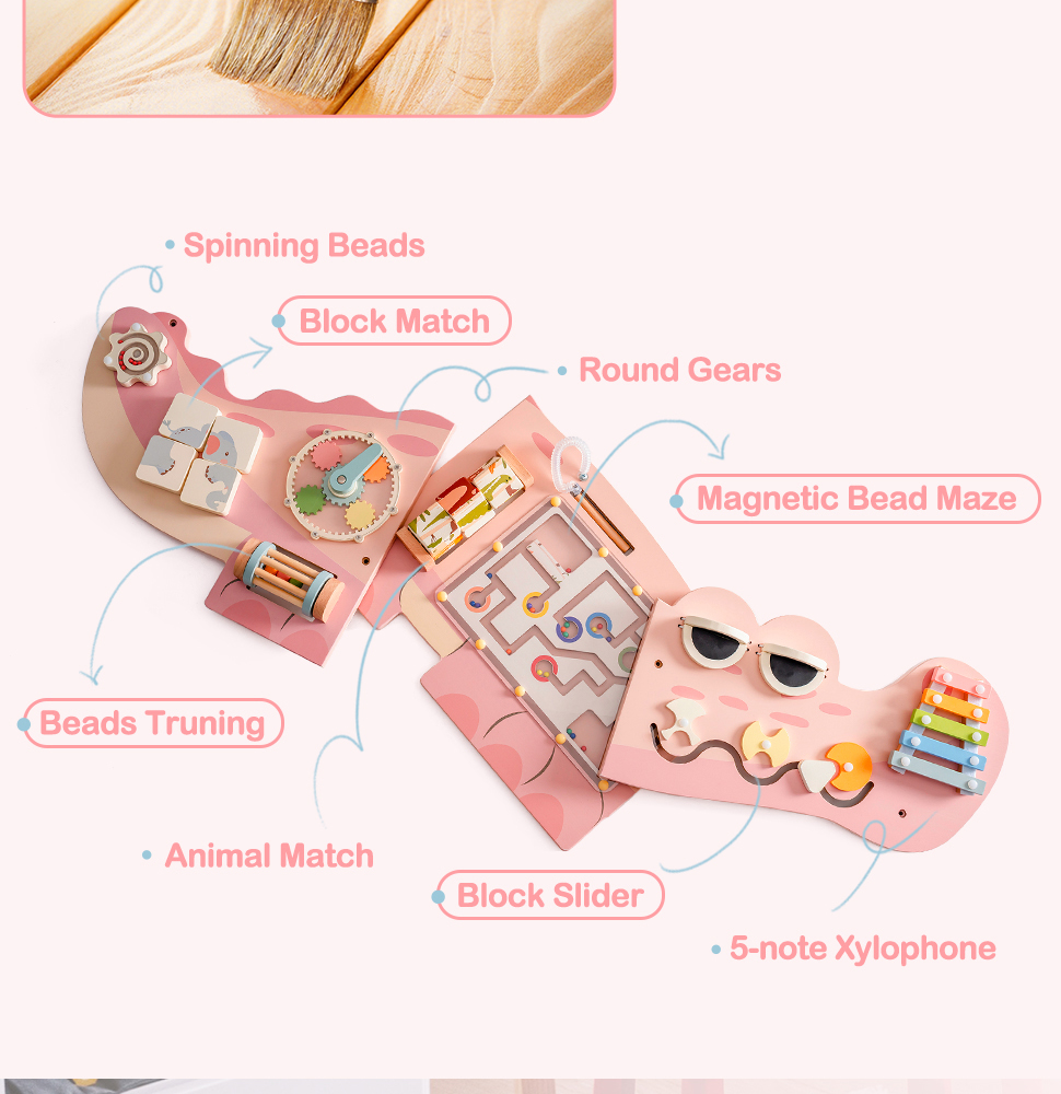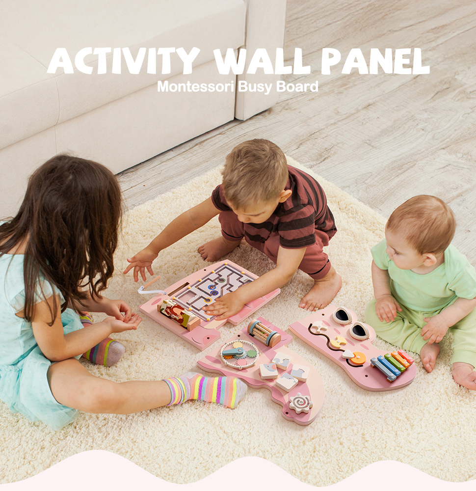 Interaktive Wandmontierte Beschäftigungsboard - Dieses vielseitige Beschäftigungsboard bietet eine Vielzahl von ansprechenden Aktivitäten, darunter ein drehendes Perlenlabyrinth, Blockzuordnung, kreisförmige Zahnräder, magnetisches Perlenlabyrinth, ein 5-Ton-Holz-Xylophon und mehr. Jede Aktivität ist darauf ausgelegt, verschiedene Aspekte der Entwicklung eines Kindes zu stimulieren, was es zu einem idealen Bildungswerkzeug für jeden Spielbereich macht.