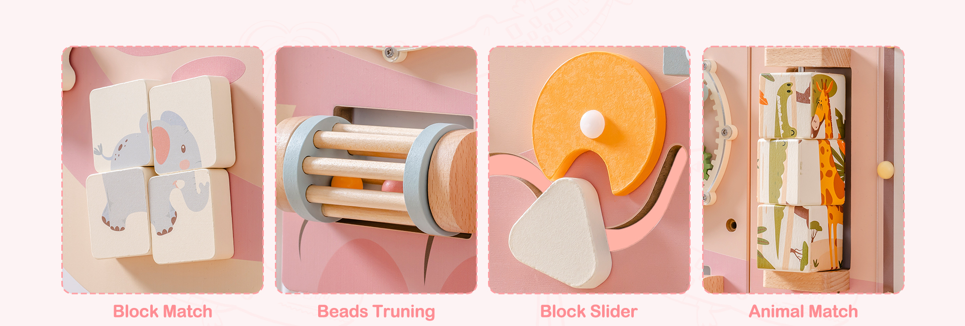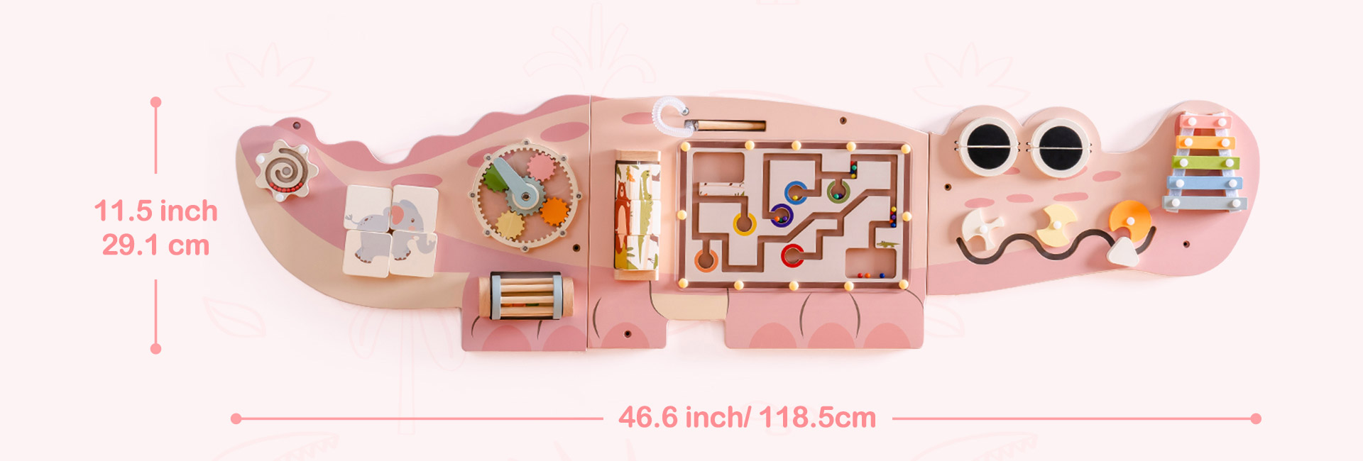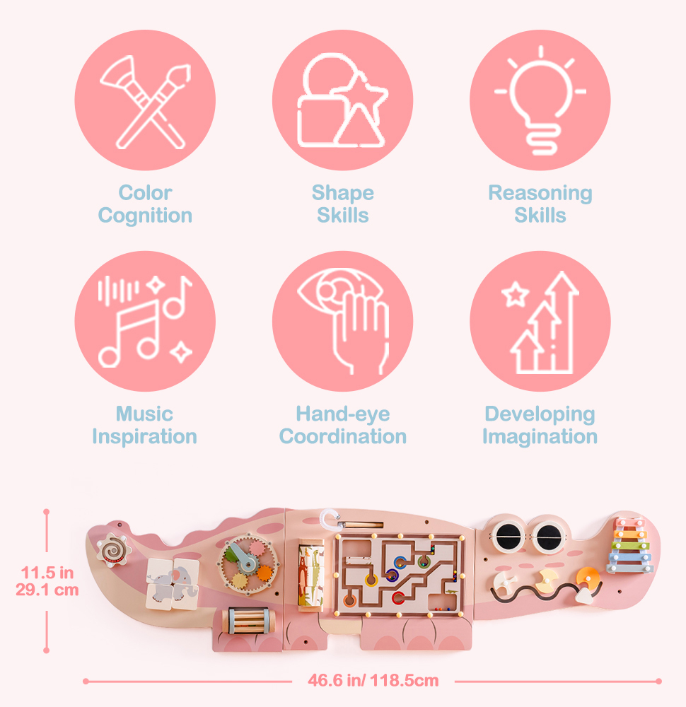 Dieses interaktive und unterhaltsame Montessori-Sensorik-Wandspielzeug wurde für Kinder ab 3 Jahren entwickelt. Es lässt Ihrer Fantasie freien Lauf. Es hat die Form eines kleinen Krokodils und ist hauptsächlich in leuchtendem Rosa gehalten, das mit hellem Blau verschönert wird. Es ist frisch und sanft und schafft eine warme, lebendige Atmosphäre.