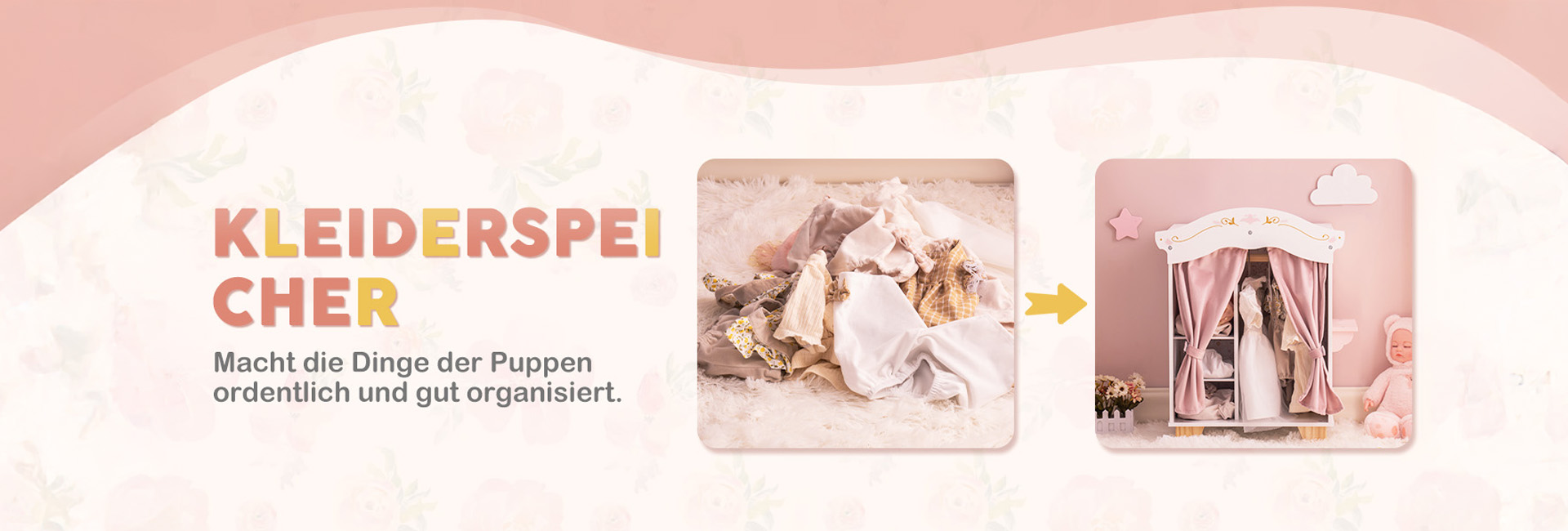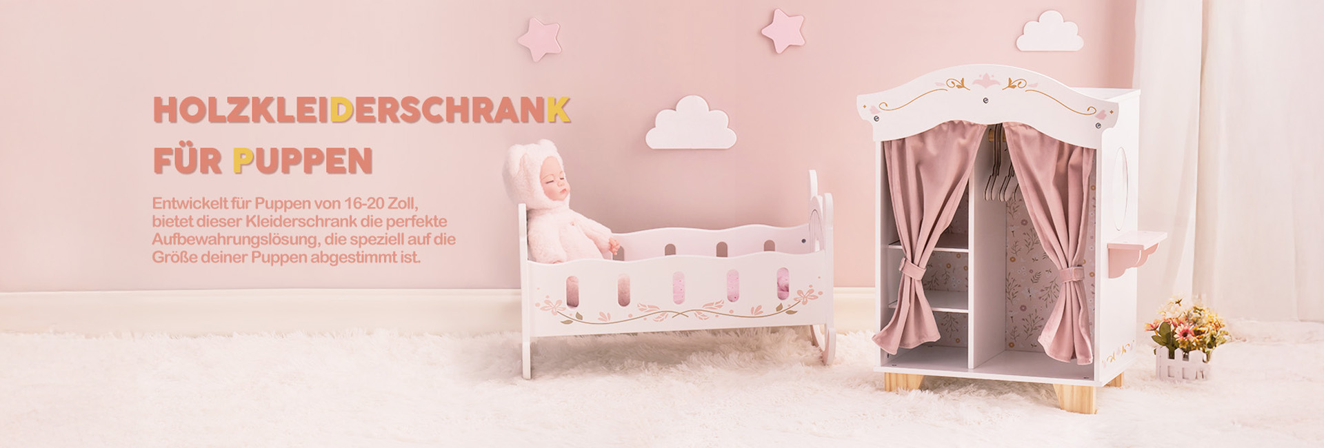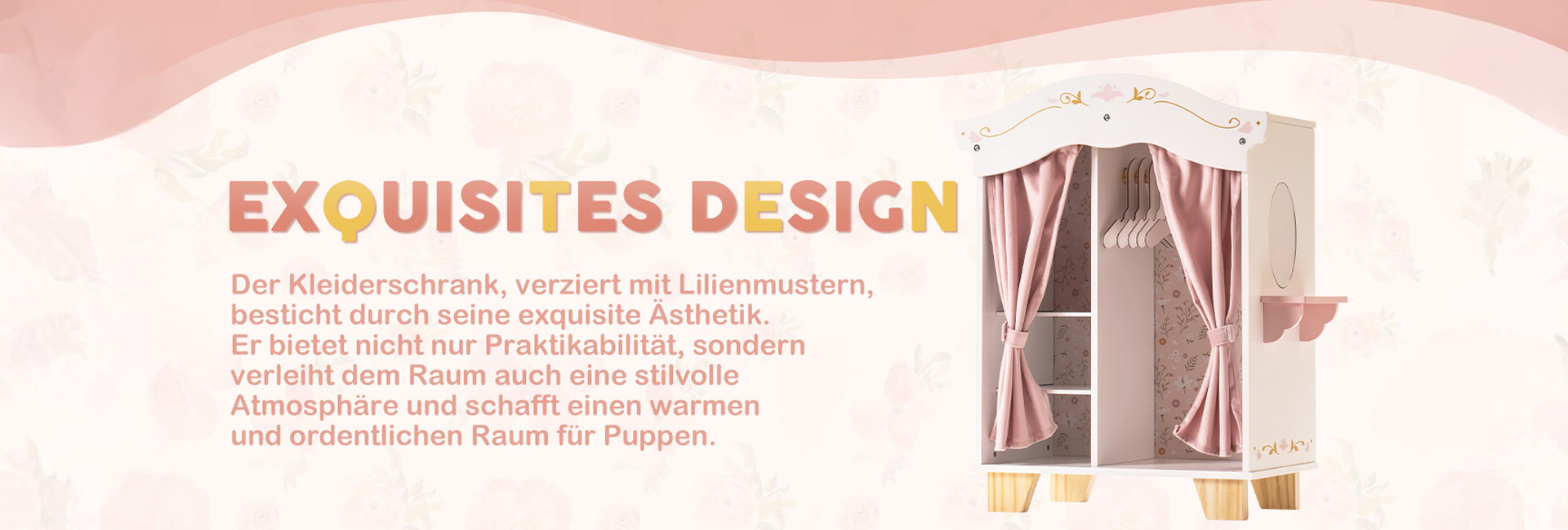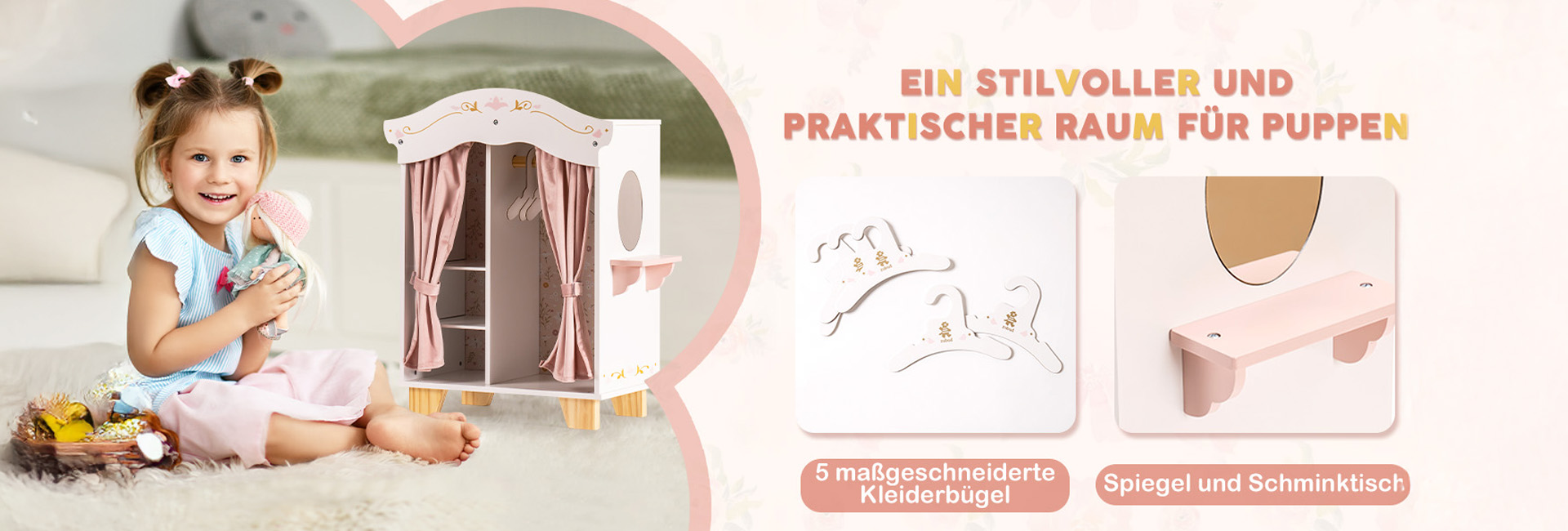 INTERAKTIVES ERLEBNIS: Es ist nicht nur ein Schrank; es ist ein Reich des Vergnügens für Kinder. Mit zart gestalteten kleinen Spiegeln und einem niedlichen Schminktisch an der Seite bietet der Puppenschrank den Kindern Freude am interaktiven Spiel, während sie ihre Kleidung organisieren.