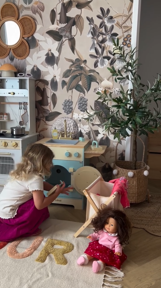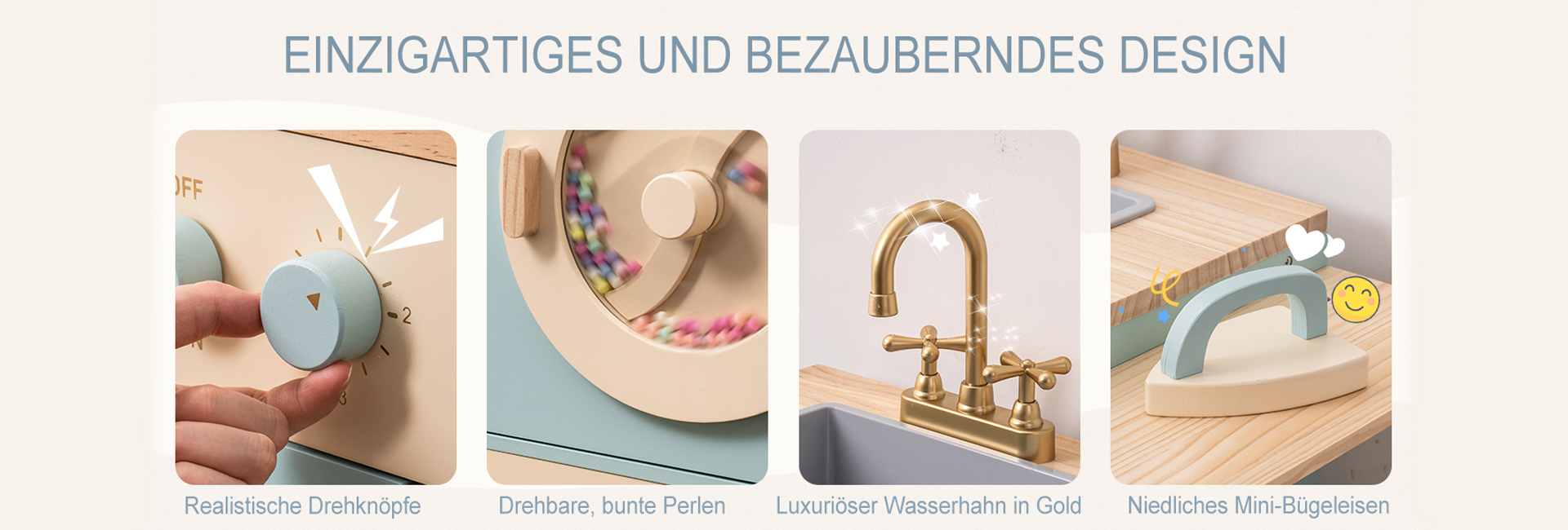 Das Spielküchen-Abenteuer verfügt über eine Bauernspüle mit drehbarem Wasserhahn, mit der Kinder spielerisch waschen und kochen können. Die Backofentür lässt sich leicht öffnen und gibt den Blick auf einen geräumigen Innenraum zum Backen und Braten frei. Die Ablagen und Haken sorgen für einen authentischen Touch und bieten Stauraum für Spielutensilien und Zubehör.